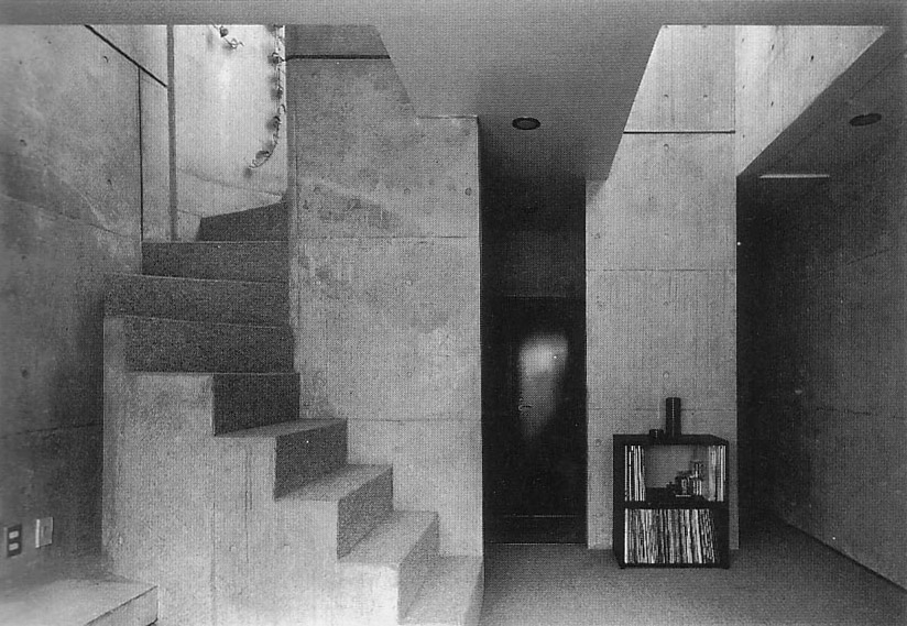 현관을 들어가서, 거실, 식당으로 이어지는 공간은, 「사(私)」 속의 「공(公)」 으로서, 외부의 노출 콘크리트 질감을 이어서 관입시켰다. 보이드 상부의 톱 라이트로부터의 빛이 무표정, 무언(無言)의 콘크리트 벽의 양감(量感)을 부드럽게 하도록 하였다.