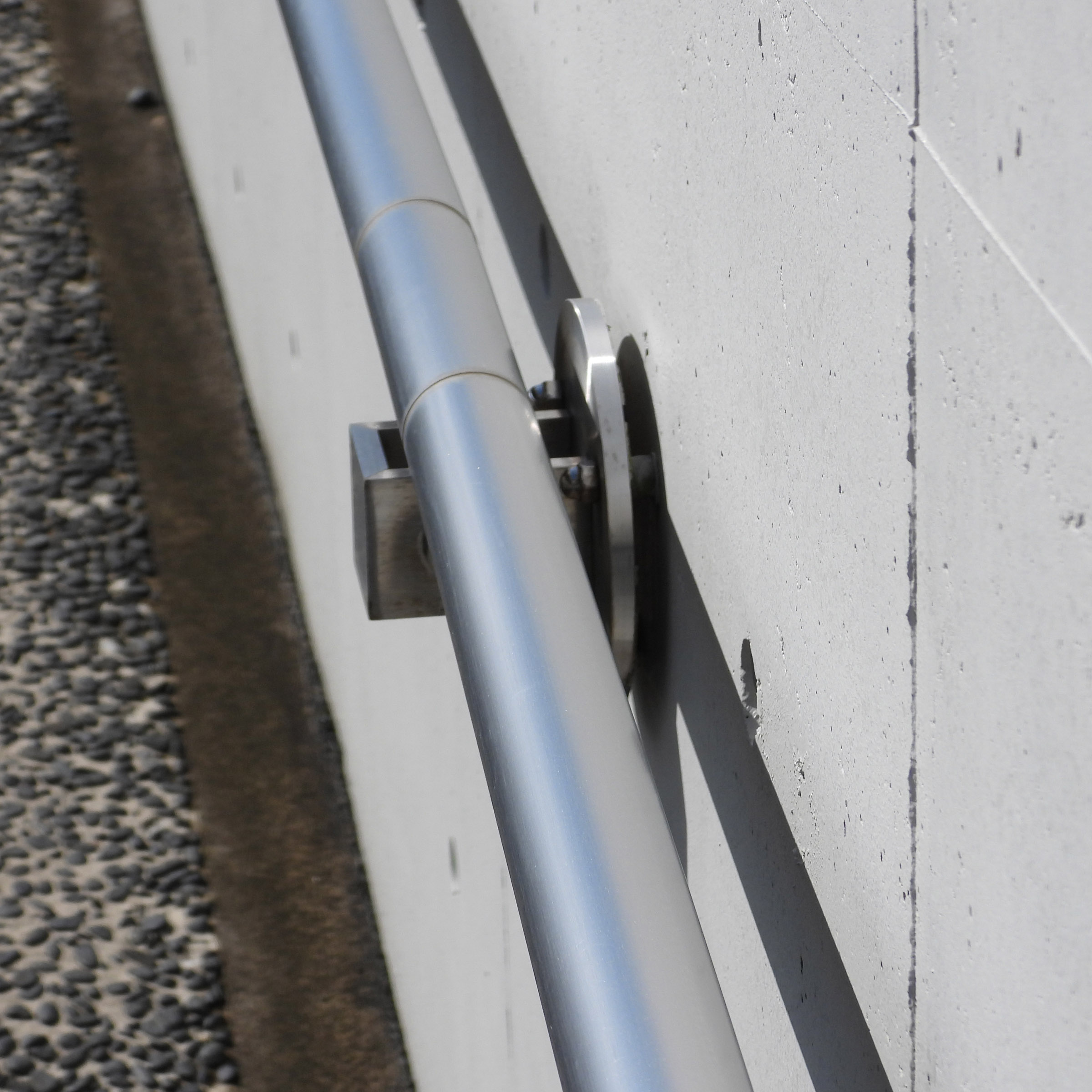 그 배경에의 세측에는 완만하게 완곡하는 길이 146m의 독립한 콘크리트 벽.