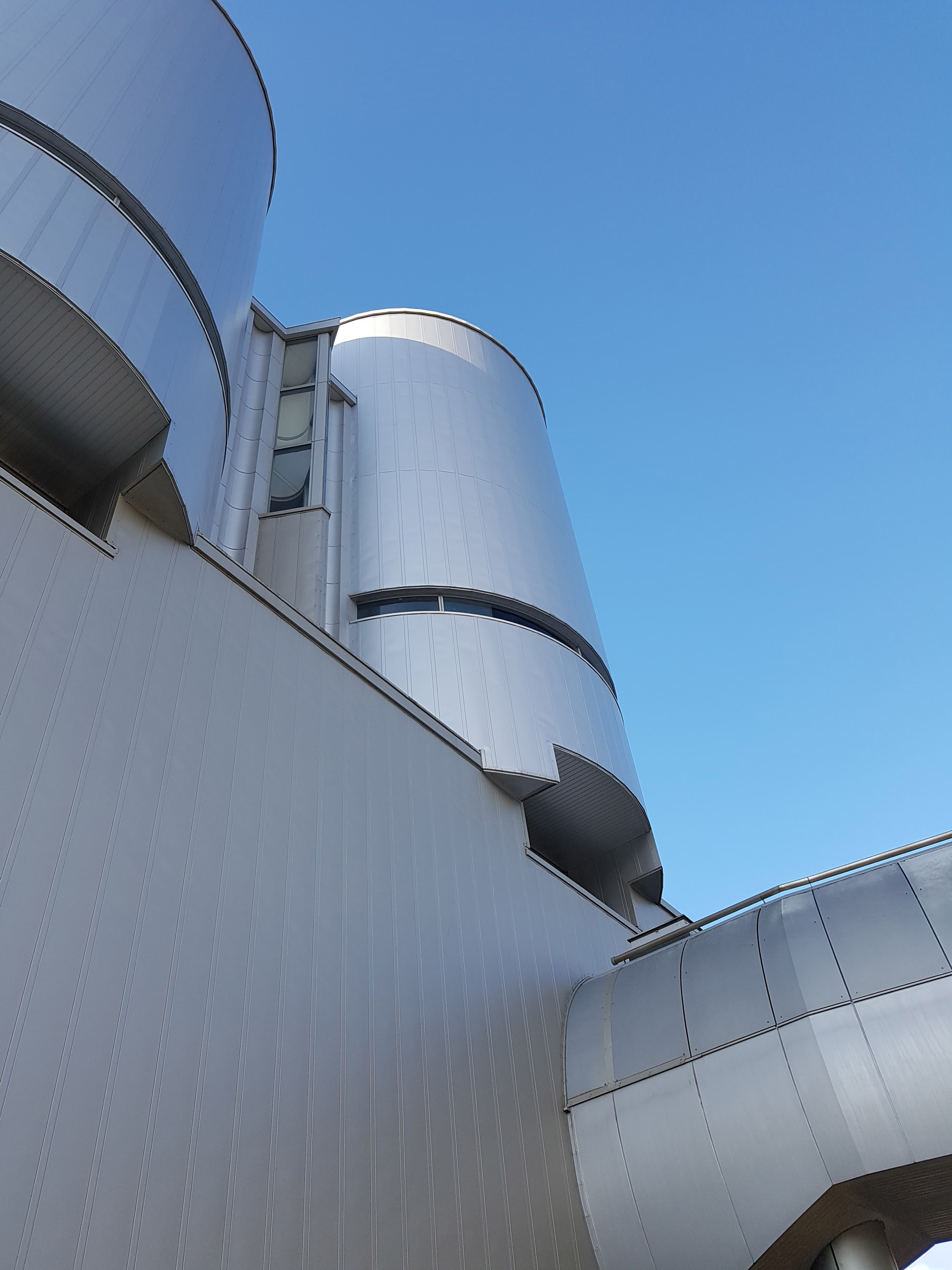 실린더 하부의 슬릿한 창문은 욕탕에 몸을 담갔을 때 바깥 전경을 바라볼 수 있는 위치라고 한다. 외벽 마감은 t=2mm 알루미늄판.