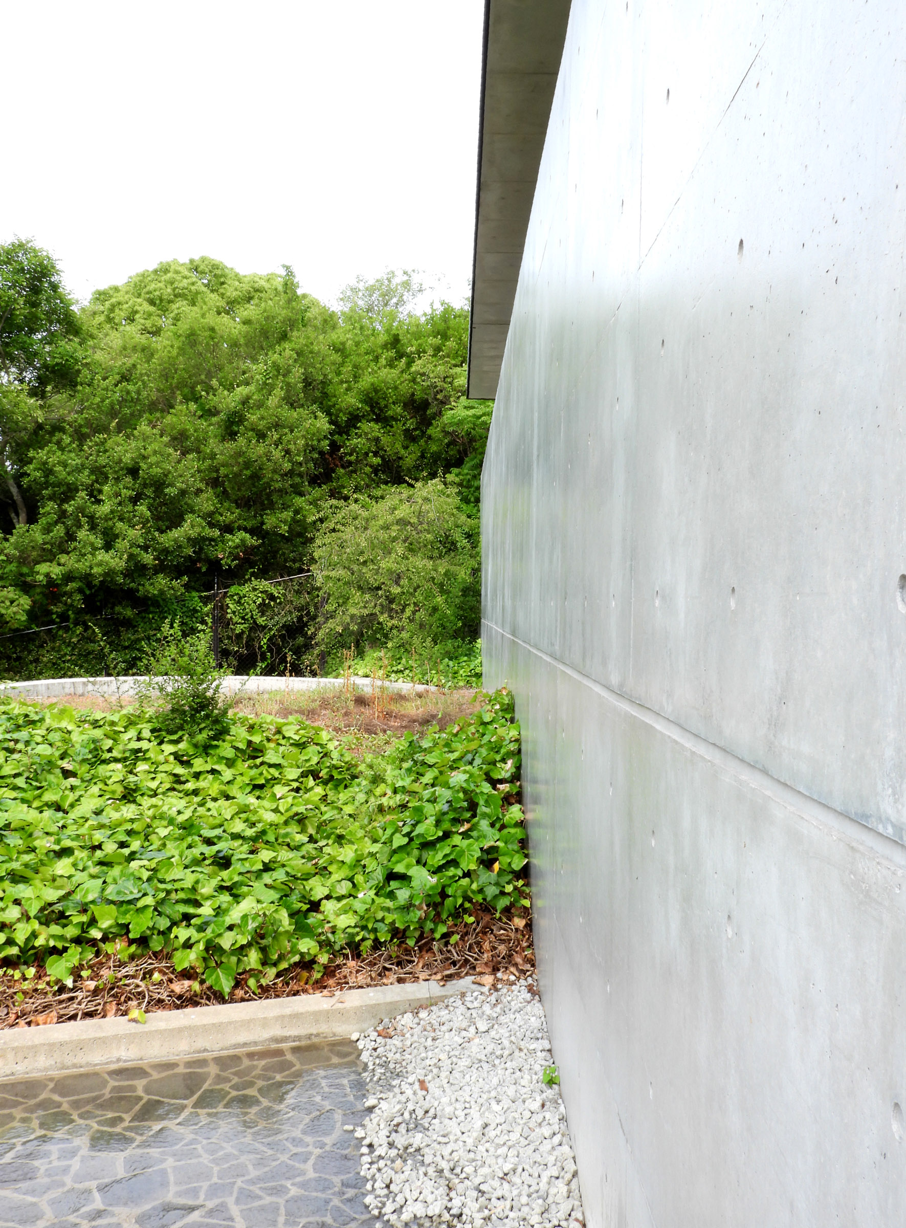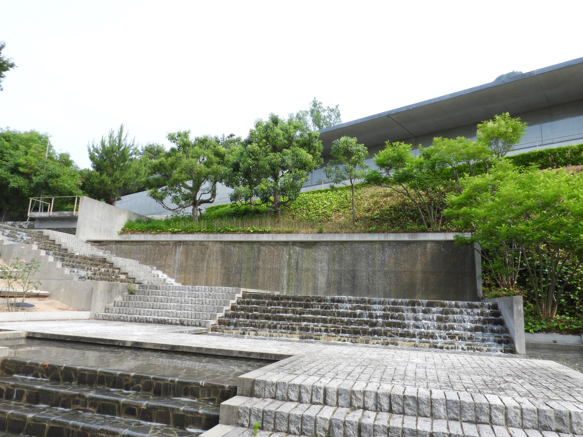 관람을 마치고 마지막에 갤러리의 문을 열고 밖으로 나오면 갑자기 조용하던 주위가 계곡을 흐르는듯한 물소리로 가득차는데, 고개를 돌리는 순간 눈 앞에 펼쳐지는 계단식 인공 폭포 정원(수경정원水景庭園)은 시코쿠 갤러리의 가장 큰 특징이라고 할 수 있다.