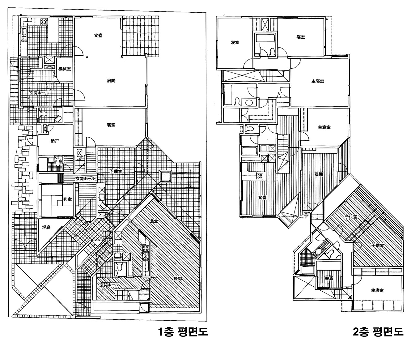 두 건물 사이의 외부통로는 현관에서 정원으로 슬쩍슬쩍 보일 수 있도록 비스듬하게 계획했는데 그것이 평면계획상의 제약이 되버려, 개실이나 물을 사용하는 실이나 설비등을 계획하는데 꽤나 힘들었다.