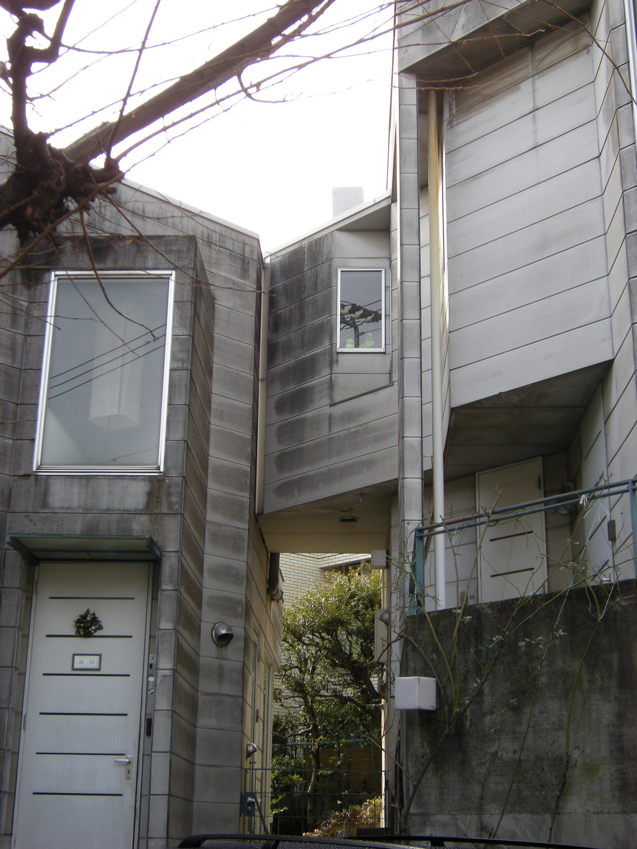즉, 임대부분을 안쪽에, 도로측에는 형의 가족이, 중간에는 부모님과 남동생의 주호를 배치해 전체를 L자형으로 하여, 정원을 서로 공유하는 동시에, 서로의 주호사이에 외부통로를 설치해서 현관측과 정원을 연결하였다.