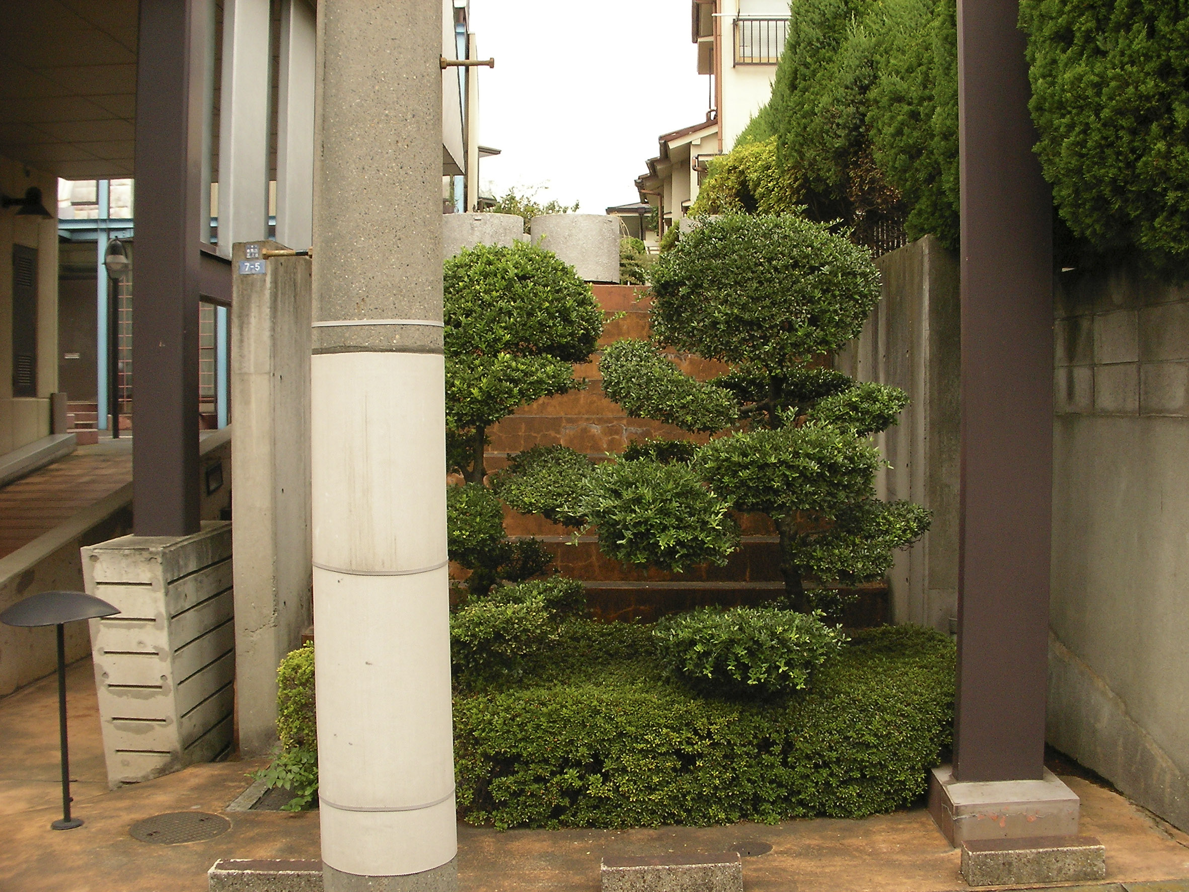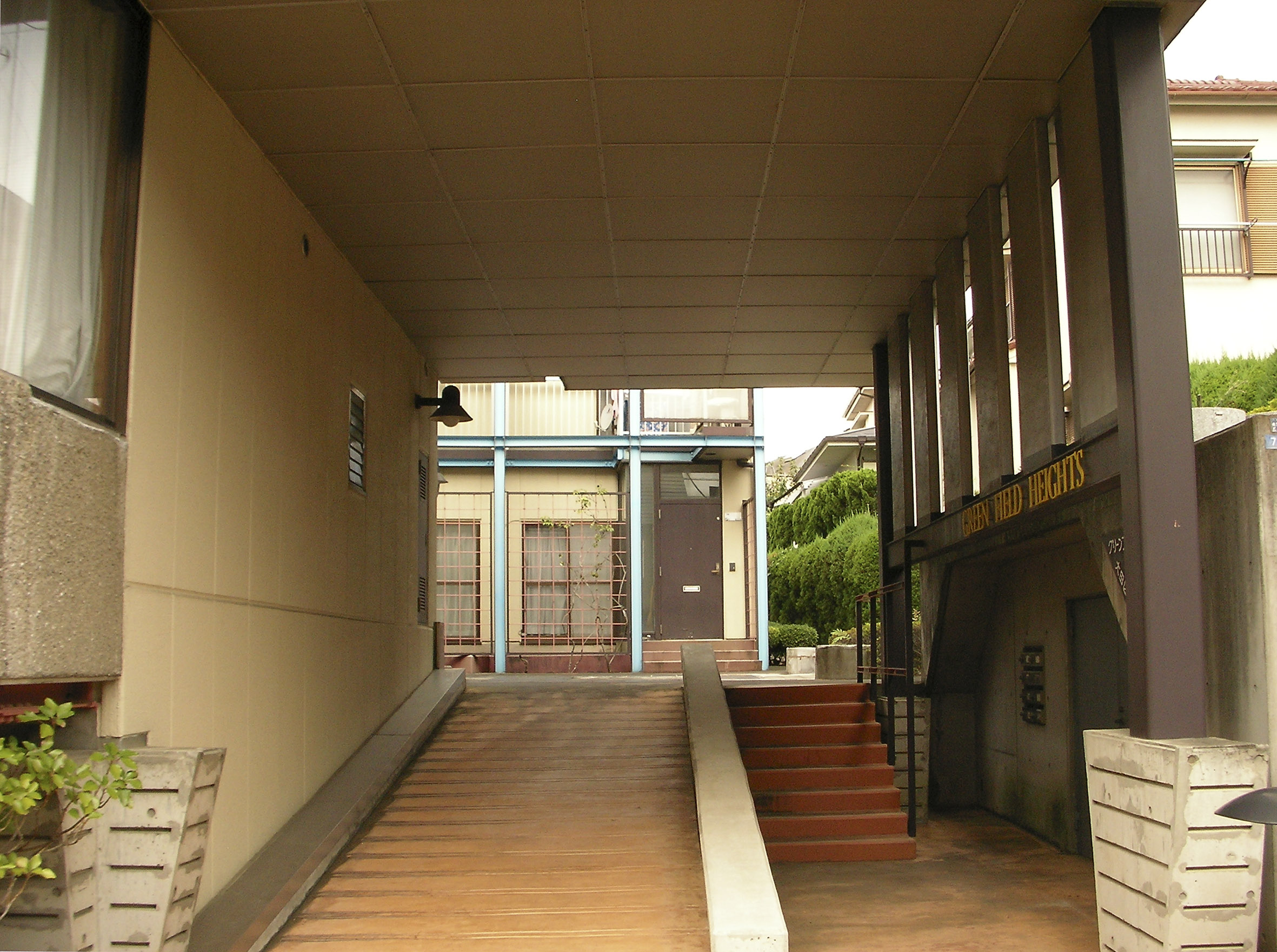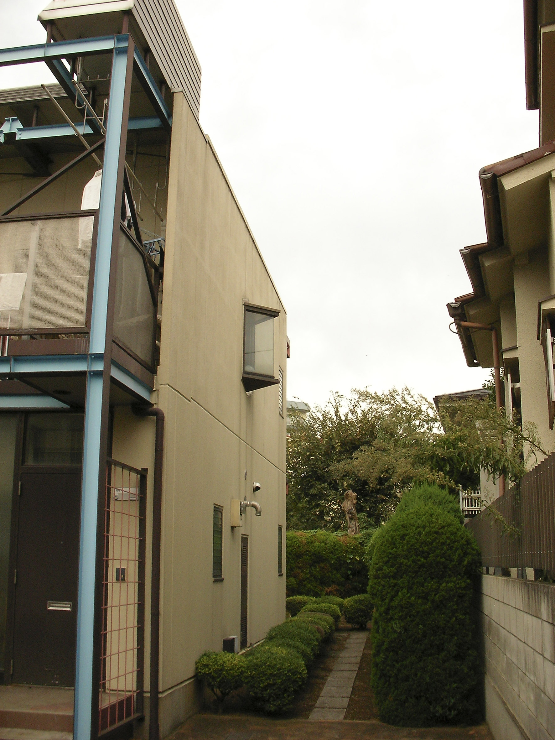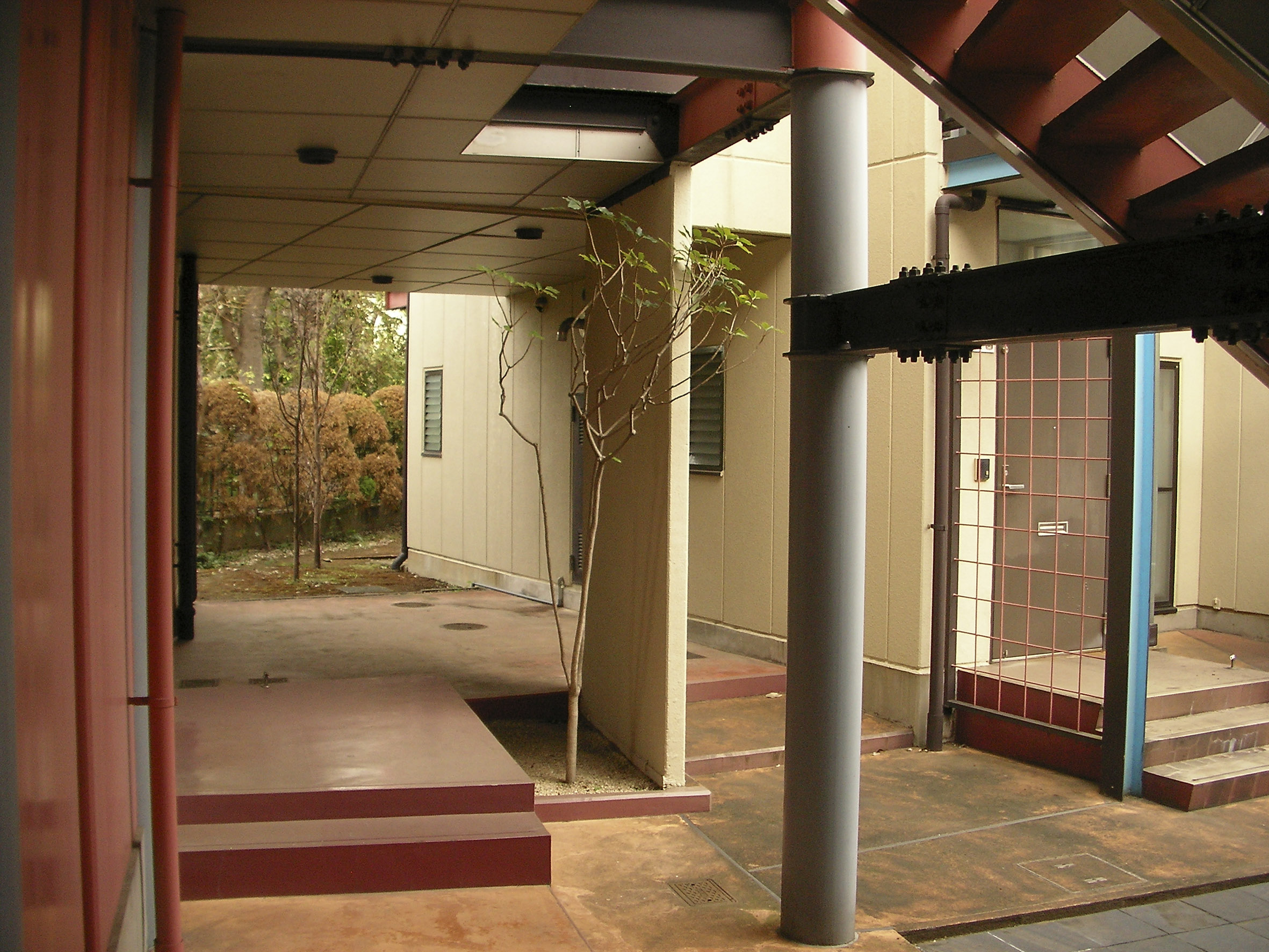 외부 가로에서 중정(中庭)으로는 필로티(ピロティ) 부분을 통해서 진입하며, 도로로 부터 얼핏얼핏 보여지는 중정은 도로측의 조심스러운듯한(控え目な) 억제된 외관과는 대비적으로 다양한 색상을 사용하여 약간 호기심을 불러일으키는 듯한 분위기(不思議な空間)를 연출하였다.