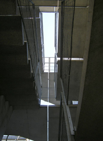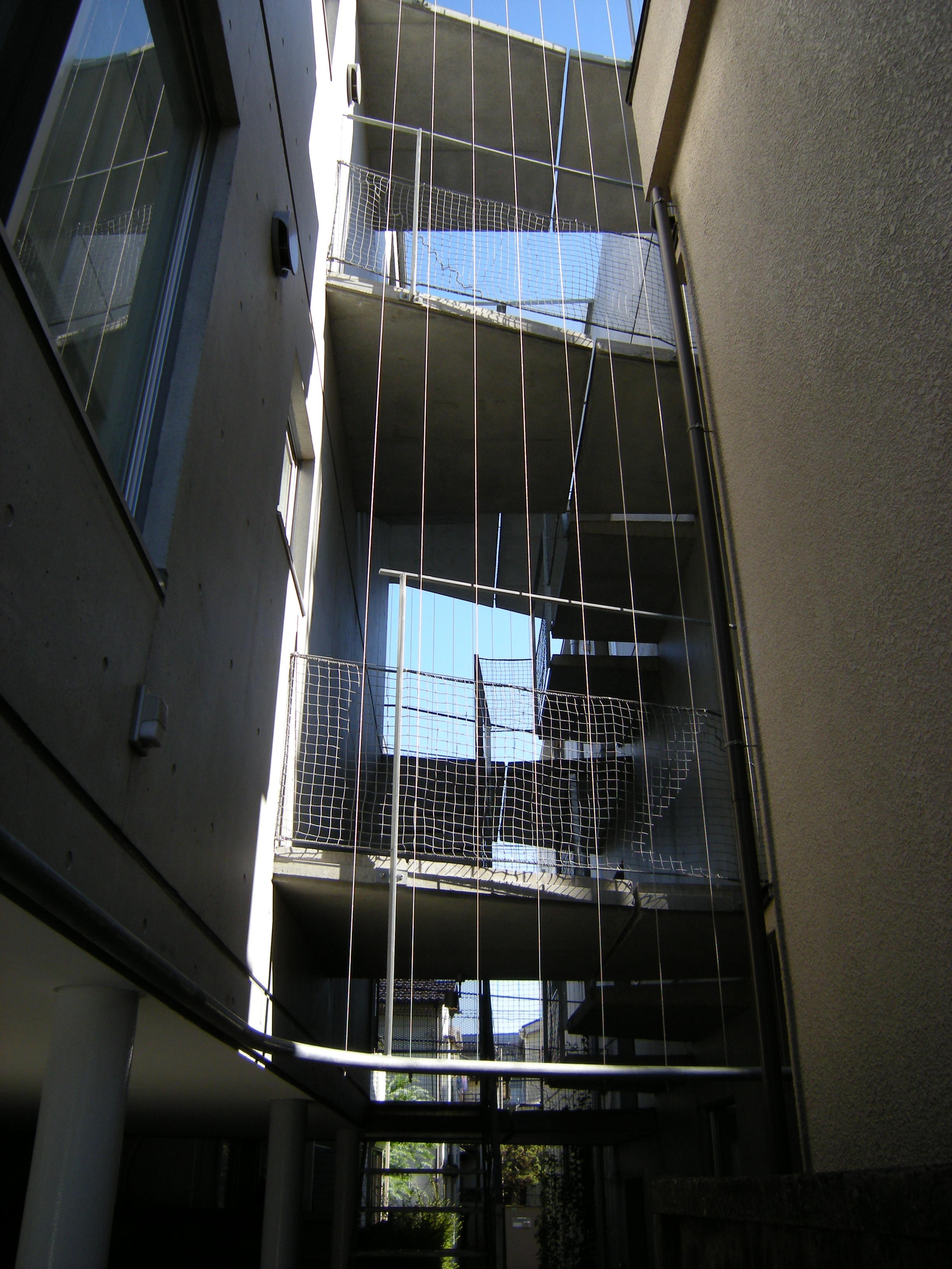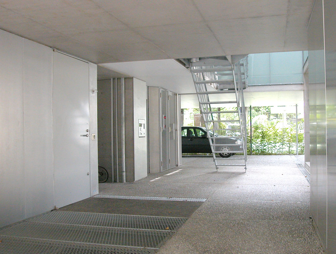 한편, 외부계단, 외부복도, 발코니는 철근 콘크리트로만 만들어져, 사각형의 건물의 볼륨에서 처마와 같이 얇게 내밀어져 있다.