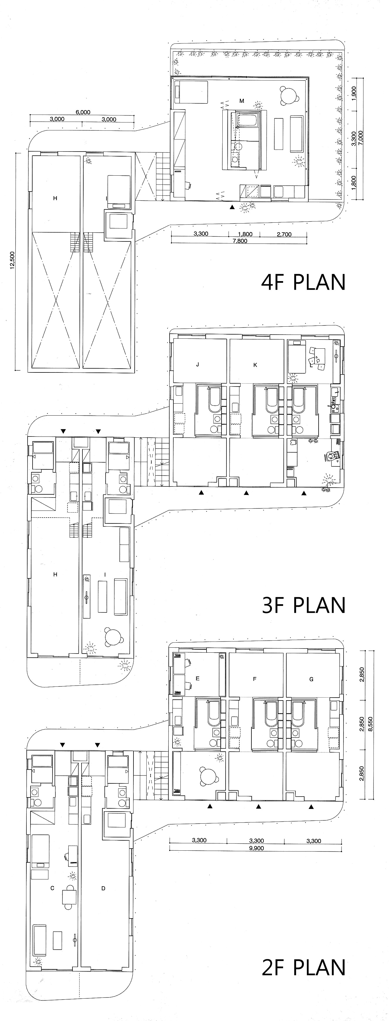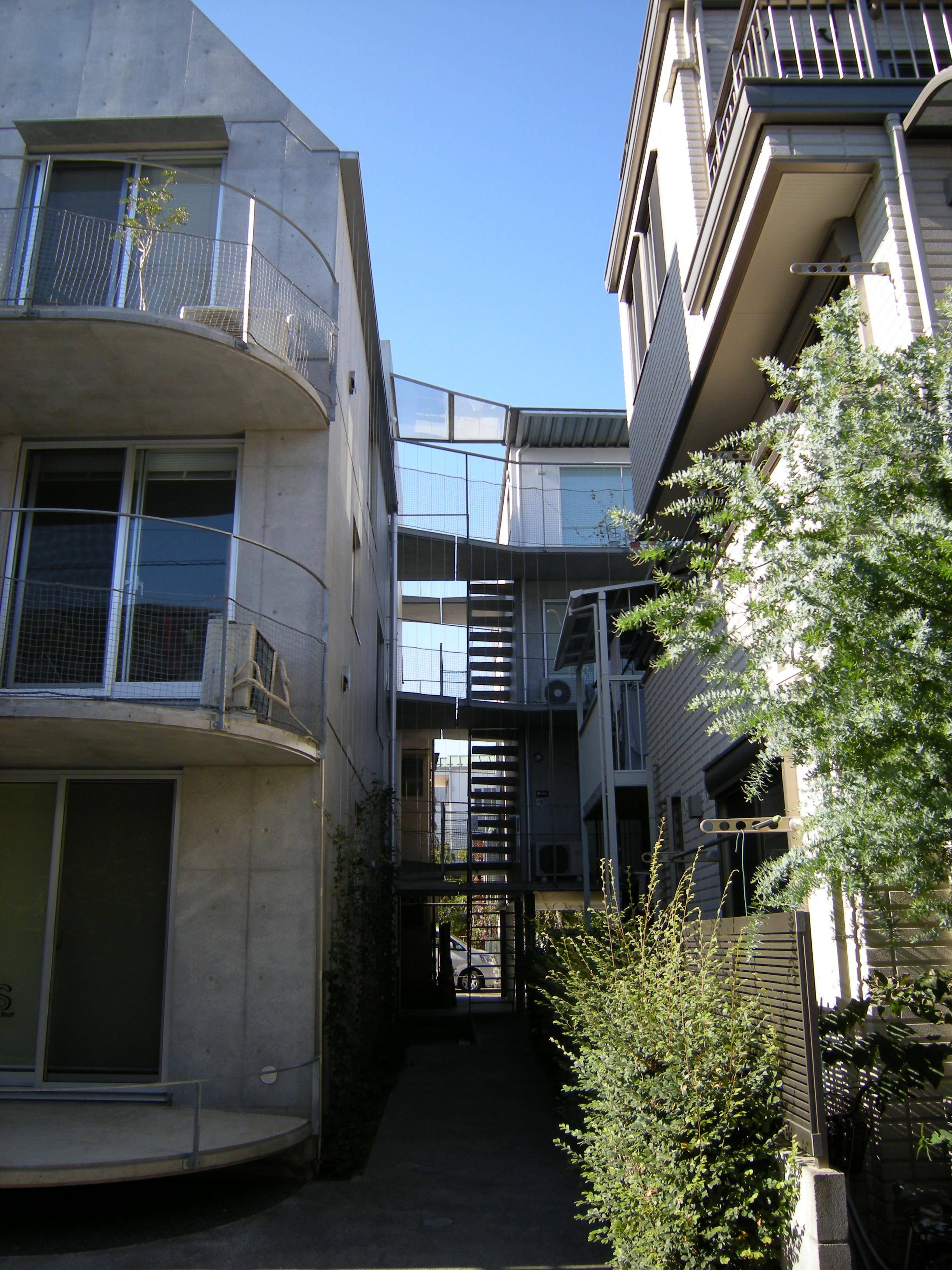 모든 주호는 공도에 면하며, 2방향으로부터 진입이 가능한 접지(接地) 타이프, 길게 늘어진 원룸 타이프, 욕실부엌(水回り)에 의해 공간이 둘로 나뉘어진 타이프, 오너 주호인 펜트하우스 등, 부지의 폭과 깊이, 각각의 프로포션(proportion)에 의해 형상이 다른 주호들이 만들어졌다.