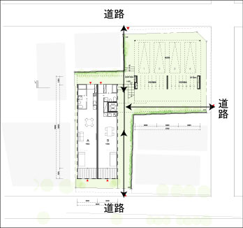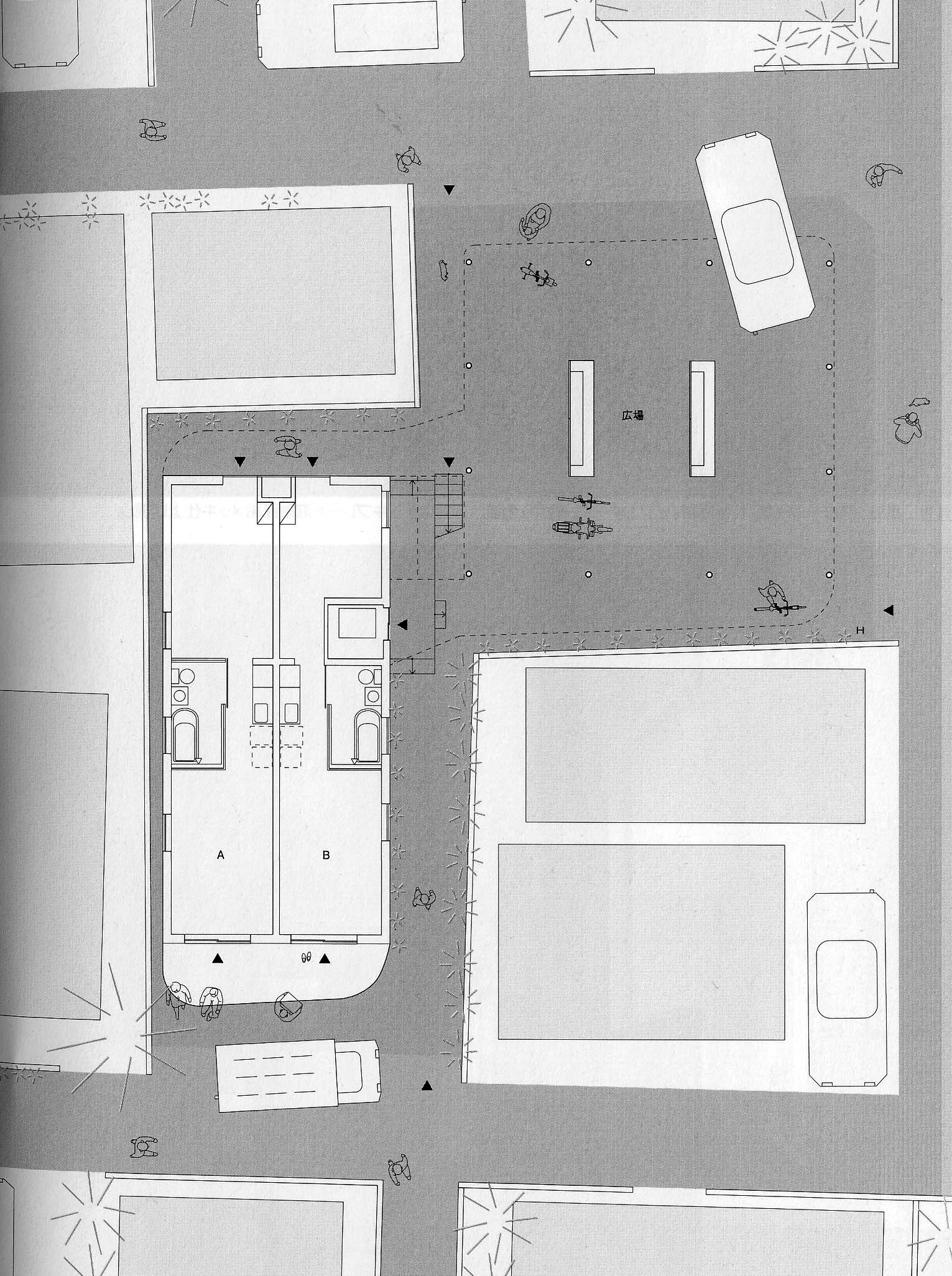 동남, 북서 배치에 의해, 동서의 공도(公道)를 연결시키는 <길(みち)>이 부지 내에 만들어지고, 모서리에 있는 건물을 필로티로 띄워 지붕이 있는 <광장>도 만들어 졌다.