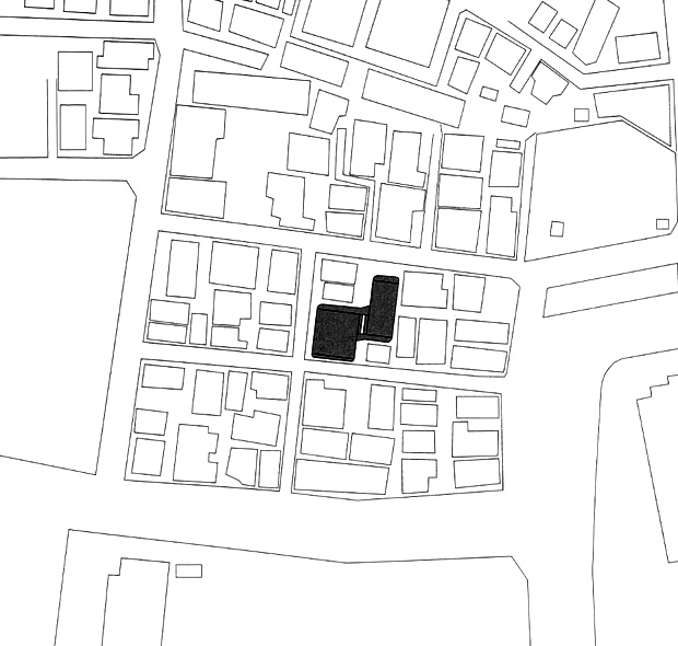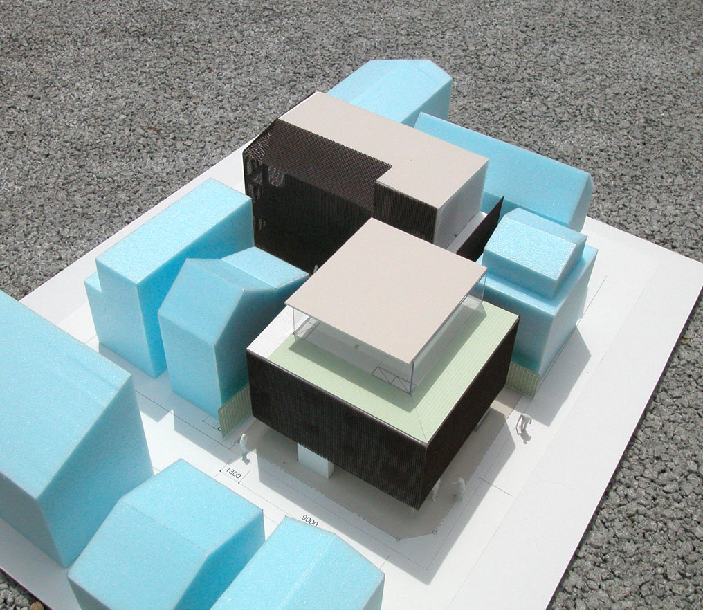 불규칙한 모습의 부지이기 때문에, 인접 건물도 적극적으로 참가시켜 사잇공간(隙間)을 만들 수 있는 동시에, 주동을 분절 하였기 때문에 주위건물의 볼륨, 밀도와 거부감없이 조화를 이룰 수 있었다.