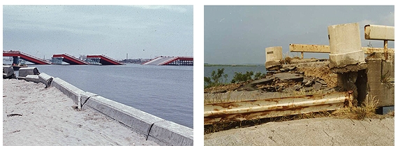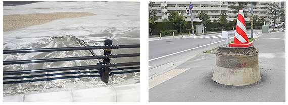 <하천 주변 등의 액상화가 광범위로 발생하여, 지반이 옆으로 이동(측방유동(側方流動))하여 교량등이 파손되기도 한다.>