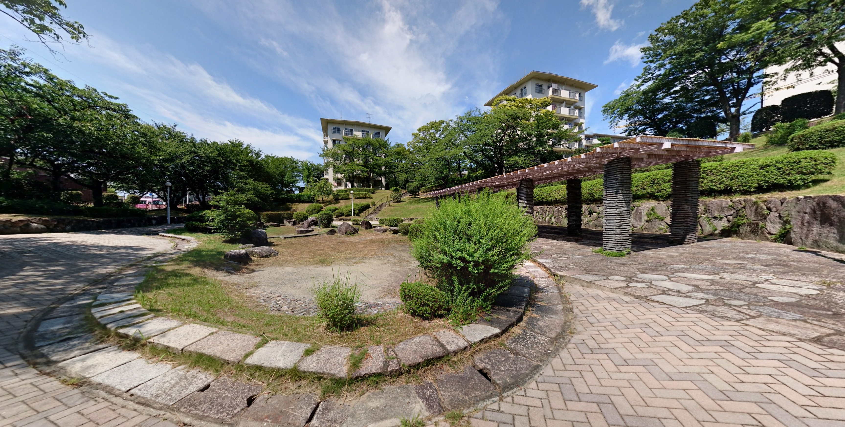 서측에서 동측으로 완만하게 오르는 경사지의 특징을 단지설계시에 고려하여, 원칙적으로는 평행배치의 대규모 단지이면서도 박스(BOX)주동(住棟), 기러기떼 모양(雁行)의 주동, 필로티의 효과적 사용 등에 의한 랜드스케이프를 실현했다.