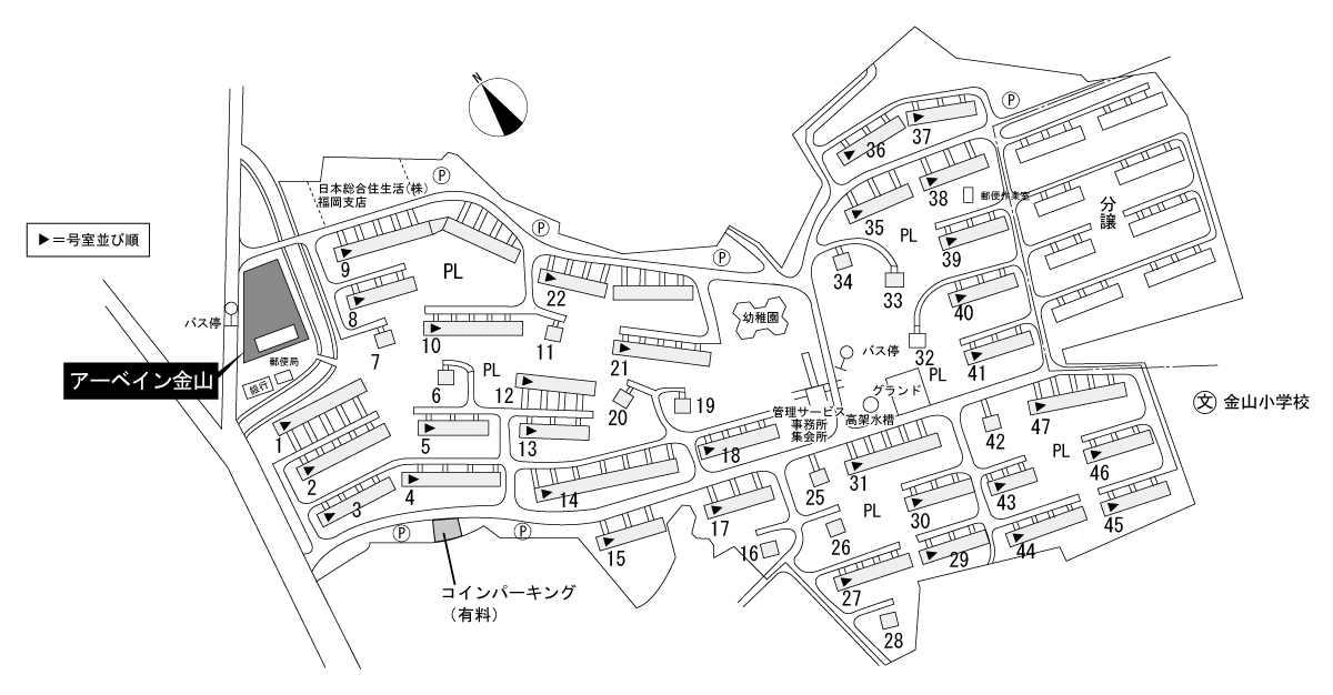 후쿠오카시 텐진(福岡市 天神)에서 남서방향으로 약 5㎞ 떨어진 구릉지에 위치하는 임대 및 분양 맘모스 단지다. 단지 서측끝의 지하철 나나쿠마선 카나야마역(地下鉄七隈線 金山駅)에서 도보1분거리.