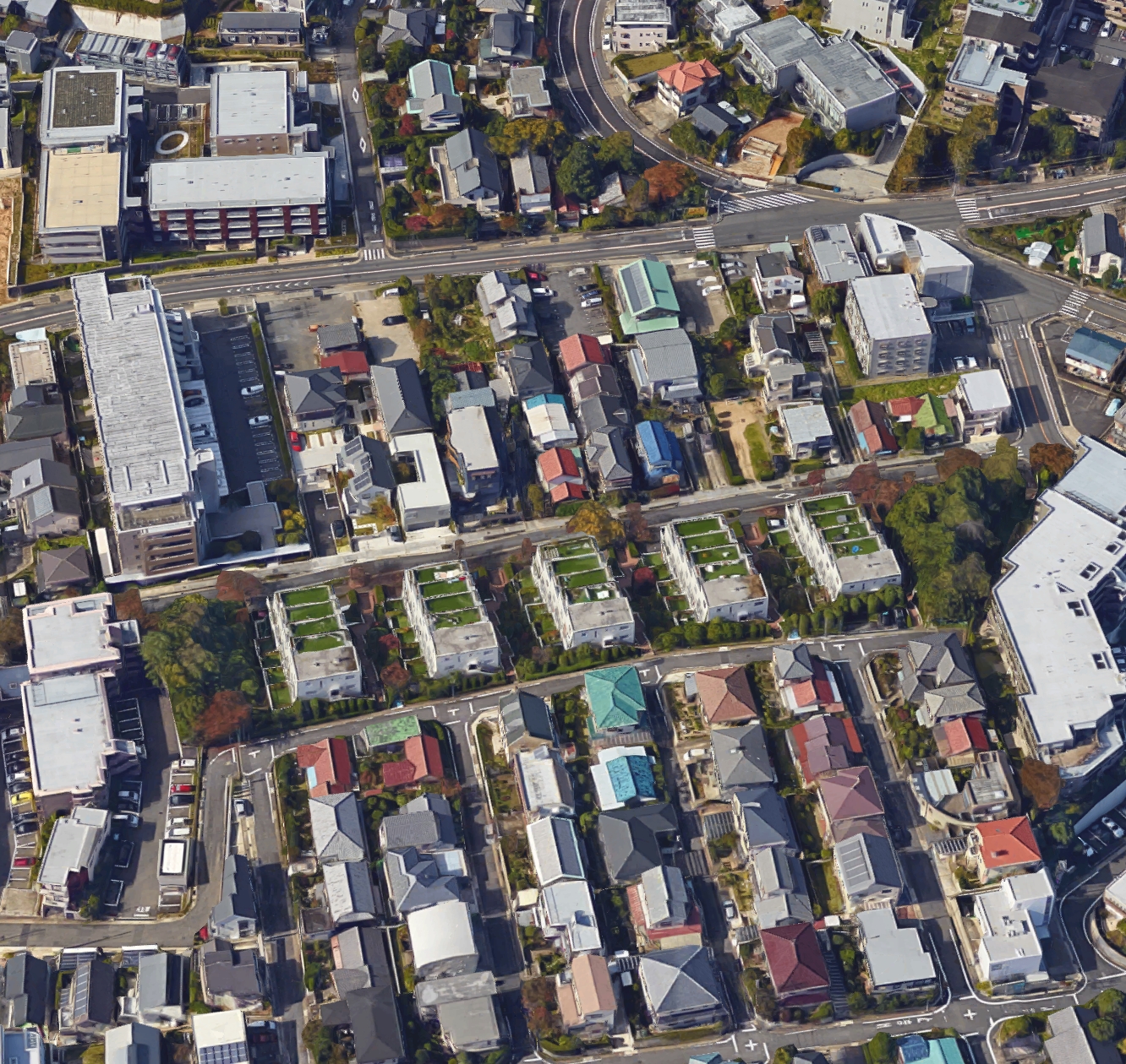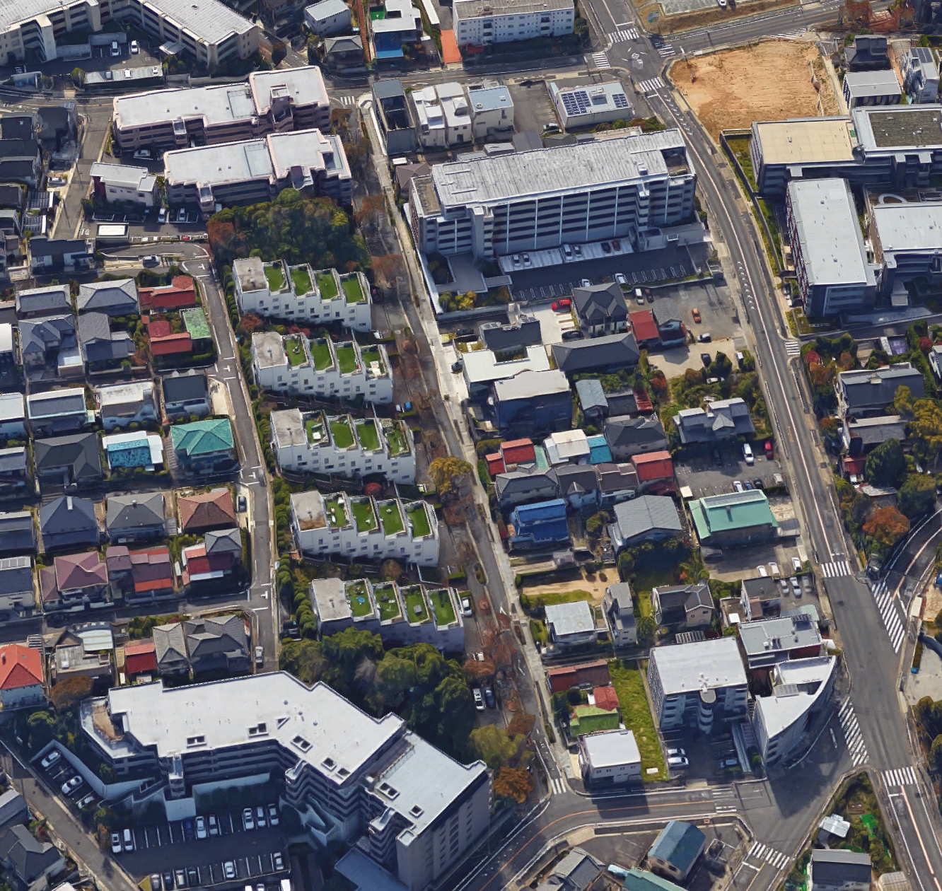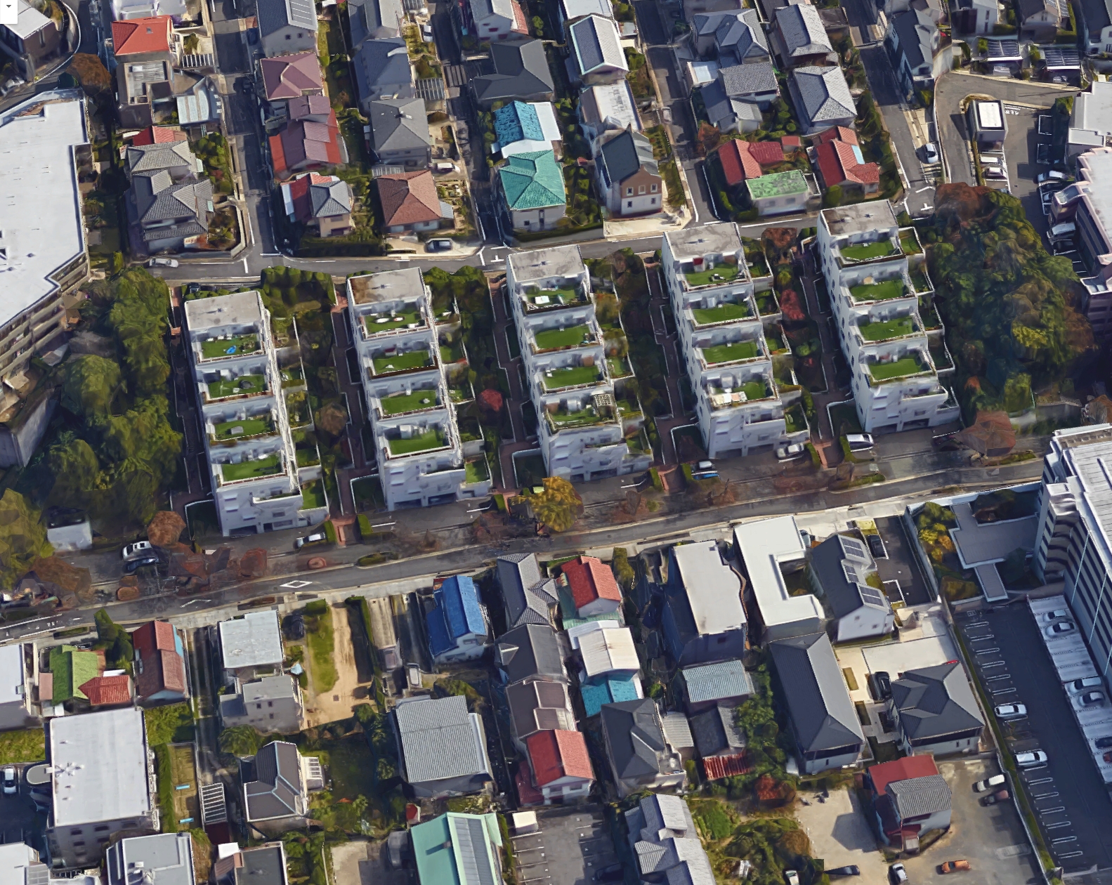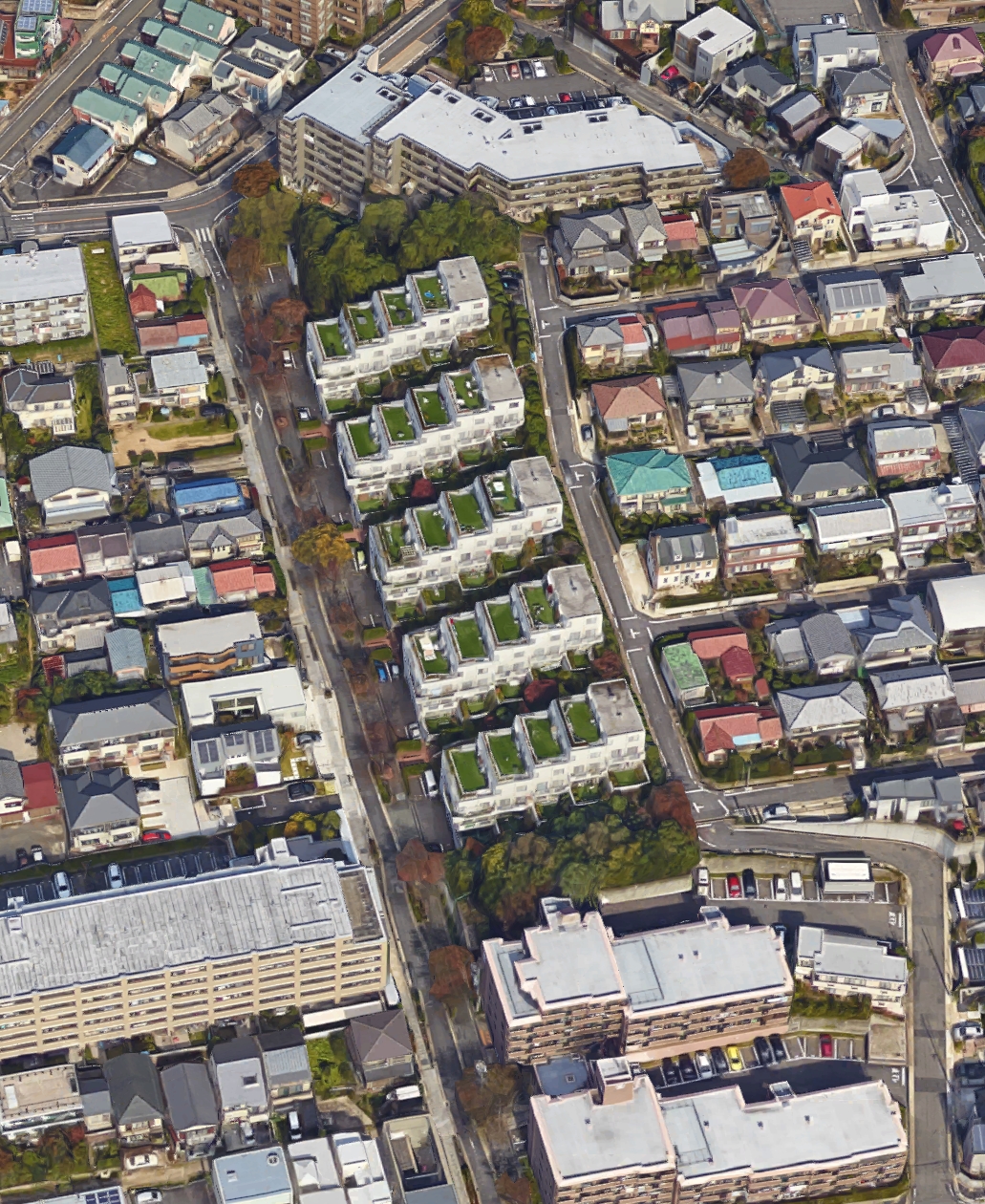 서측으로의 급경사인 지형을 고려하여, 3층 높이의 주택을 1층씩 수직으로 셋백시키면서 5단의 단상(壇状)블록으로 배치하였다. 윗 층 주호에는 옥상을 이용한 테라스, 아랫 층 주호에는 남면의 인공 정원을 설치하였다.