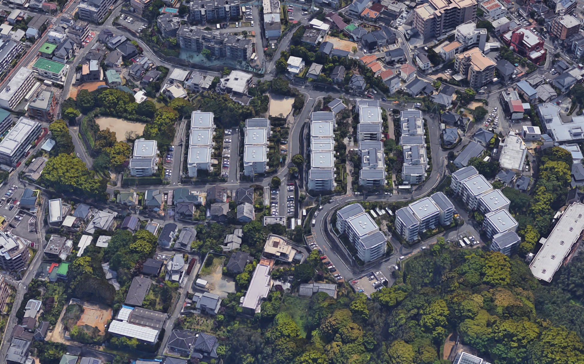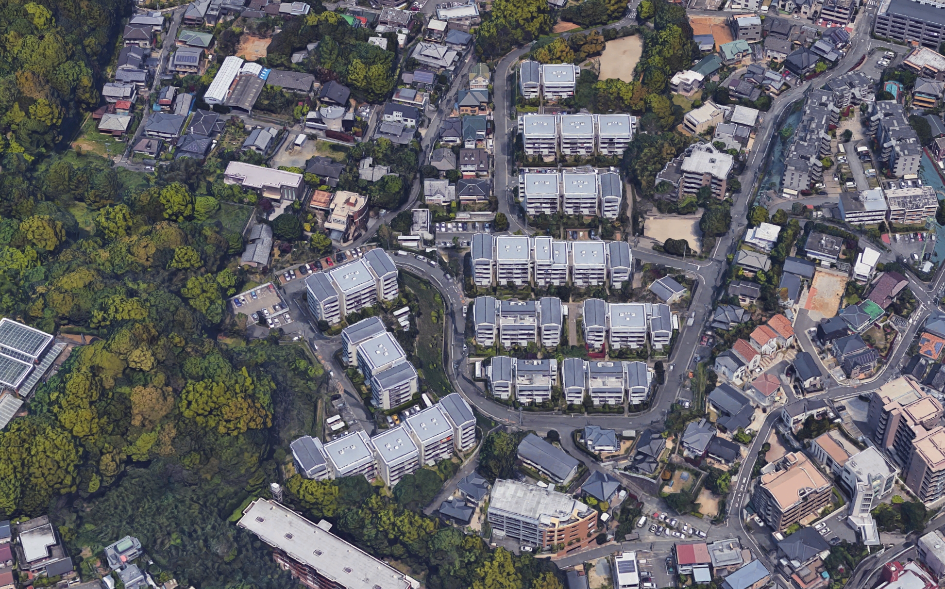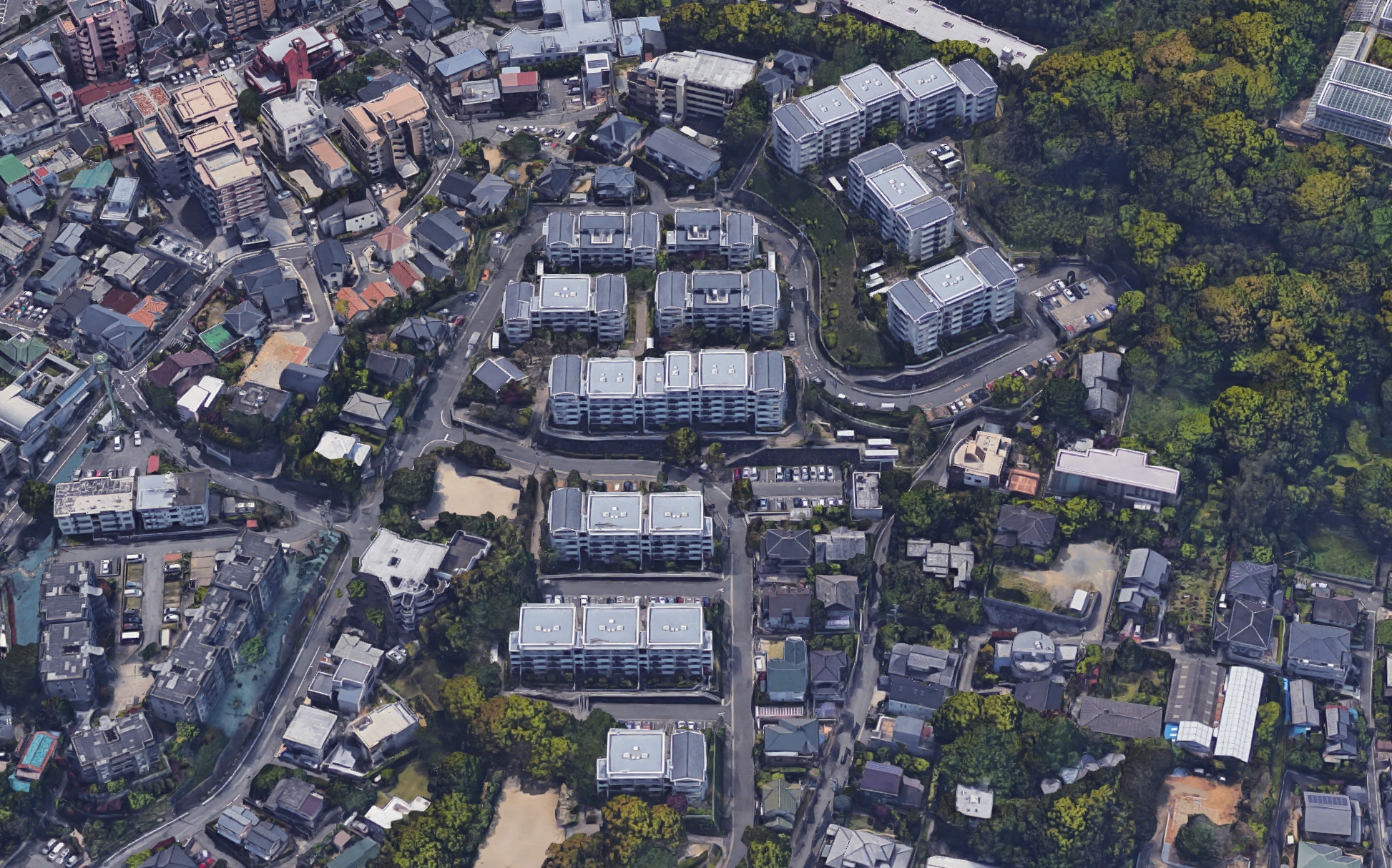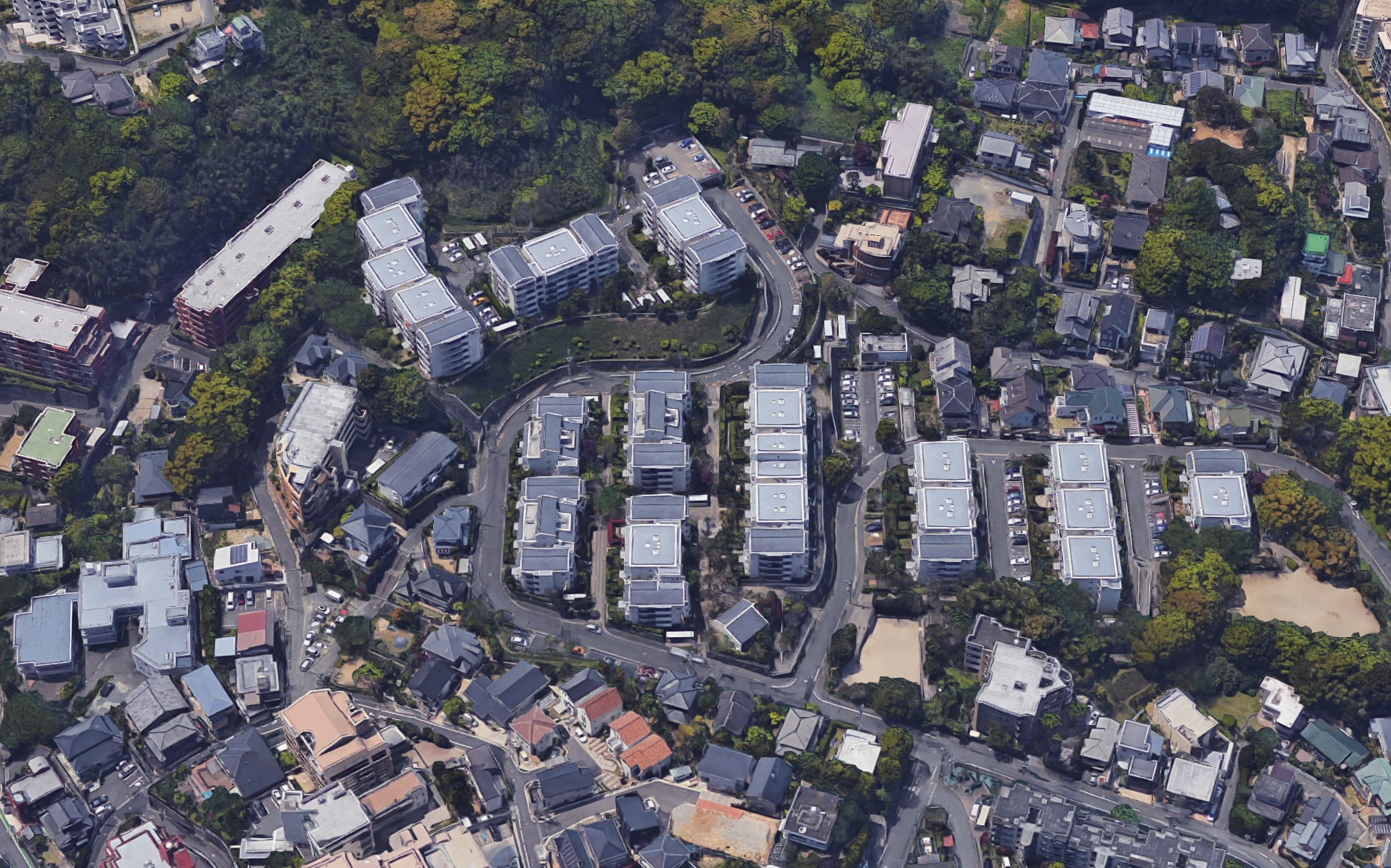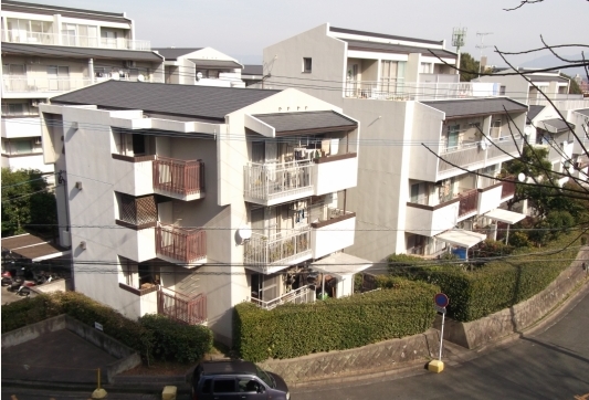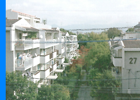 주변 지역의 단독주택군의 주거환경과 스케일을 고려한 구배(勾配) 지붕을 가진 중층(中層)주동이 경사지의 부지 지형을 살려 단상(雛壇状)으로 배치되어, 연속성있는 주택지 경관을 만들어내고 있다.