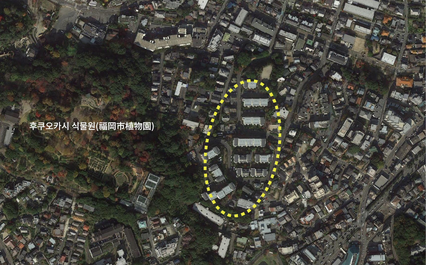 후쿠오카(福岡)의 유명한 고급 주택가의 12만 그루의 수목을 자랑하는 식물원(후쿠오카시 식물원,福岡市植物園)에 인접한 분양 단지.