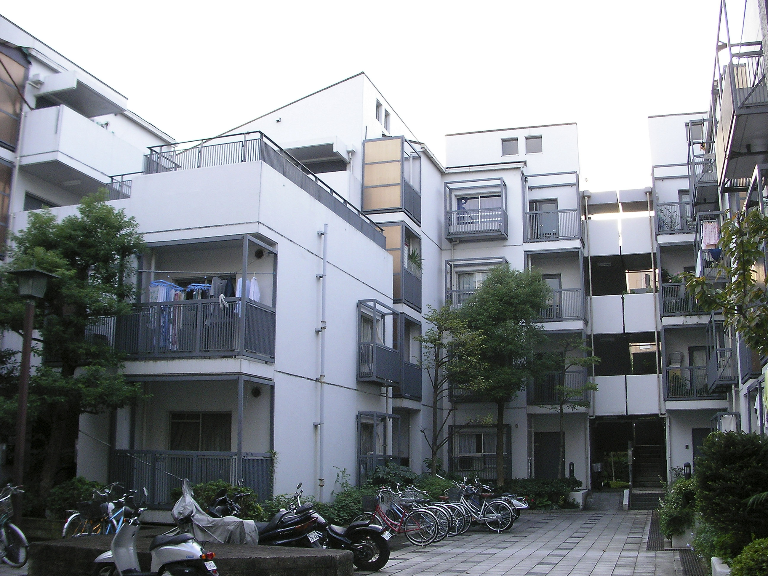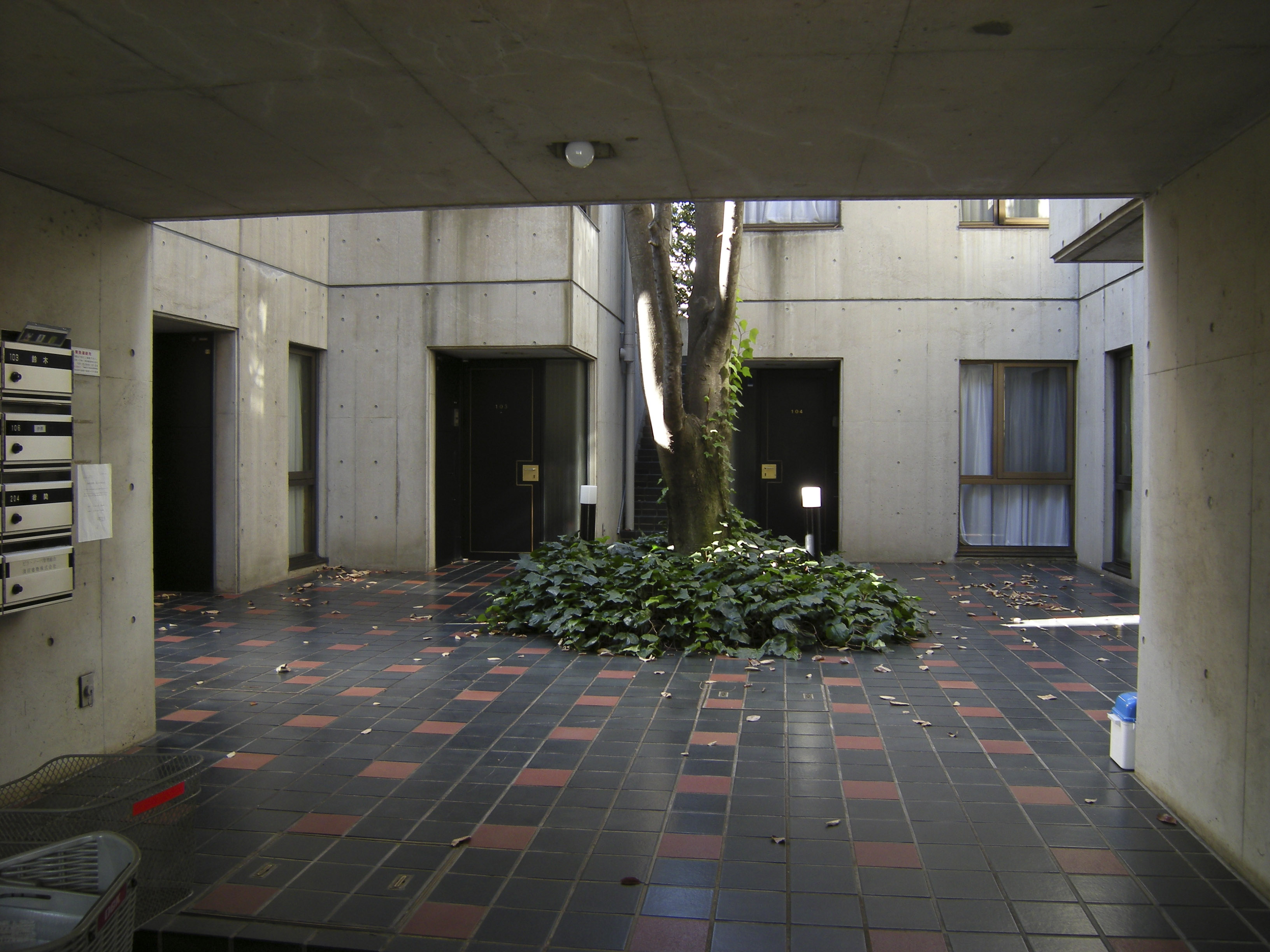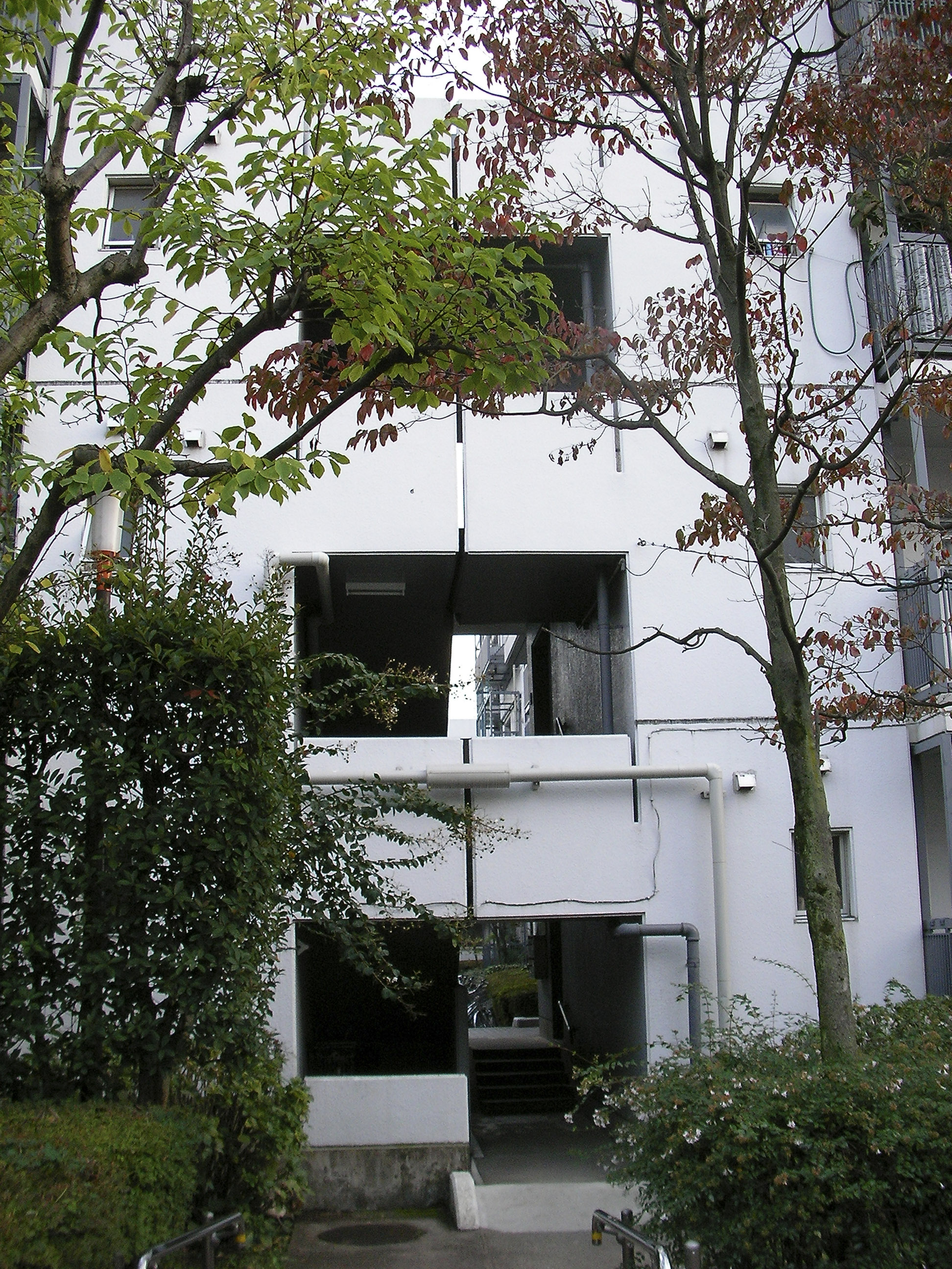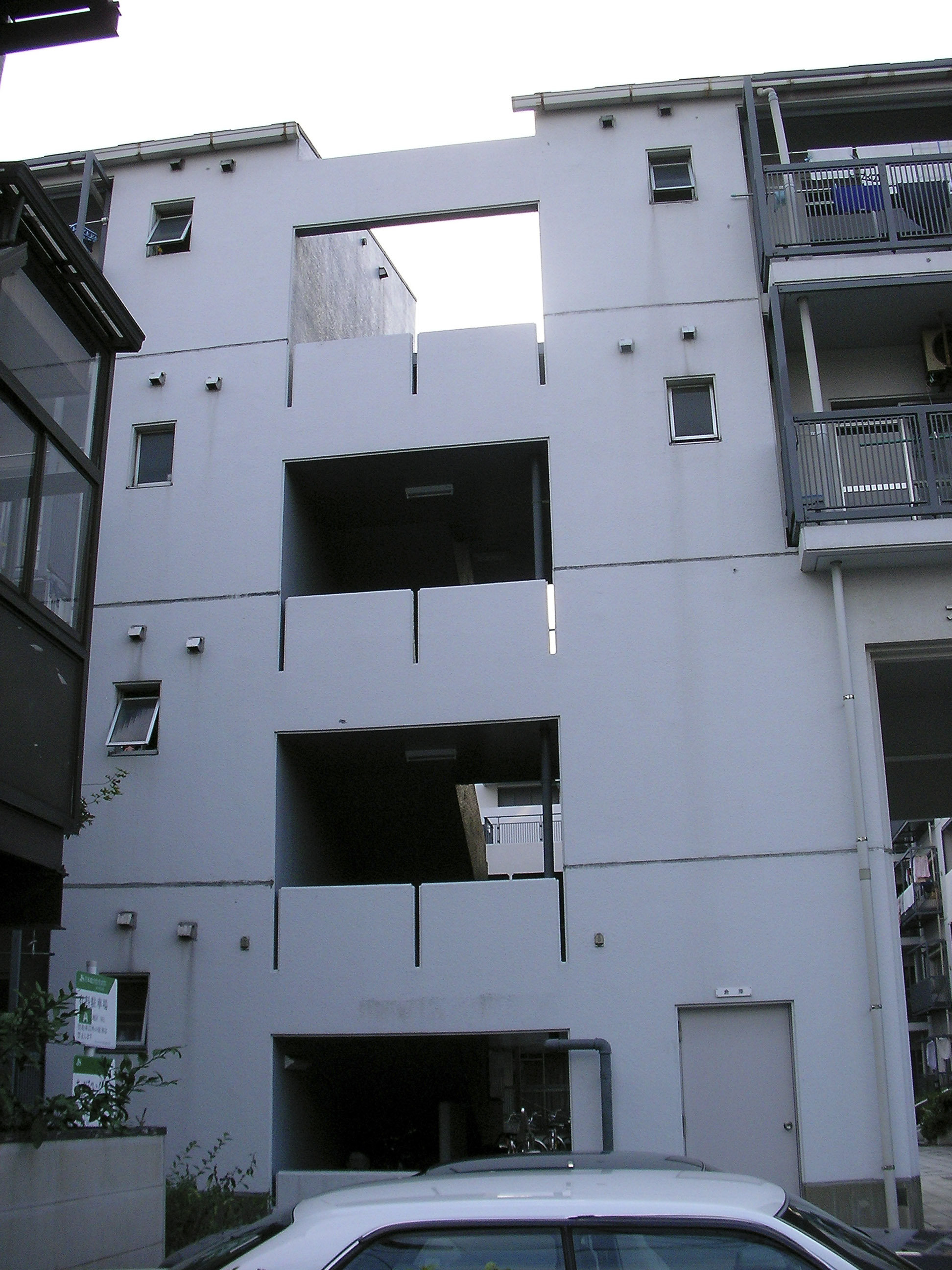 전술한 빌라 시리즈에서도 시도했던 수법의 연장선으로서, 이러한 형태에 의해 상층부의 주호까지의 어프로치를 미니가로화(ミニ街路化), 중첩된 로지(路地≒골목길)공간으로서 중정 공간과의 관계성을 강화시켜, 외부공간으로서의 개방성을 높혔다.