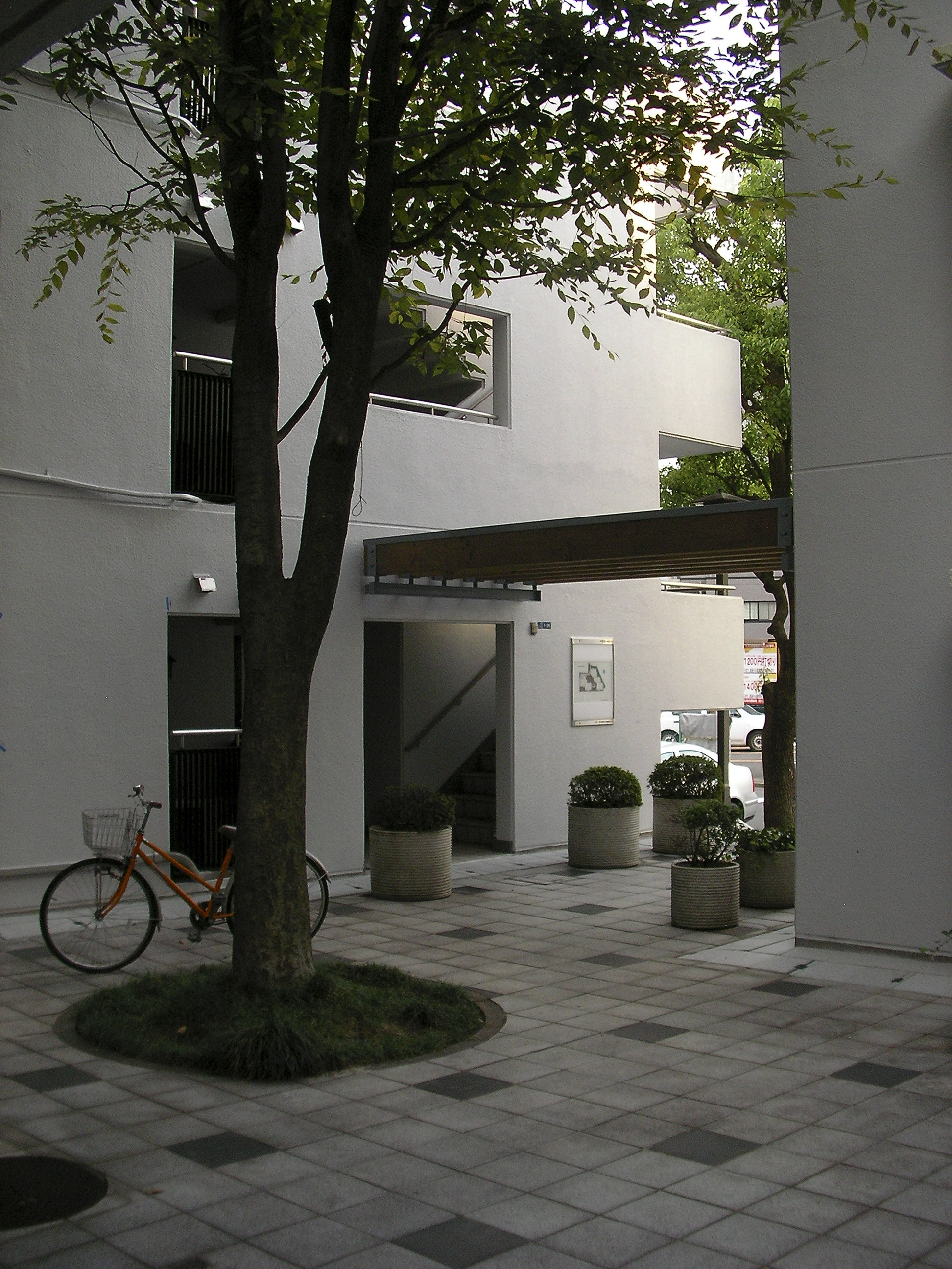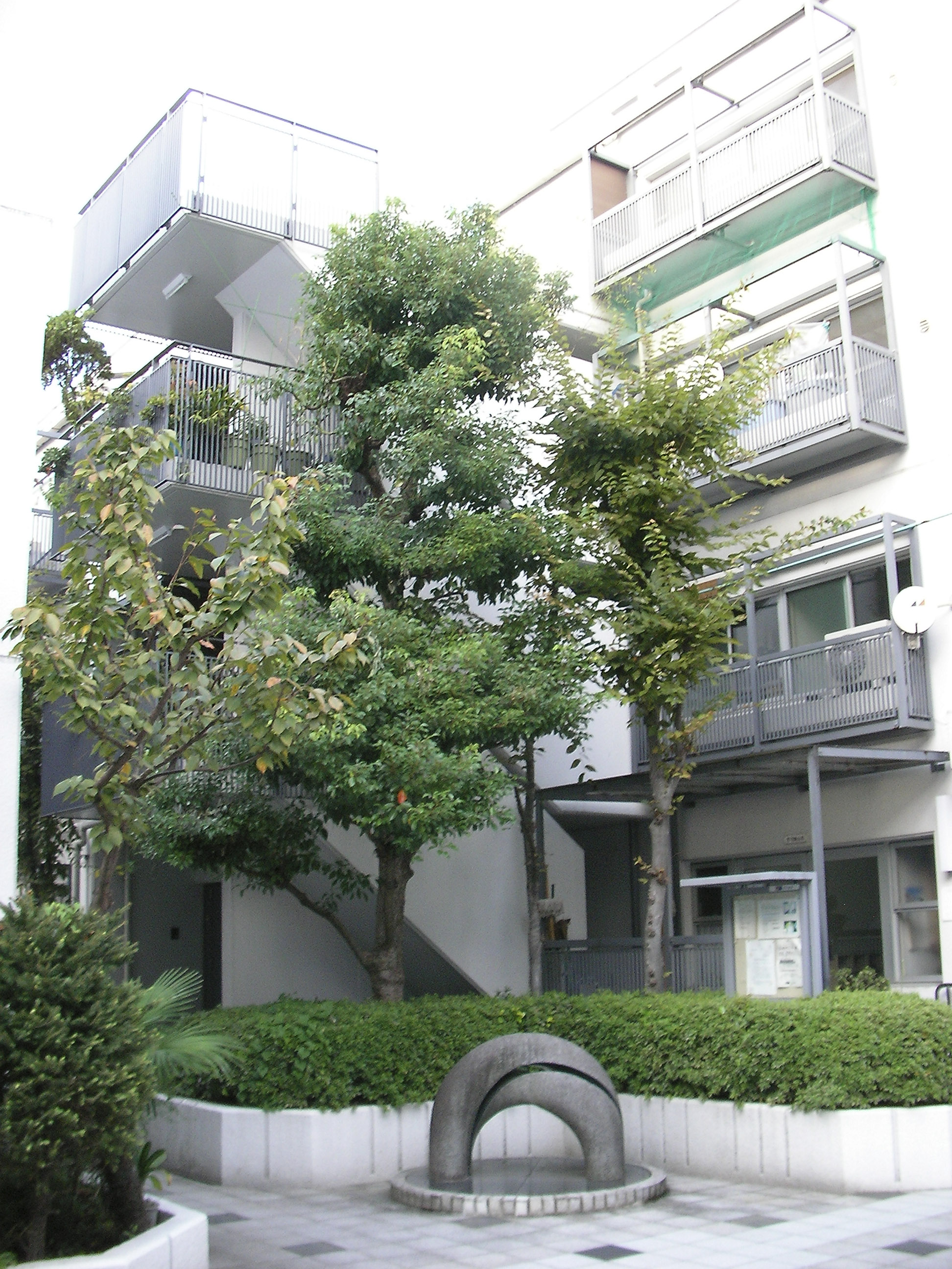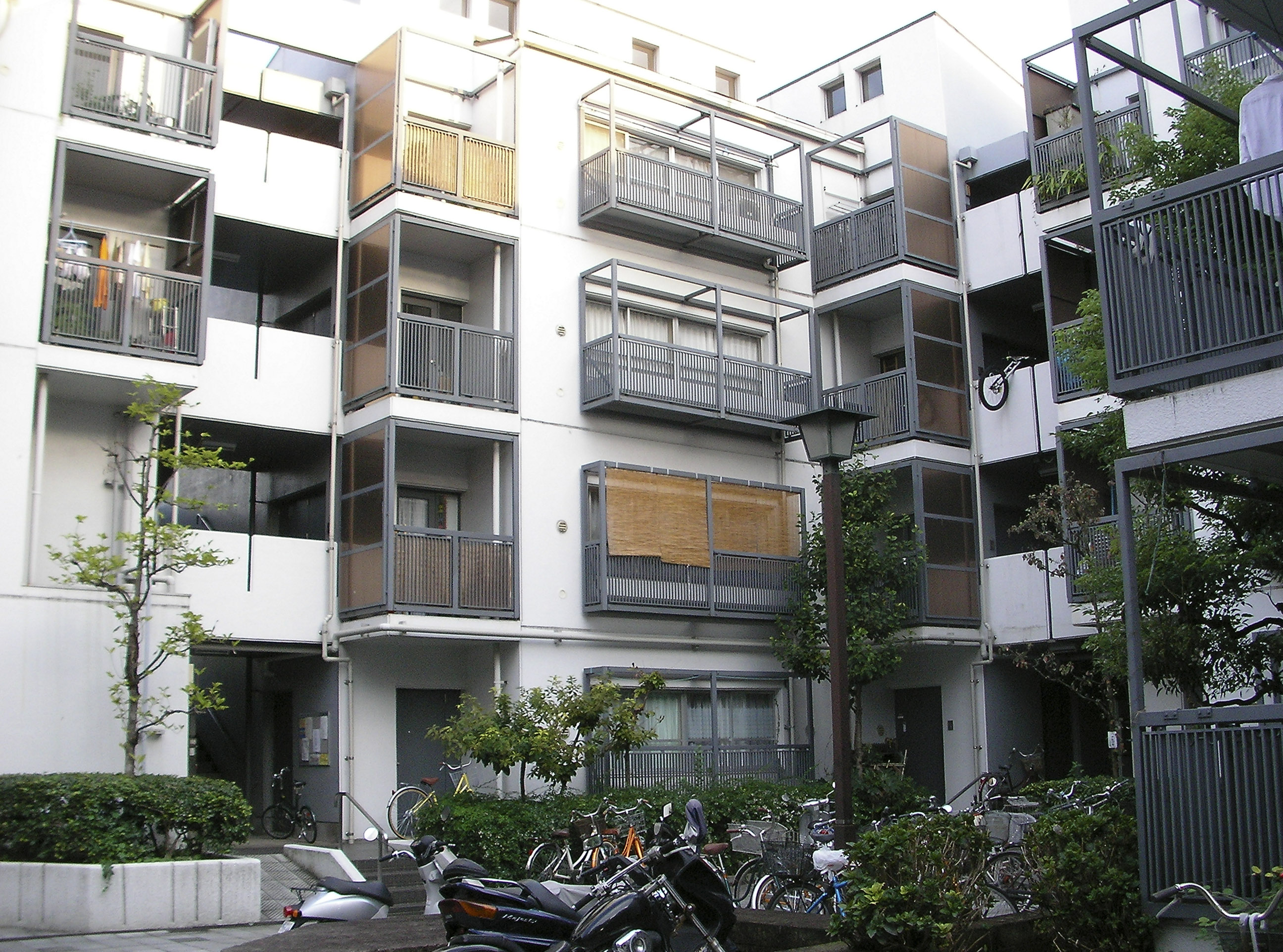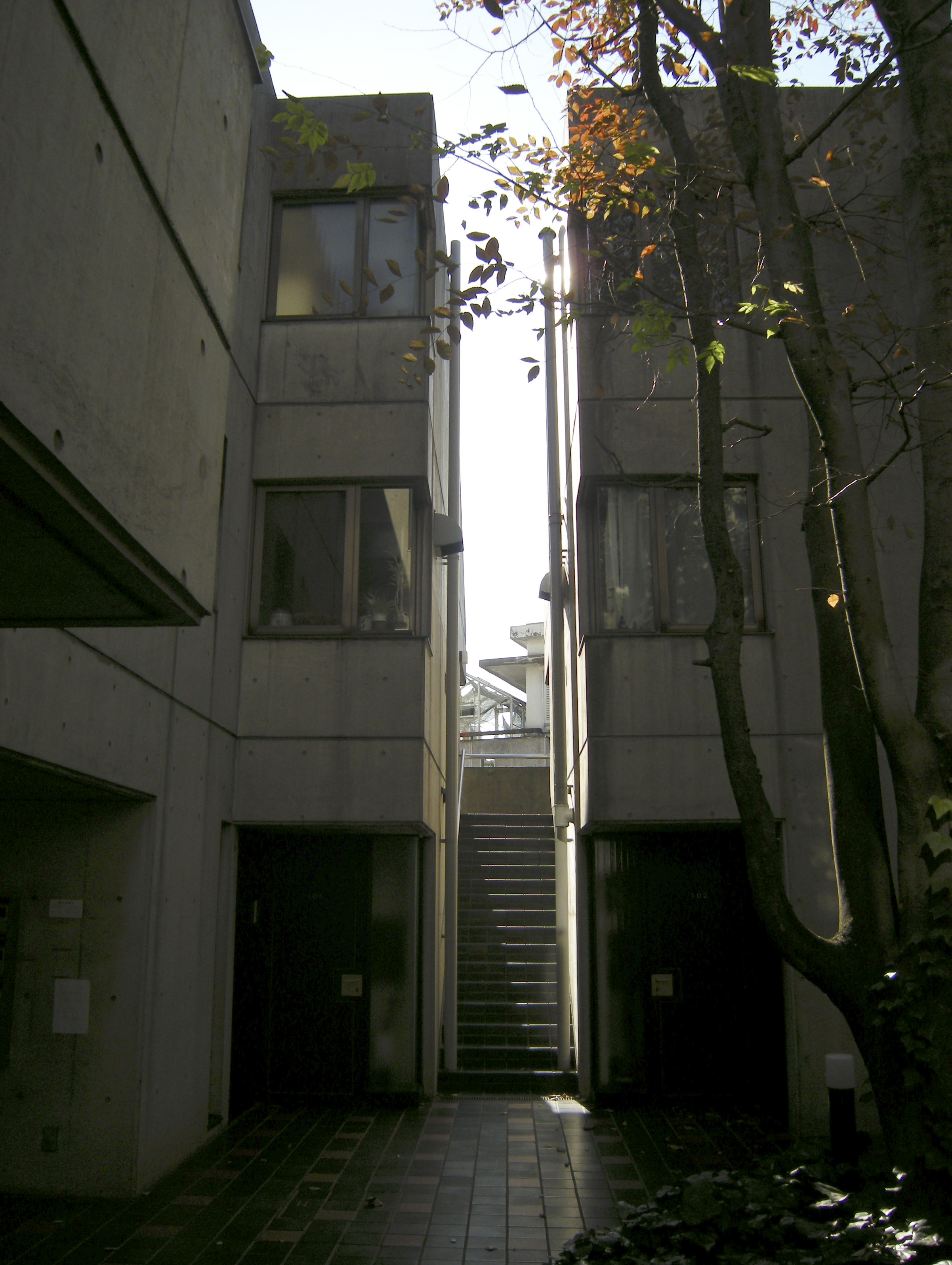 전술한 빌라 시리즈에서도 시도했던 수법의 연장선으로서, 이러한 형태에 의해 상층부의 주호까지의 어프로치를 미니가로화(ミニ街路化), 중첩된 로지(路地≒골목길)공간으로서 중정 공간과의 관계성을 강화시켜, 외부공간으로서의 개방성을 높혔다.