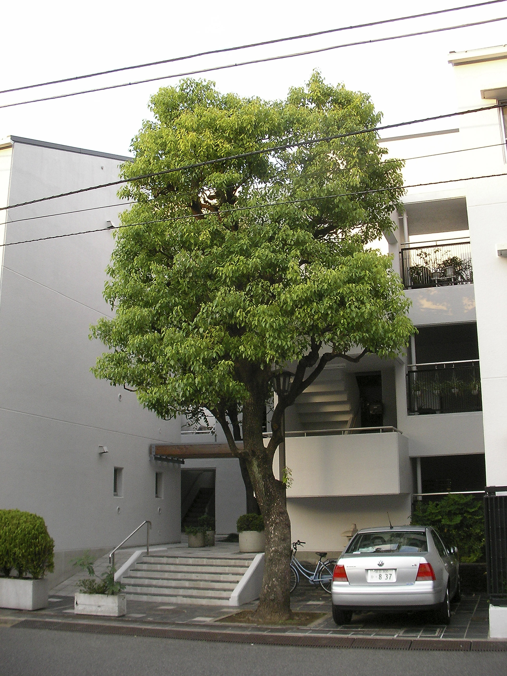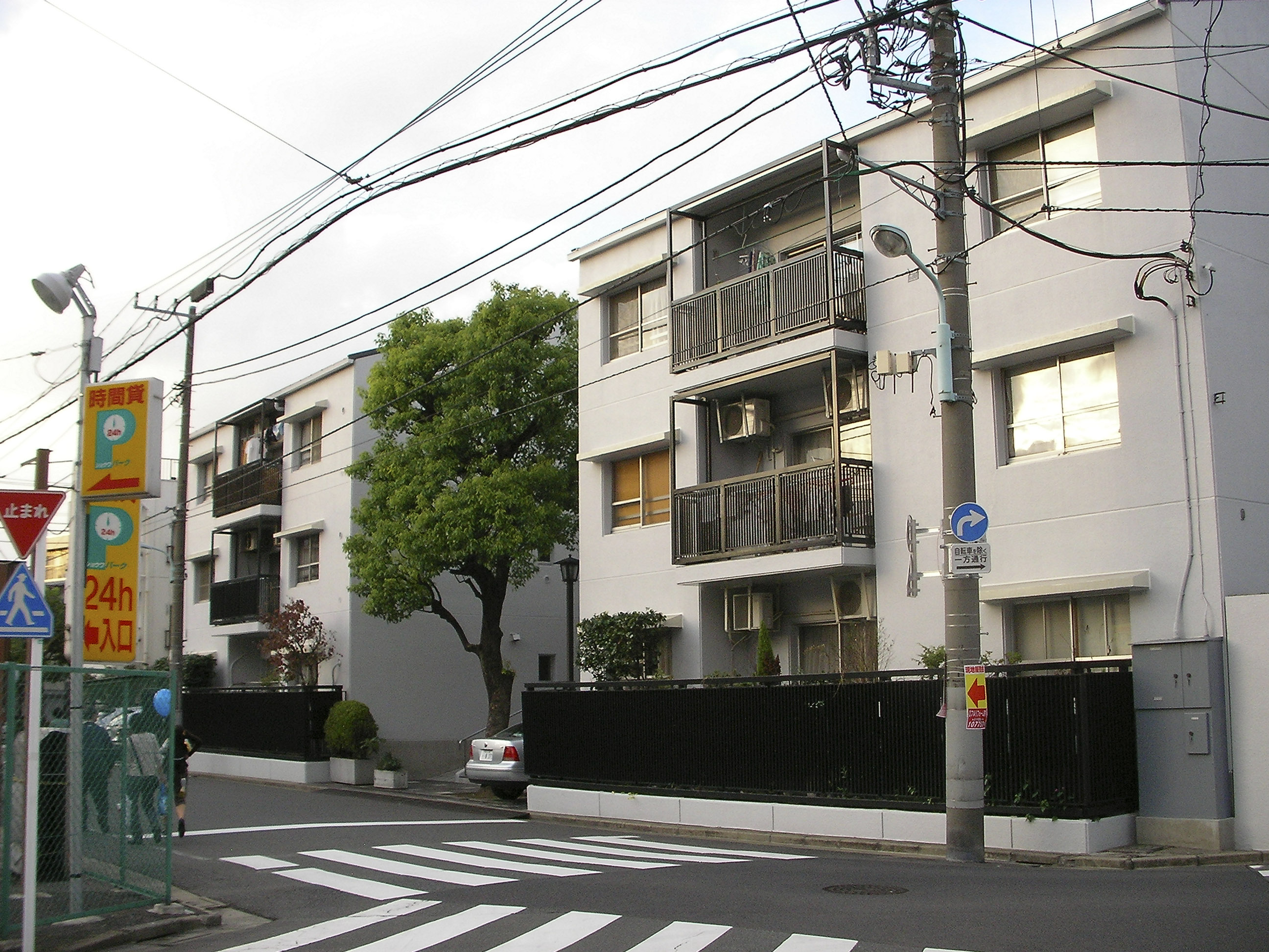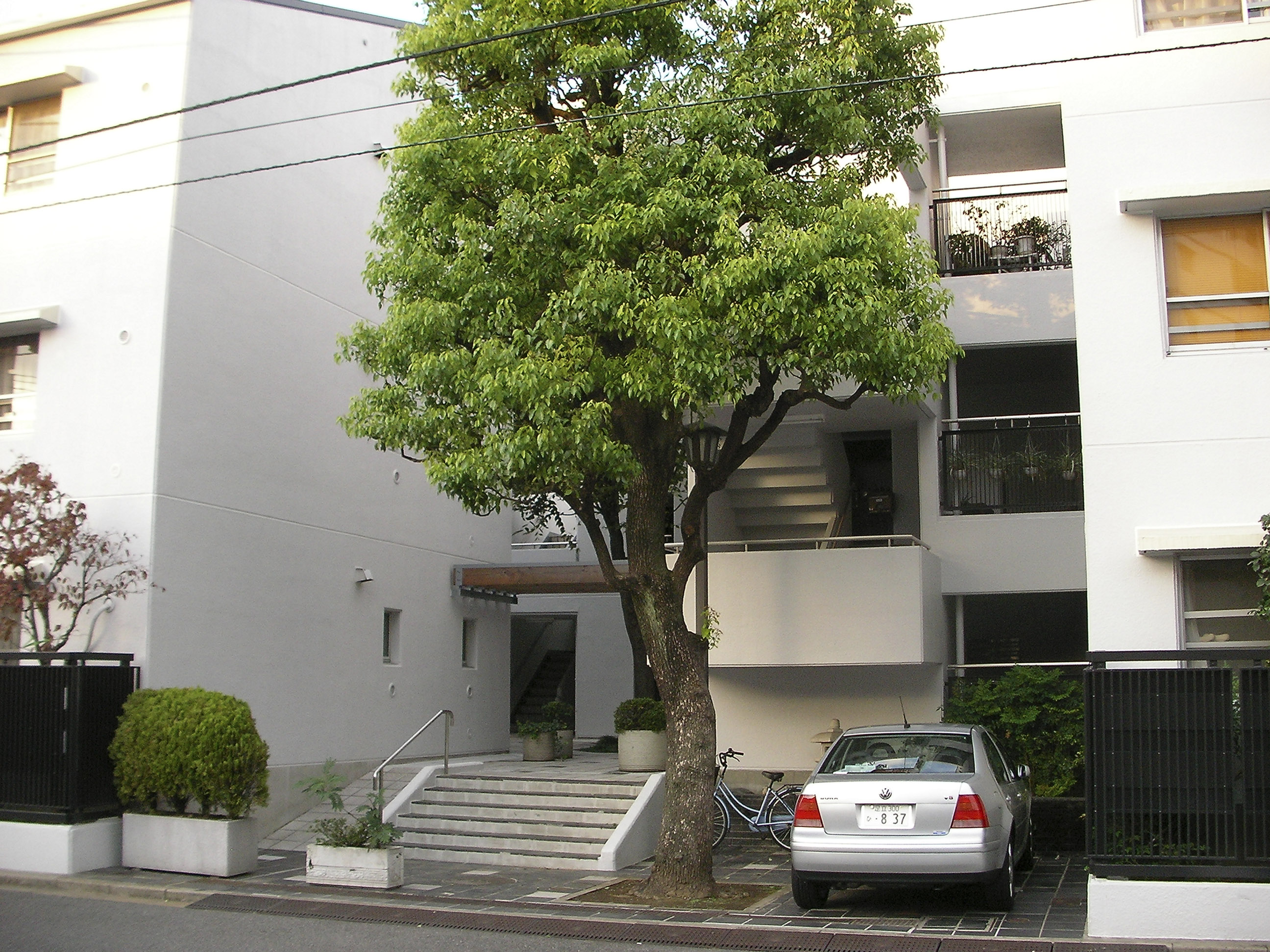 면적 720㎡의 부정형 부지에, 중정(中庭)과 슬릿상(slit状)의 외부계단을 삽입한, 용적률 150%, 13주호 규모의 집합주택이다.