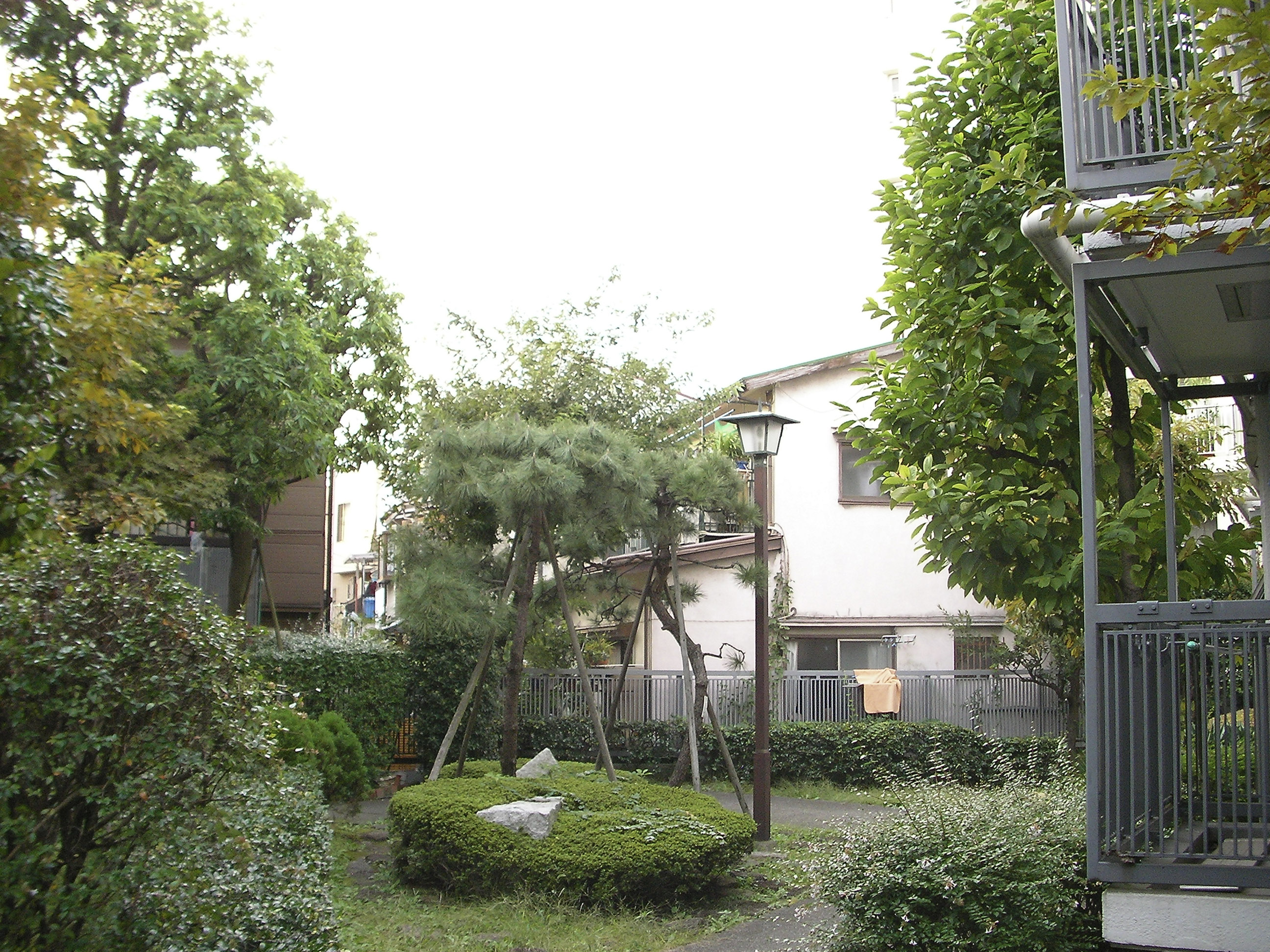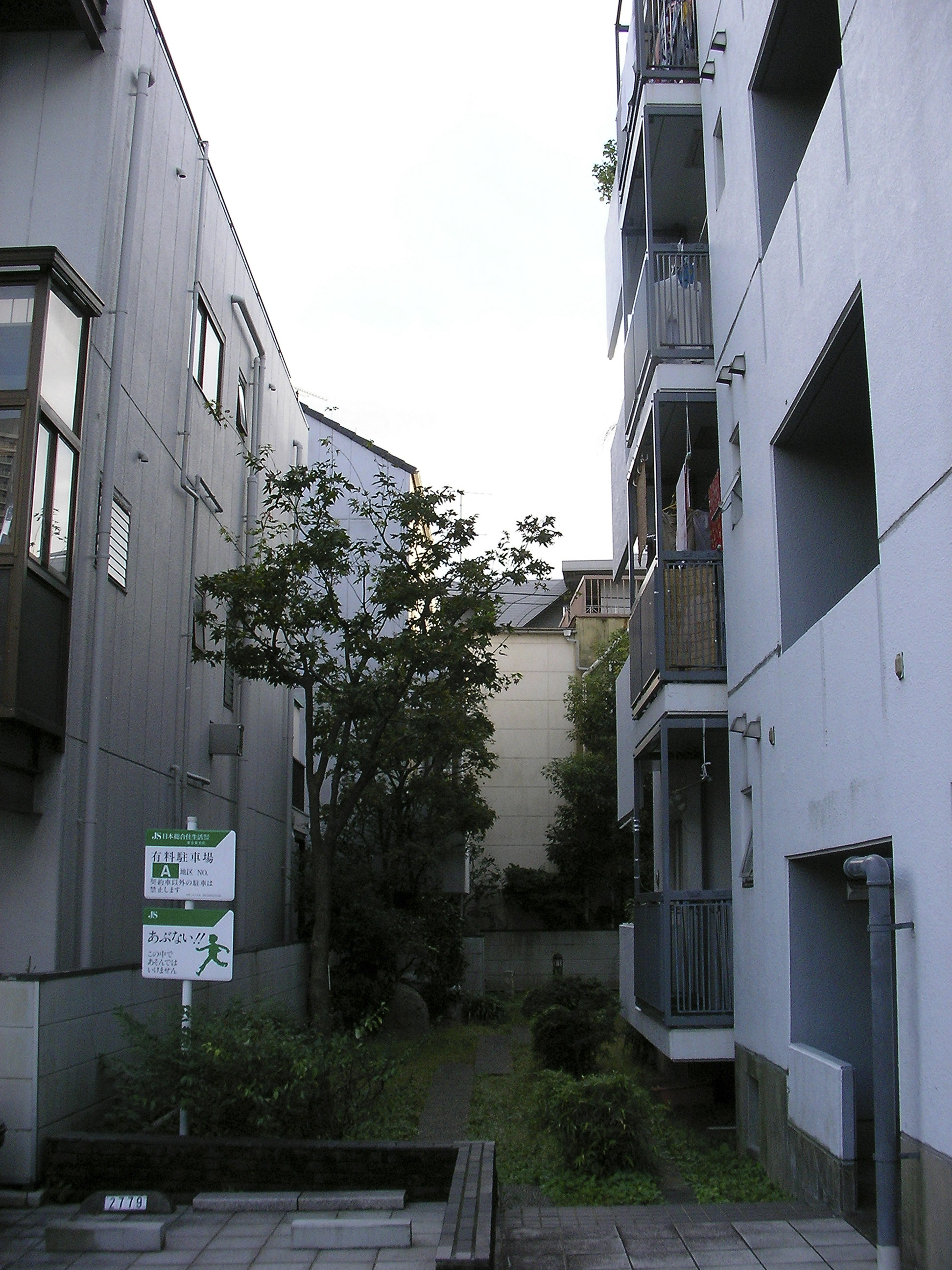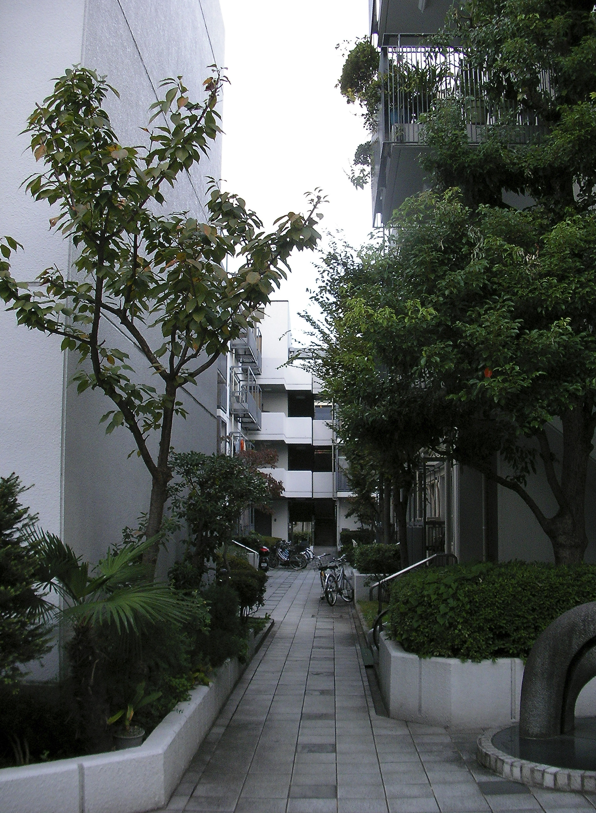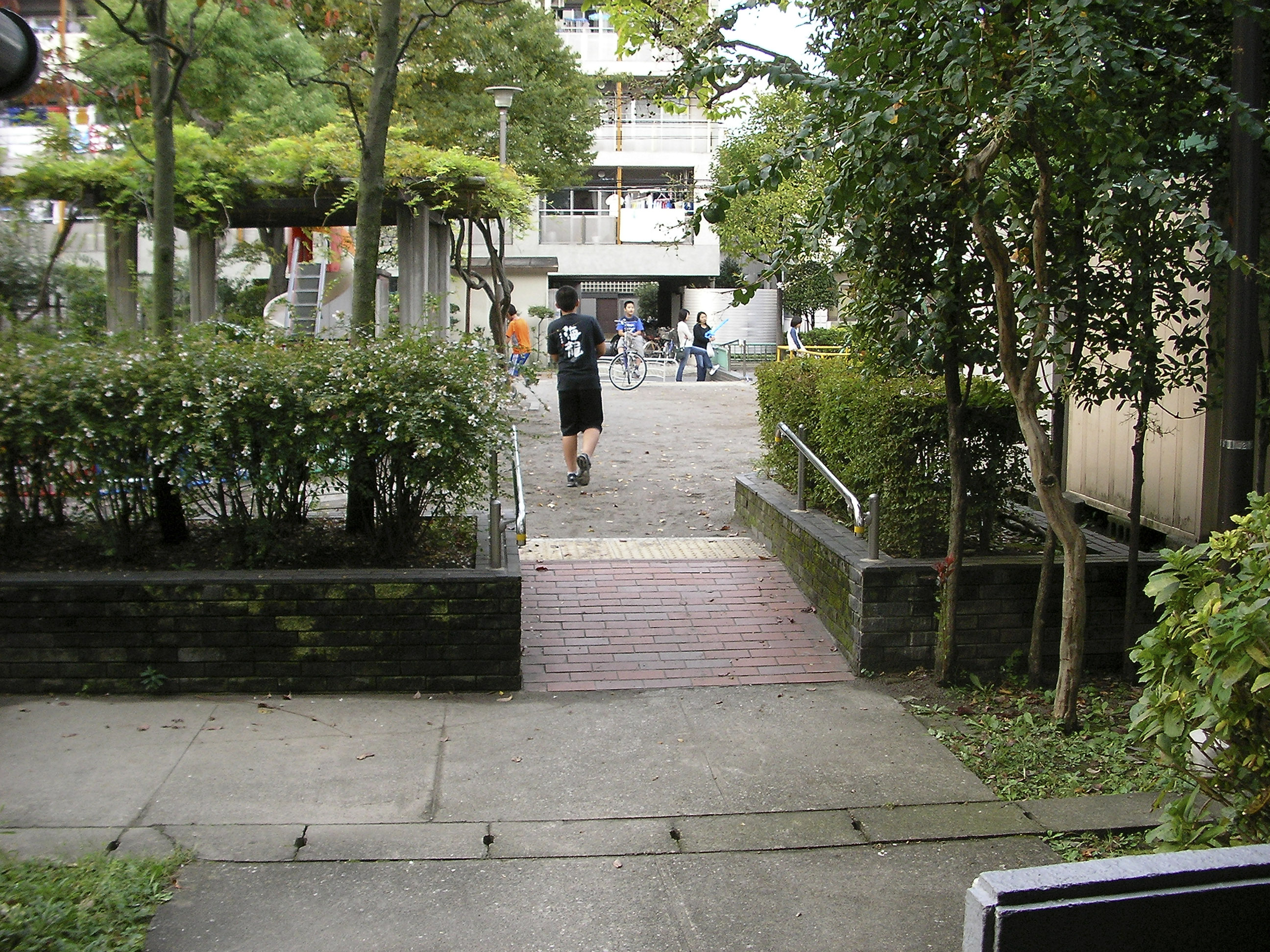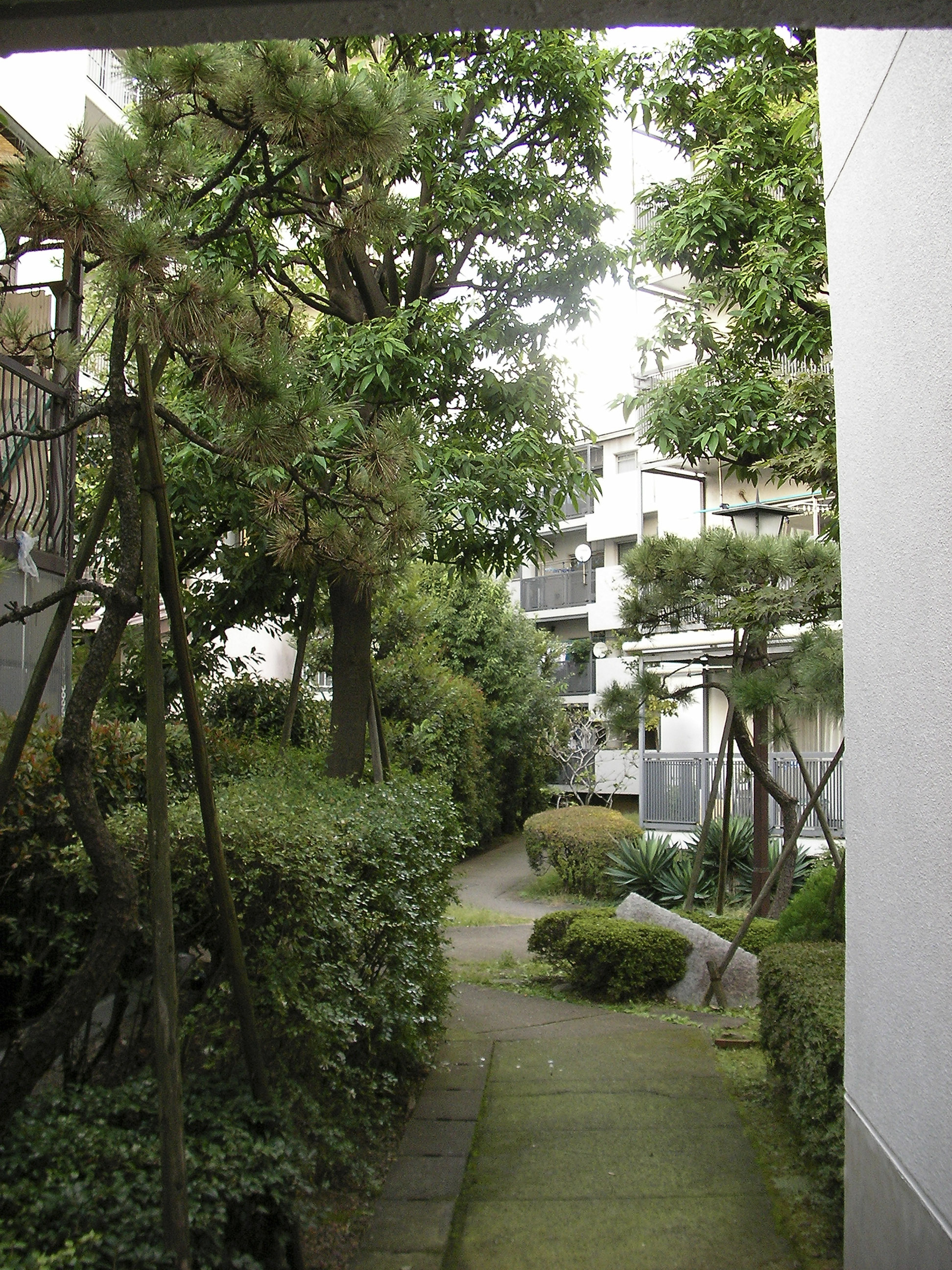 고층이나 저층고밀의 인접 건물이 맞닿아있는 서측과 남측의 경계를 따라서는 완충 영역으로서 역할을 하는 녹도(緑道)를 배치하고, 이를 띠상(帯状)의 사잇공간(隙間)으로 연장(延長)하여, 북측의 아동공원에서 남서측의 분양주택 영역의 중정까지 연결하여, 장래 수로(水路)를 정비한 후에는 가로(街路)에까지 연결시킬 것을 고려하였다.
