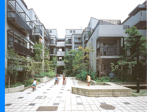 부정형(不整形)한 부지형상 속에, 단지 내부와 외부가 연속하는 로지성(路地性≒골목길) 및 서민적인 분위기(下町)를 자아내는 공간디자인에 성공한 주택공단(住宅公団)이 계획한 단지 중 손에 꼽히는 모범사례이다.