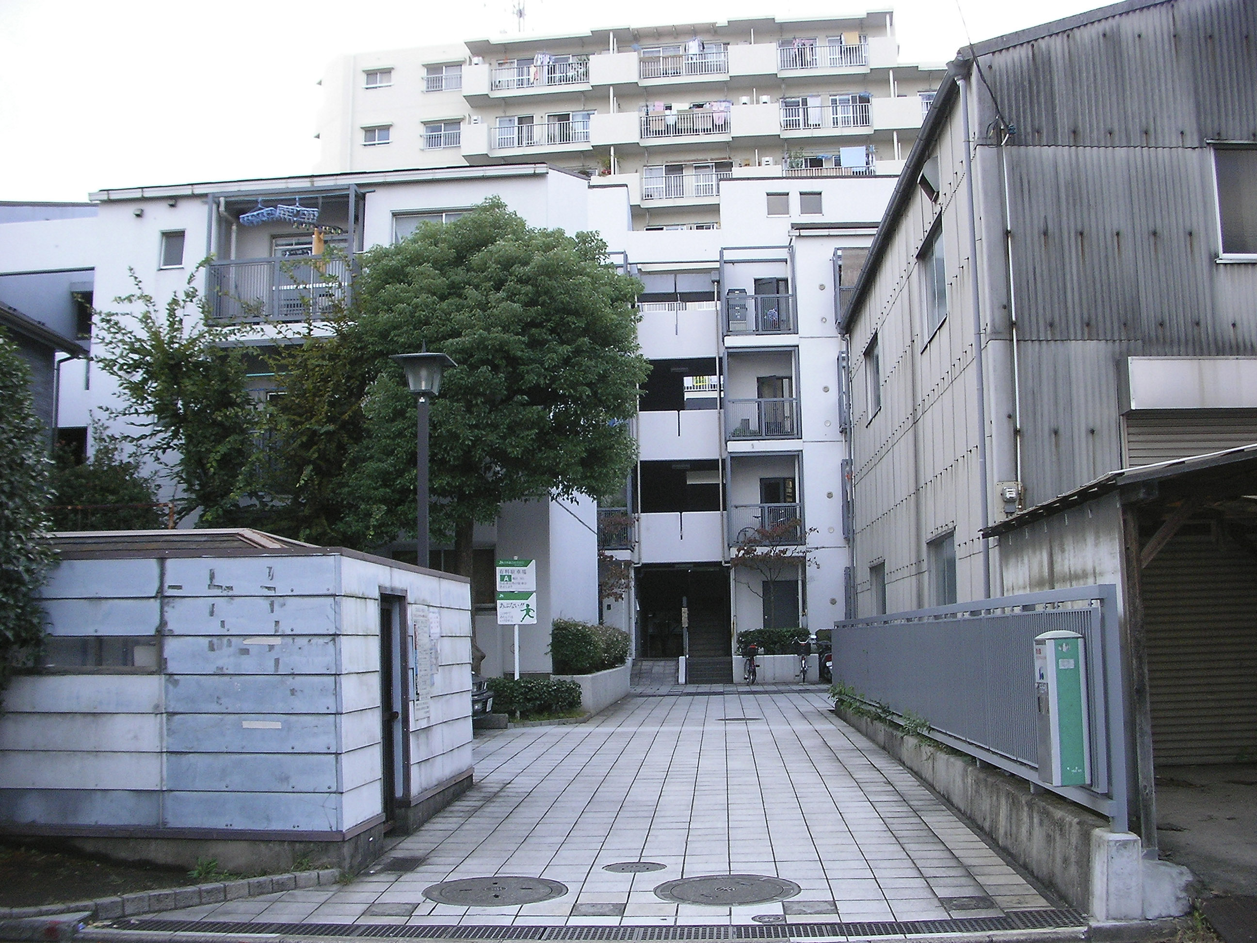 0.5ha 면적을 가지는 부지는, 부분 부분 외부 도로와 접하고 북단(北端)은 아동공원, 남측 일부는 운하(運河)의 수로에 접하면서, 부지 외주 경계선의 과반은 인접 건물과 접하고 있는 부정형(不整形)의 형상으로 주위 가로(街路)에는 고층 맨션, 3~4층 규모의 철골조 병용주택(併用住宅), 창고, 소규모 공장, 미니개발(ミニ開発)에 의한 목조 단독주택군(群)이 늘어서 있다.