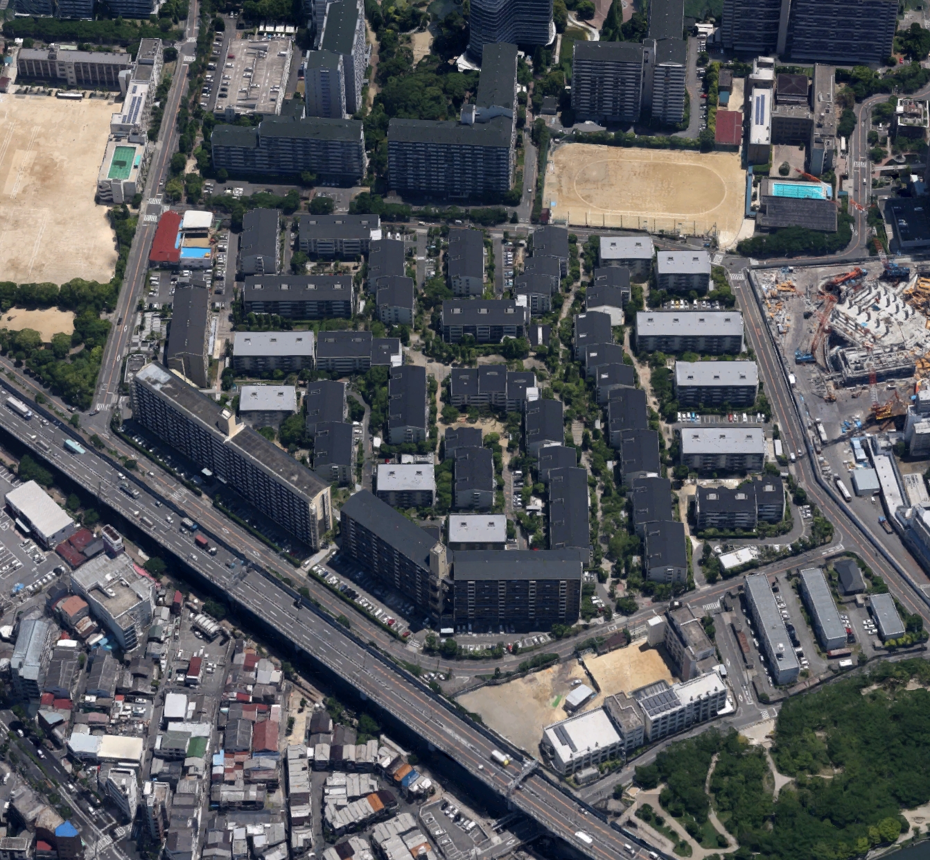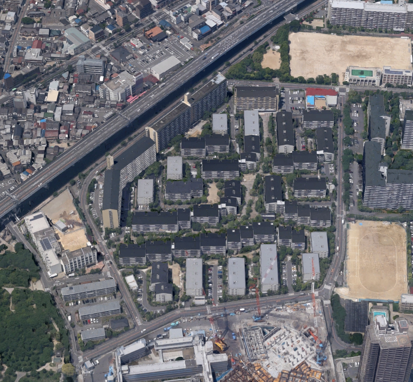 전형적인 중층고밀(中層高密) 단지로서, 중정형(囲み型), 기러기떼형(雁行型), 직교형(直交型) 등, 다양한 배치 디자인에 의한 공간구성으로 고밀(高密)함을 느끼기 어려운 휴먼 스케일적인 주택지 분위기를 자아내는데 성공하고 있다.