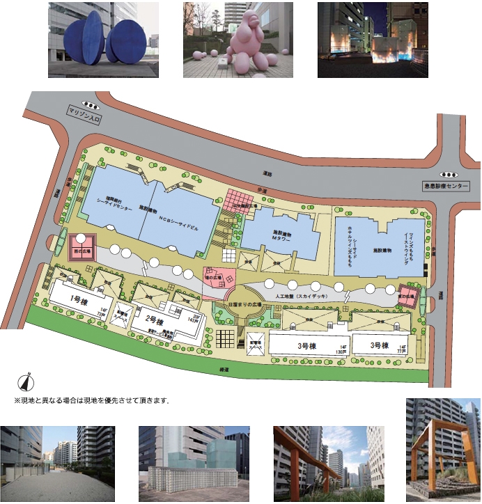 | 부지경계선에 따른 외벽을 후퇴시켜, 여유감을 느낄 수 있는 가로공간(街路空間) 및 지역환경(地域環境) 제공에 공헌한다. 특히, 도로를 따라서는 각각의 도로의 성격이나 가로(沿道)의 토지이용에 어울리도록 풍부한 식재(植栽), 개방감있는 광장(広場), 쉼터역할 및 활기에 찬 옥외 퍼니쳐(street furniture) 등을 설치하여, 윤택있는 보행자공간(歩行者空間)을 계획하여, <씨사이드 모모찌>다운 가로경관의 표정을 연출한다. |