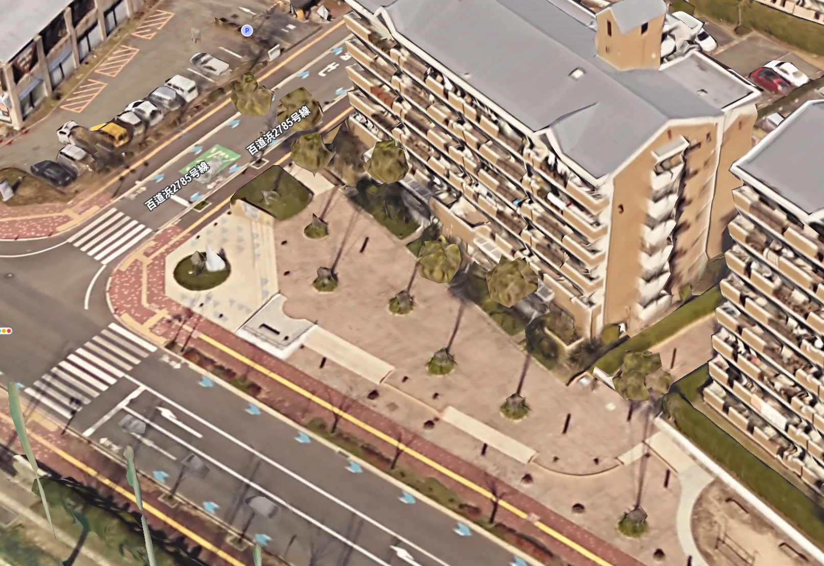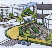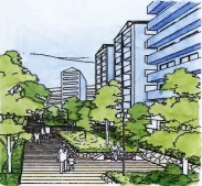 | 지구(地区)의 현관이 되는 교차점, 지구 내 녹도(緑道)의 주요 교차점 모퉁이(角地)를 열려진 광장으로서 계획한다. 주요 교차점의 이미지업(image up)을 도모하는 동시에, 활기에 찬 휴식의 장으로서 매력적인 모퉁이 광장(街角広場)을 계획한다. 모뉴먼트(monument, モニュメント), 심볼트리(symbol tree, シンボルツリー), 옥외 퍼니처(strret furniture, 屋外ファニチャー) 등을 배치하여, 가로경관(街並み)의 결절점(結節点)으로서 기능할 수 있도록 한다. |