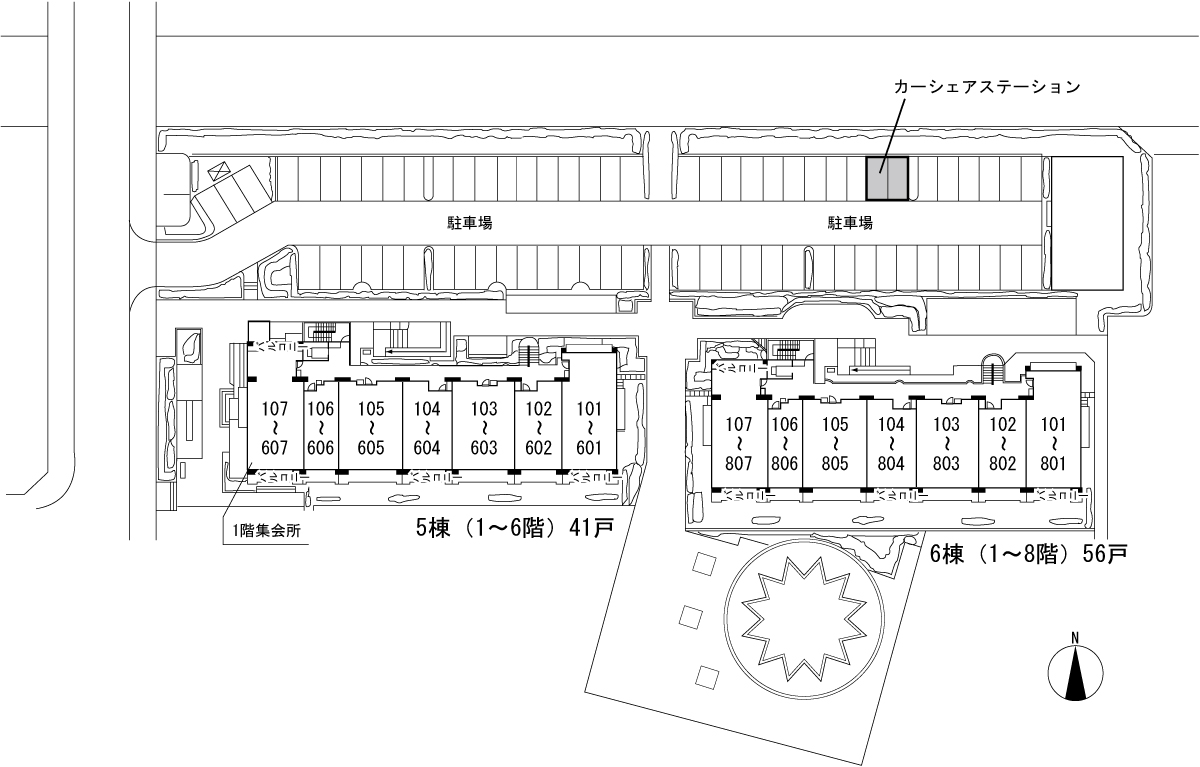 | 주호 구성(이스트 스테이지) | - 월임대료 : 57,100엔~107,600엔(관리비:3,800엔) - 평면종류: 1DK, 1LDK, 2DK, 2LDK, 3DK, 3LDK, 4DK - 관리주호수: 97호 - 주동수: 2동(임대) |