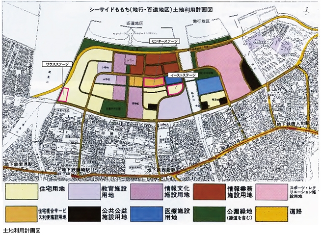 모모찌하마지구(百道浜地区)에는 후쿠오카 타워(福岡タワー), 후쿠오카 종합도서관(福岡市総合図書館), 후쿠오카시 박물관(福岡市博物館), RKB마이니치방송 테레비 니시니혼(RKB毎日放送・テレビ西日本) 사옥, 정보관련기업, 정보기술연구개발기관 등, 고층 빌딩과 맨션 등이 다수 세워져 있으며, 지교하마 지구(地行浜地区)에는, 호크스 타운(Hawks Town, ホークスタウン) (후쿠오카 야후오쿠 돔(Fukuoka Yahoooku Dome, 福岡ヤフオク!ドーム), 힐튼 후쿠오카 씨호크(Hilton Fukuoka Sea Hawk, ヒルトン福岡シーホーク) 등) 등이 있다.