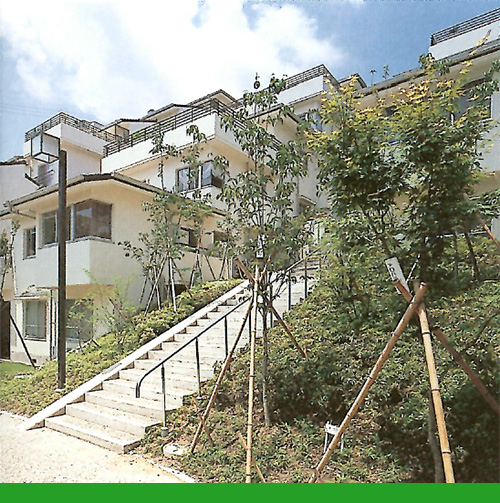 고저차 20m의 경사지의 부정형한 부지특성을 살리기 위하여, 경사지에 2층주택으로 구성된 사면주택(斜面住宅)를 배치하여 옹벽없이 주변환경에 녹아드는 경관을 만들어내고 있다.