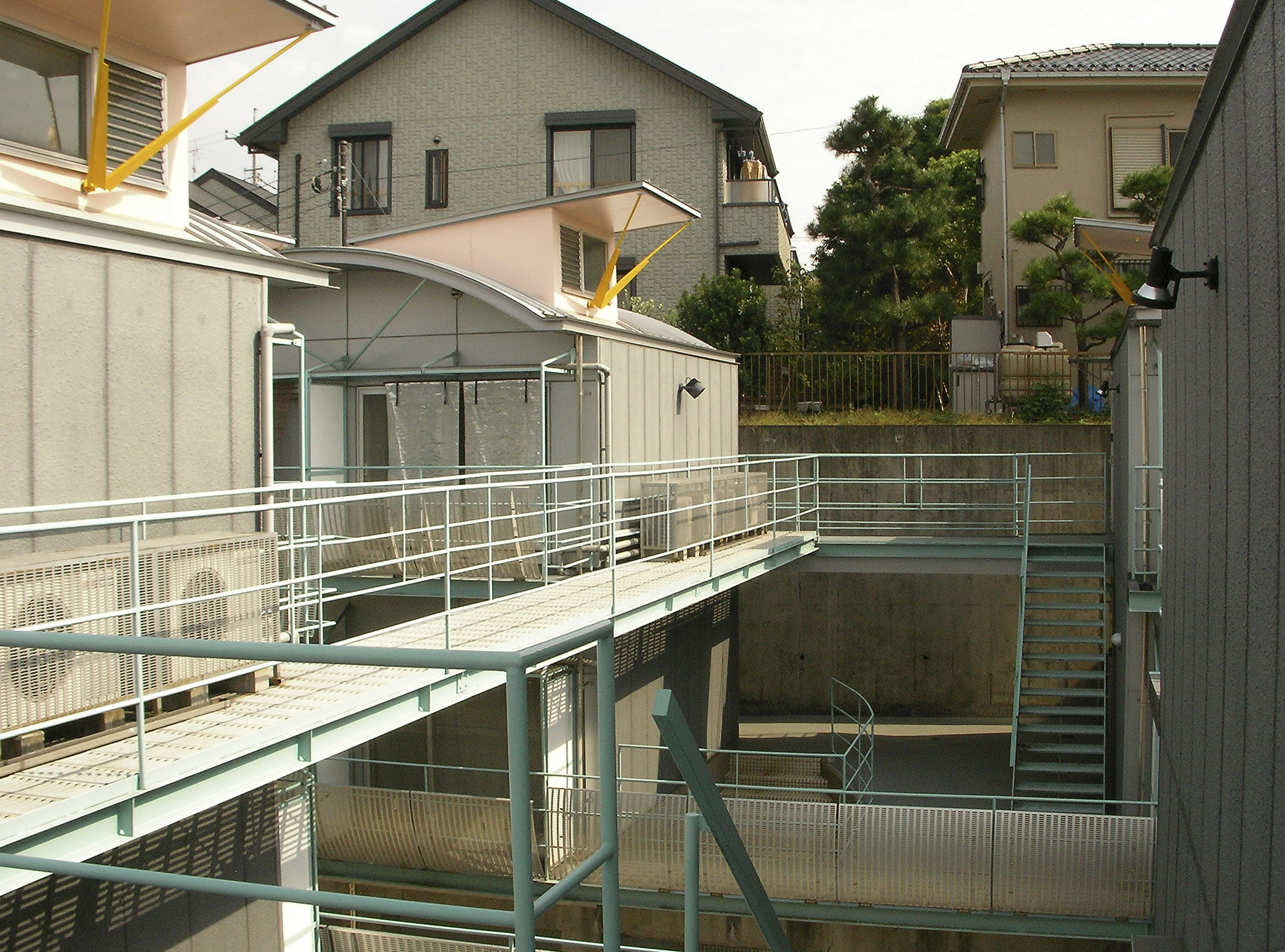 단면 구성의 경우, 부지가 전면 도로와 상당한 레벨차가 있는 경사지였기 때문에, 도로 레벨이 지하층이 되었으며, 이 지하층을 철근 콘크리트조로 하여 주차장 및 상점으로 계획하였다. 인공지반과 같은 지하층의 상단에는, S조로 3개층의 주거 부분과 일부 상점이 얹혀져 있다. 건물부분과 외부공간은 거의 동등한 비중으로 고려되어 부지 전체를 계획했다.