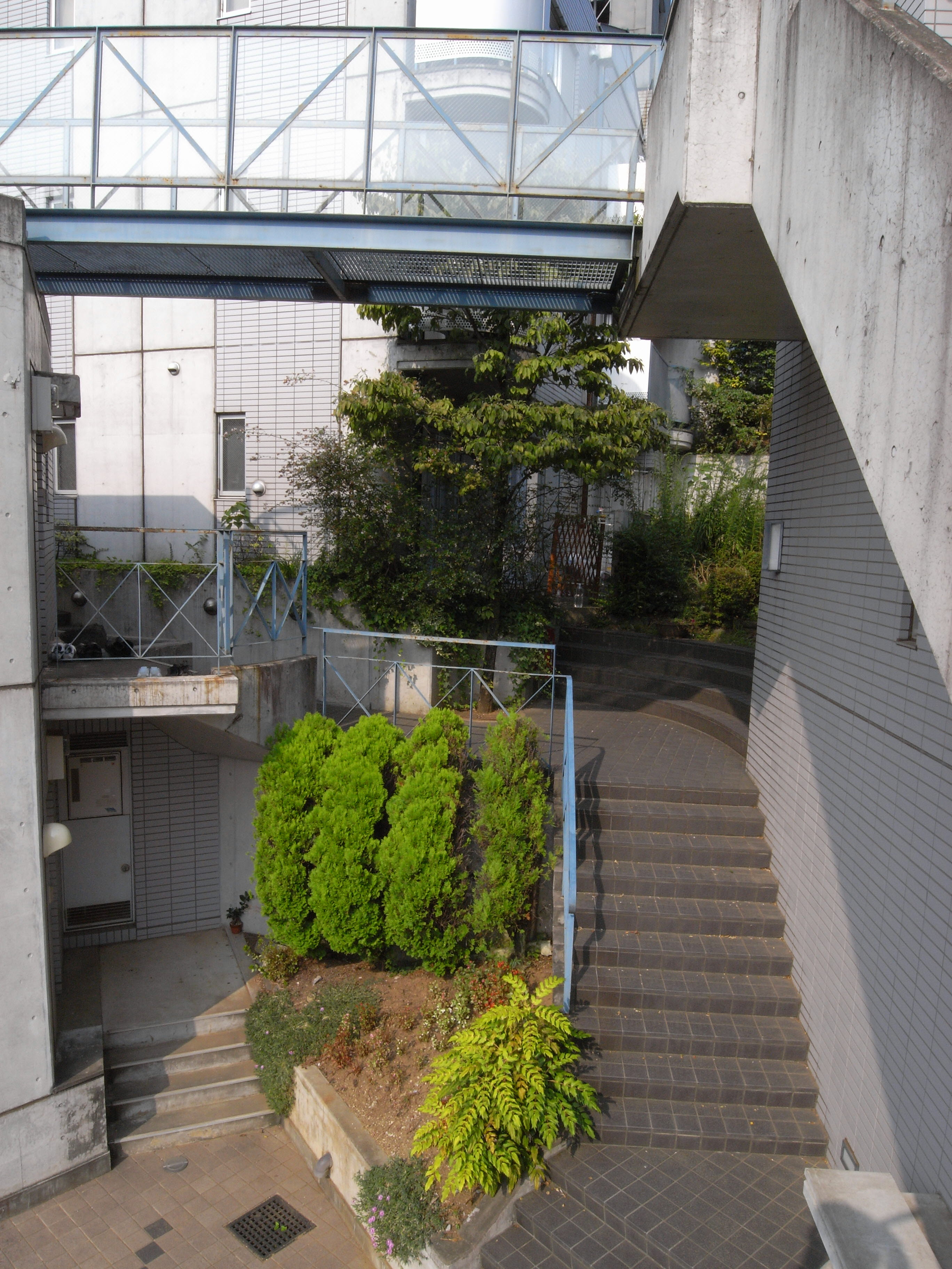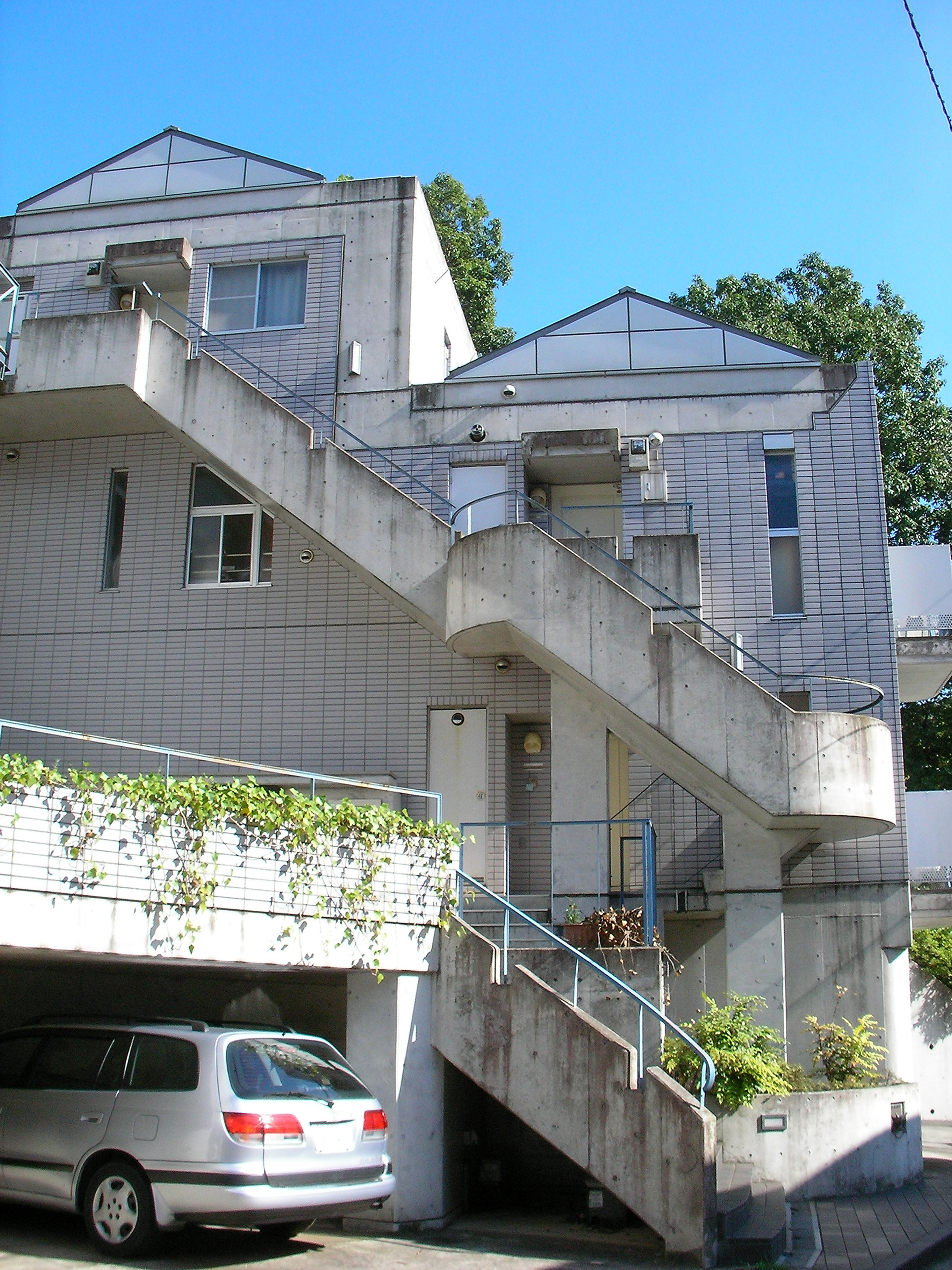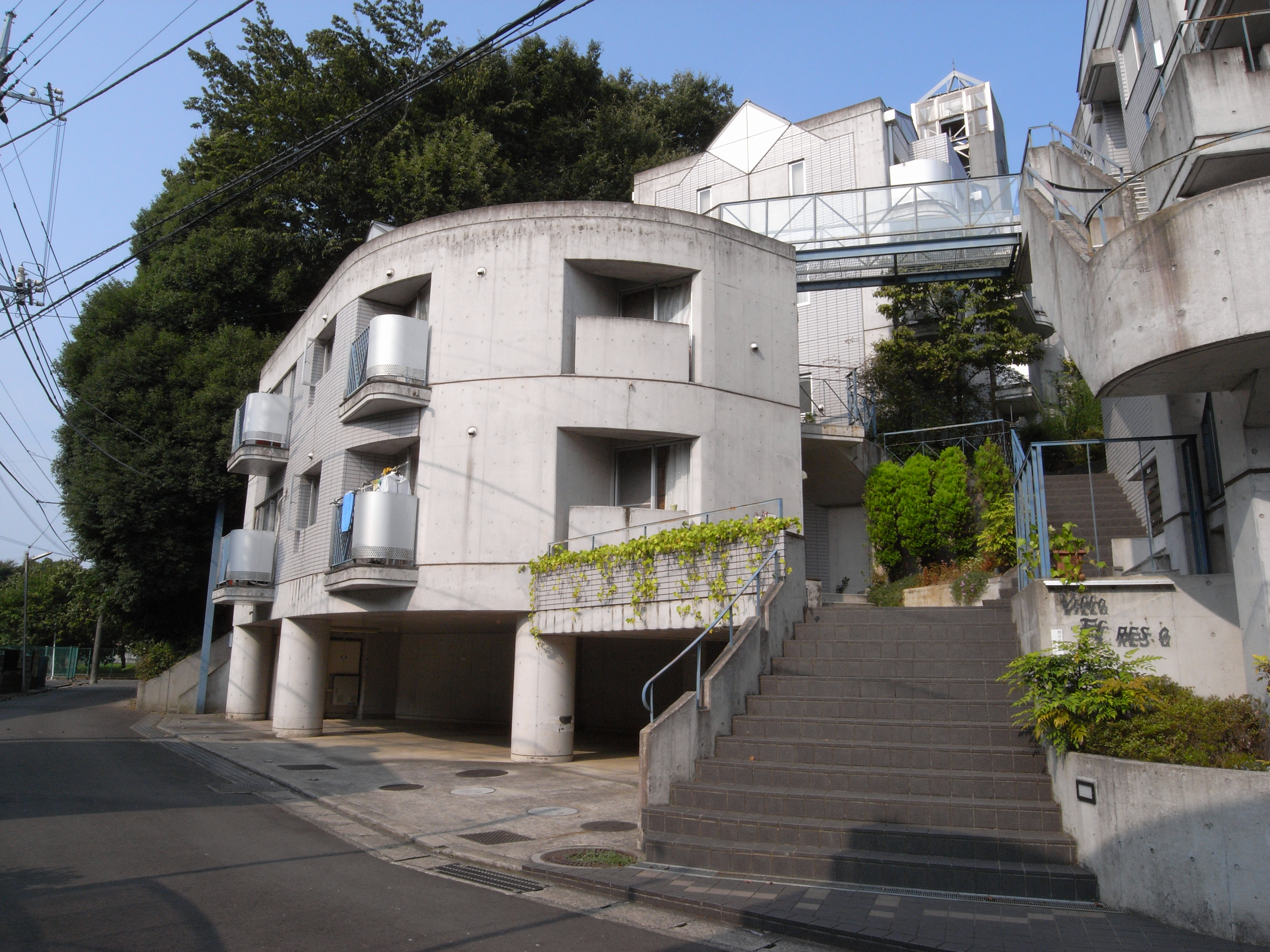 VILLA FLOREST도 가능한 토지의 지형을 변경하지 않고 싶어하는 설계자의 기분이 느껴지는 경사지라는 지형을 적극적으로 긍정적으로 활용하는 집합주택임이 느껴지는 전경이다.