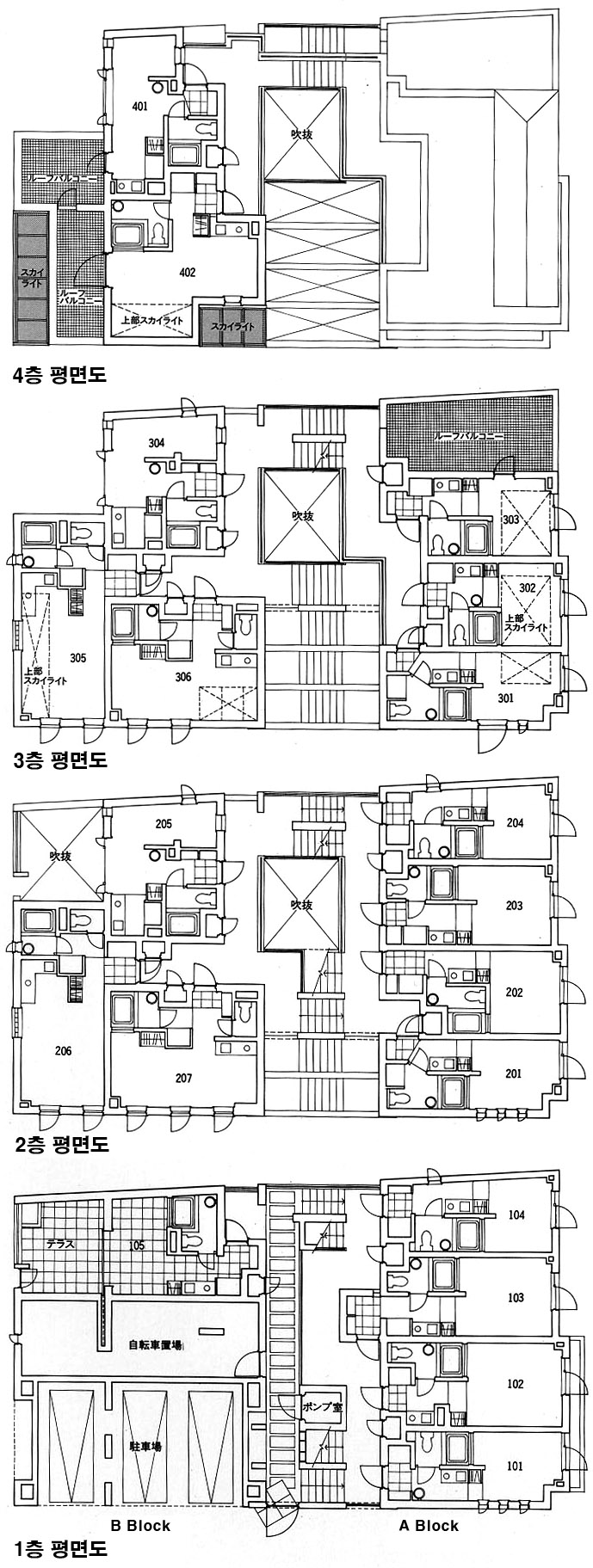 볼륨B는 4층 규모로, 1층의 일부에 주차장과 자전거 보관소를 설치하고, 각 층은 구조적 제약 속에서 최대한 변화있는 평면으로 계획하여 스카이 라이트에 의한 공간적 특성을 각 주호에 부여했다.