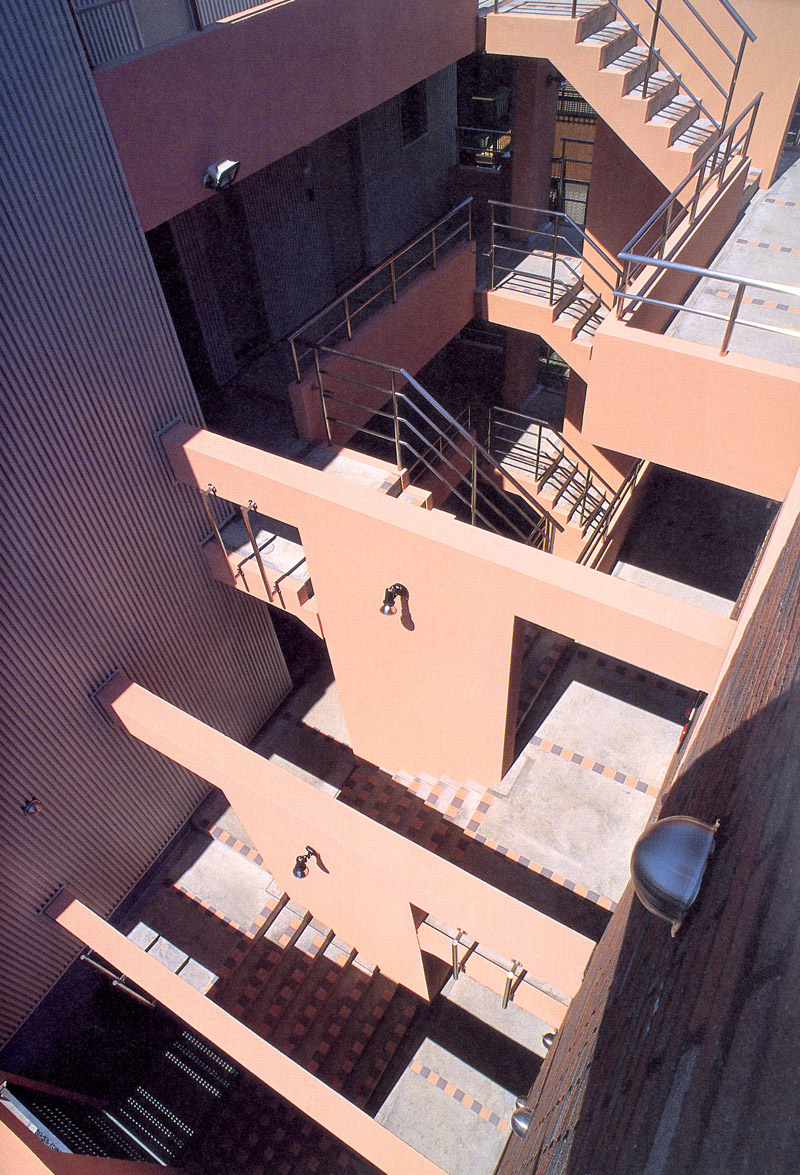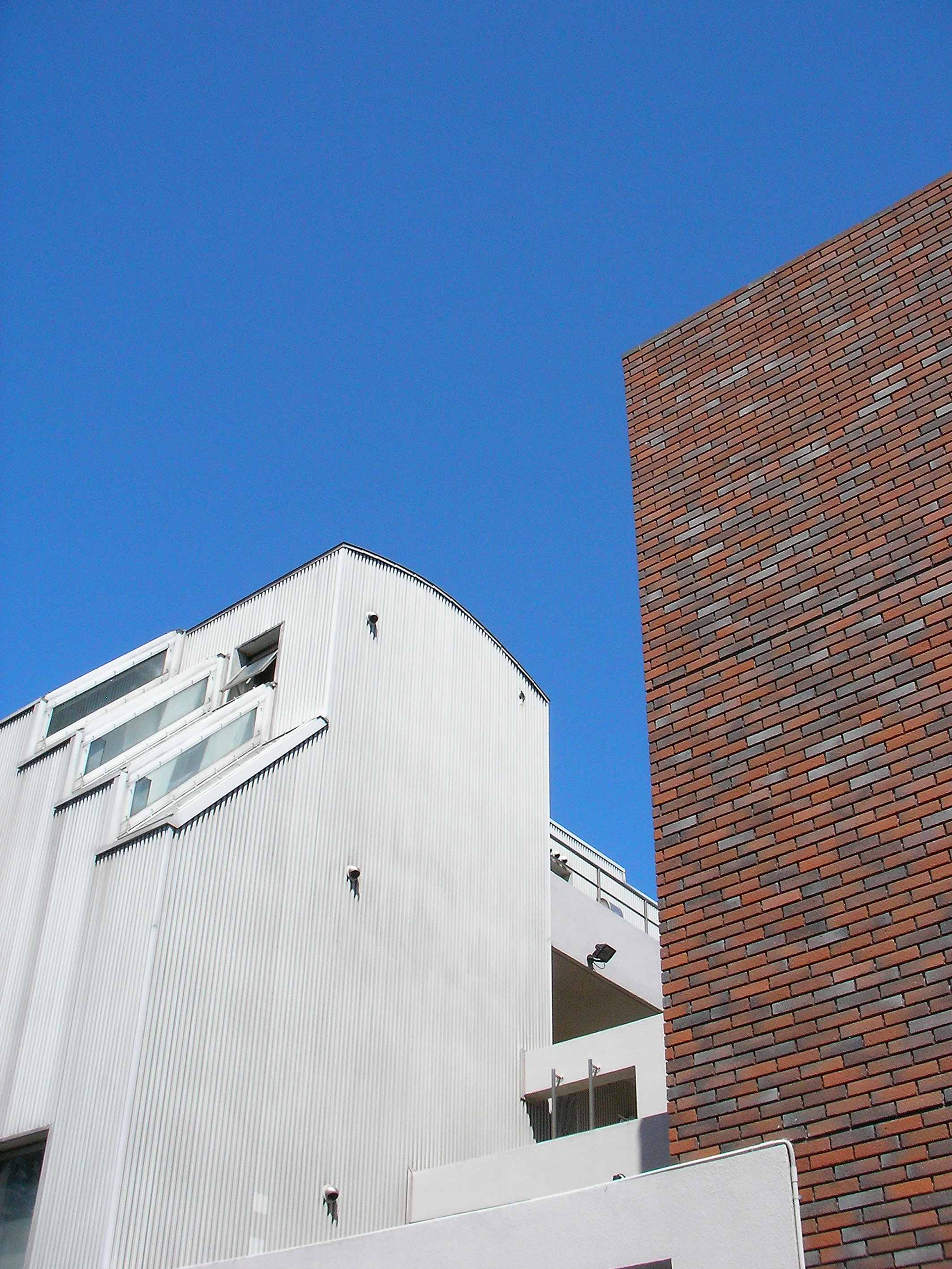 하나의 볼륨은 외벽을 철판으로 덮고, 또 하나의 다른 볼륨은 벽돌 타일붙임으로, 두 볼륨은 바닥에 반층 레벨차를 두어, 외부계단 및 공용복도에 의해 연결되어 있다.