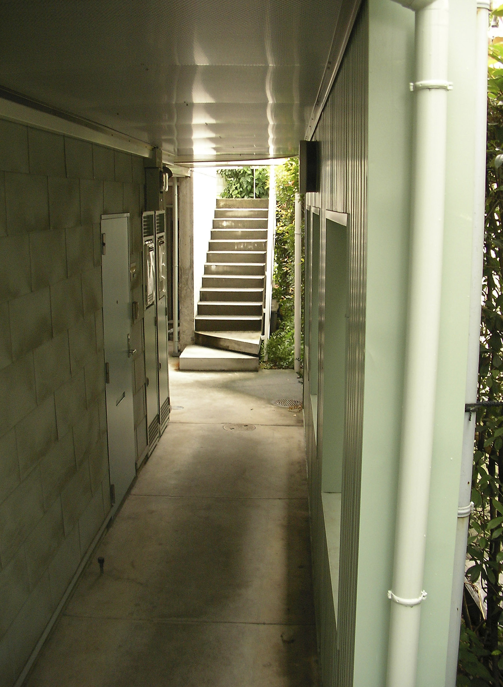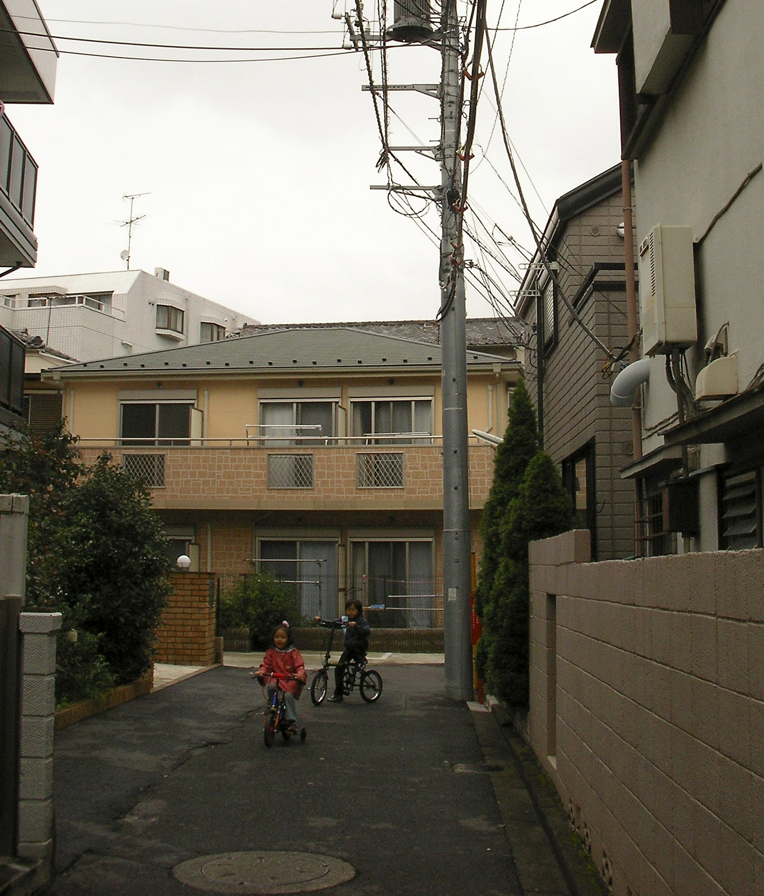 히가시나카노 아파트는 상업용 빌딩이 건물 늘어서 있는 큰길에서 주택가 골목으로 몇 발자국 들어간 곳에 서 있는데, 이 근처도 한때는 소규모 단독주택 위주의 주택가였음직한 곳이나, 지금은 2층 전후의 아파트와 중층 맨션들 틈에서 듬성듬성 단독주택을 볼 수 있는 정도의, 도시부 주택지에서 볼 수 있는 익숙한 풍경이다. 답사 당시에도 신축 공사를 위한 공사알림 표지만을 꼽아놓은 조그만 빈부지가 여기 저기 보였다.