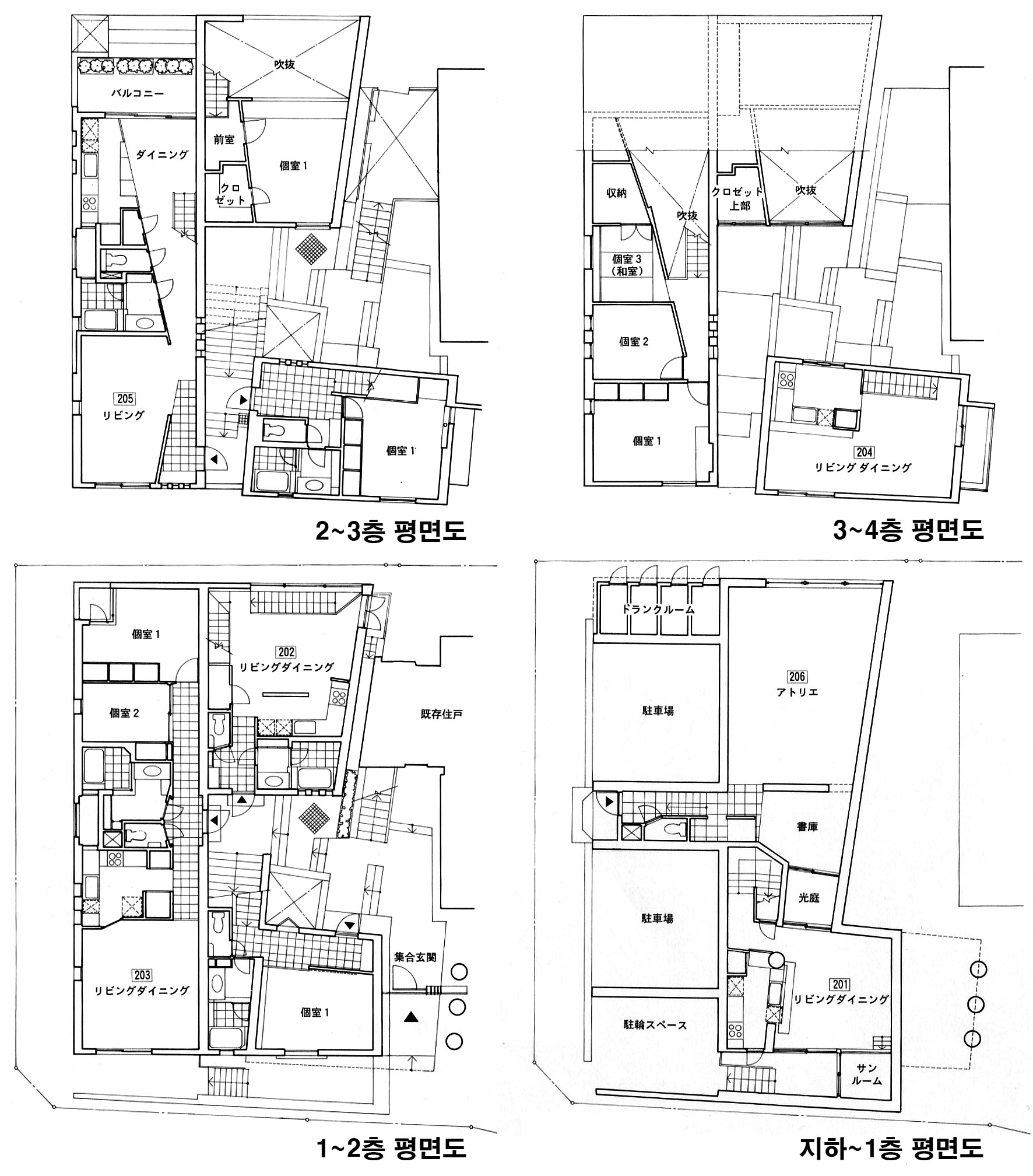 평면을 보면 각 주호는 모든 주호의 실내공간으로 살펴보고 싶을 정도로 메조넷을 메인으로 보이드 공간, 로프트, 갤러리, 일본식 방 등등 각기 다른 평면으로 계획되어 있다.