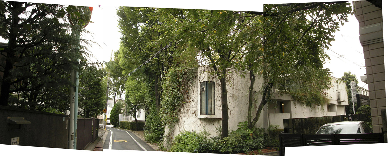 그렇게 잠시 걷다보면 4~5층 높이의 나무들이 우거진 주택가 도로 모퉁이에, 지어진 지 시간이 좀 흘러보이는 아담한 흰색 건물, 넝쿨로 몸을 감싼 건물, 그리고 지은 지 얼마 안되어 보이는 사암으로 마감된 벽과 투명 유리 스크린 현관, 그 안 쪽으로 보이는 감색벽으로 둘러싸인 중정이 인상적인 건물군을 맞딱드리게 된다.