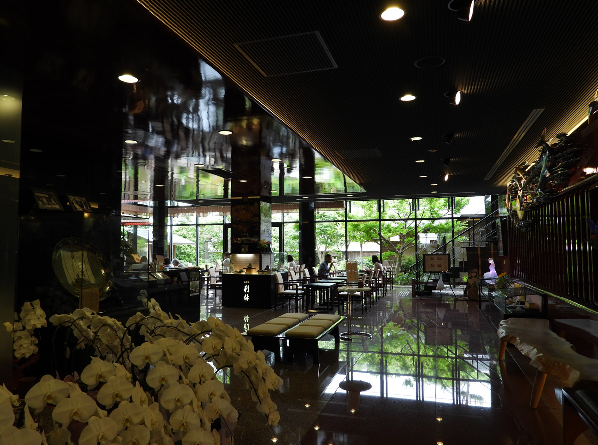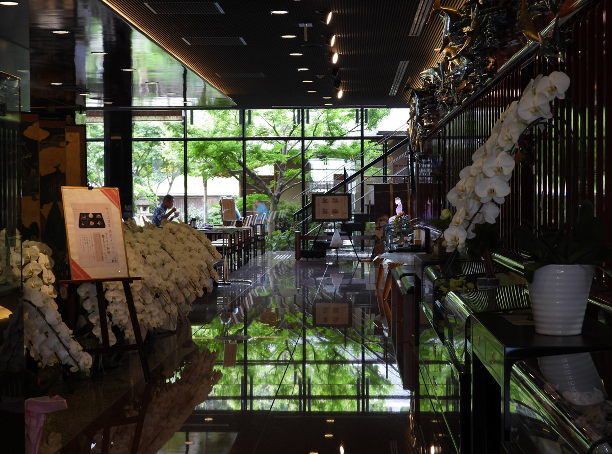 테이블에 앉아 감상할 수 있는 건물 후정의 일본식 정원에는 센노리큐(千利休)의 복원차실(차실 이용은 사전예약 필요)이 있다.