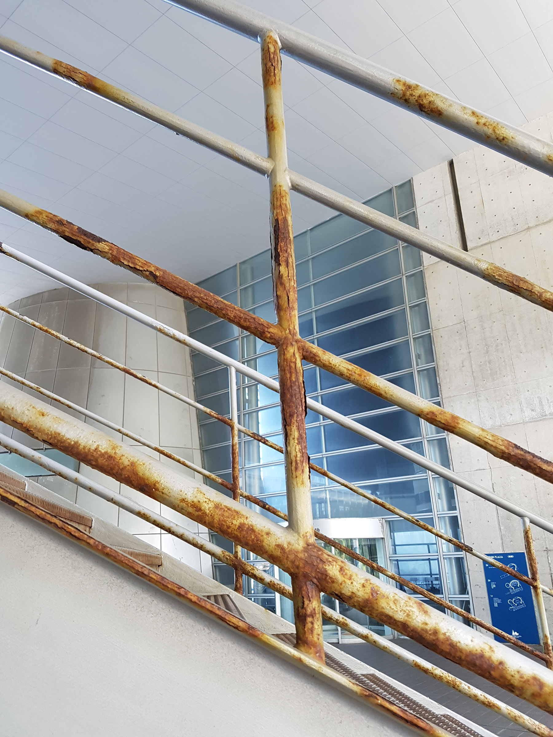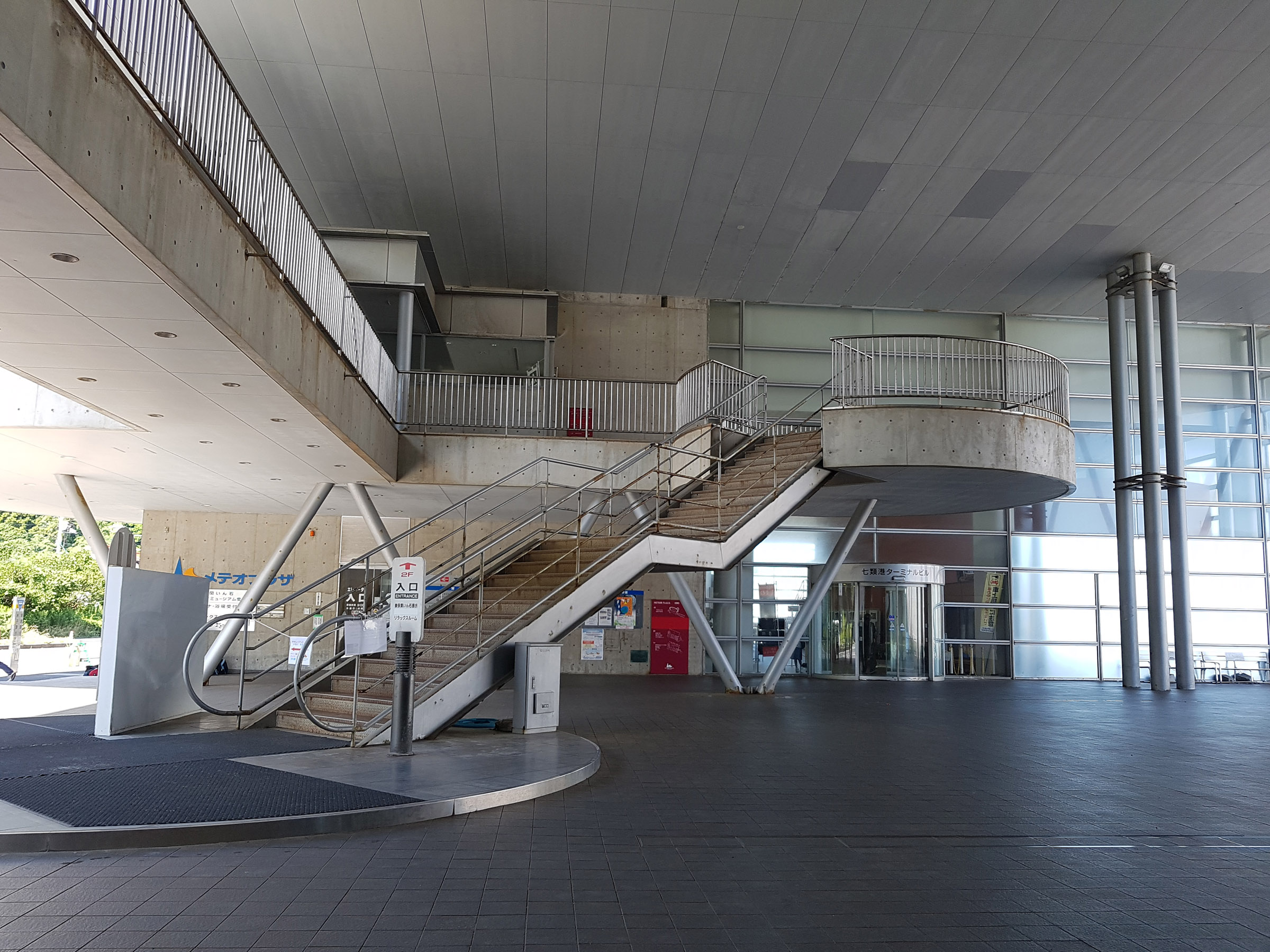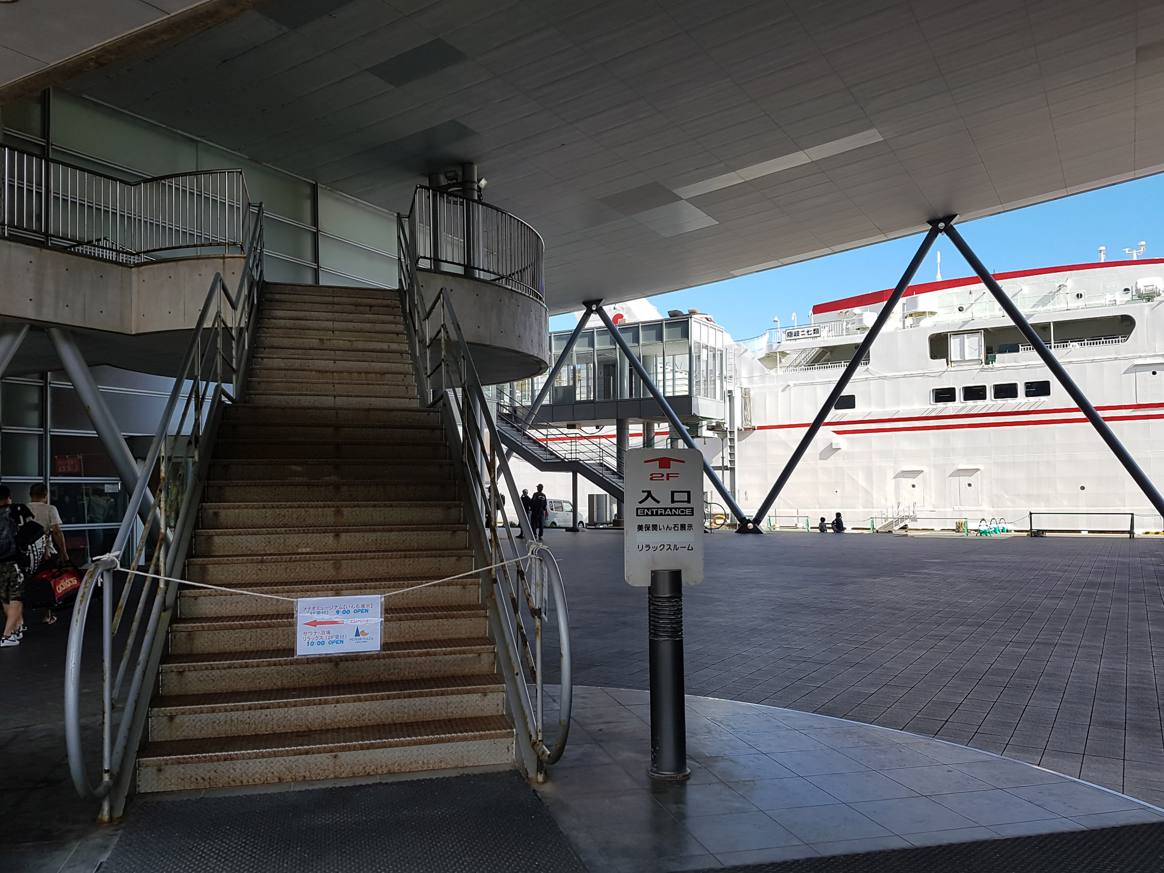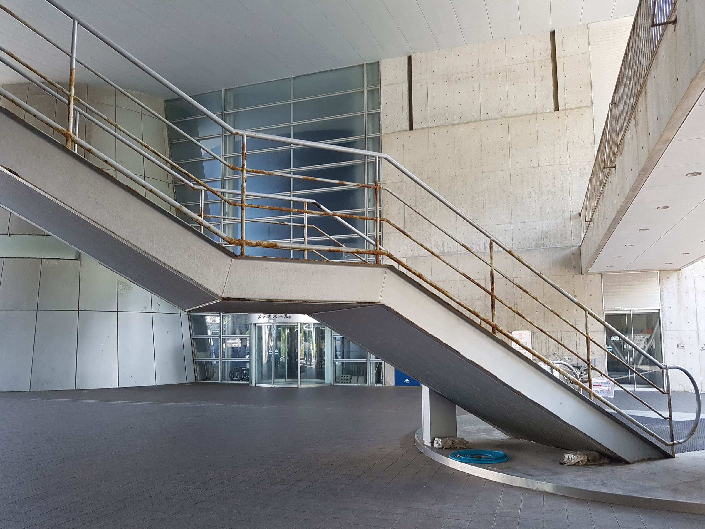 중앙 홀에서 메테오 플라자 동측 동(棟)을 바라 봄. 서측동과는 2층 브릿지로 연결되어 있다. 원추형 공간은 리셉션실. 페리를 기다리는 어머니와 남매. 사선기둥에 어린 누나가 만화의 한 장면 같이 기대어 있다. 아래의 계단 사진도 그렇지만, 해수염해에 많이 녹이 슬어있는 것을 볼 수 있다.