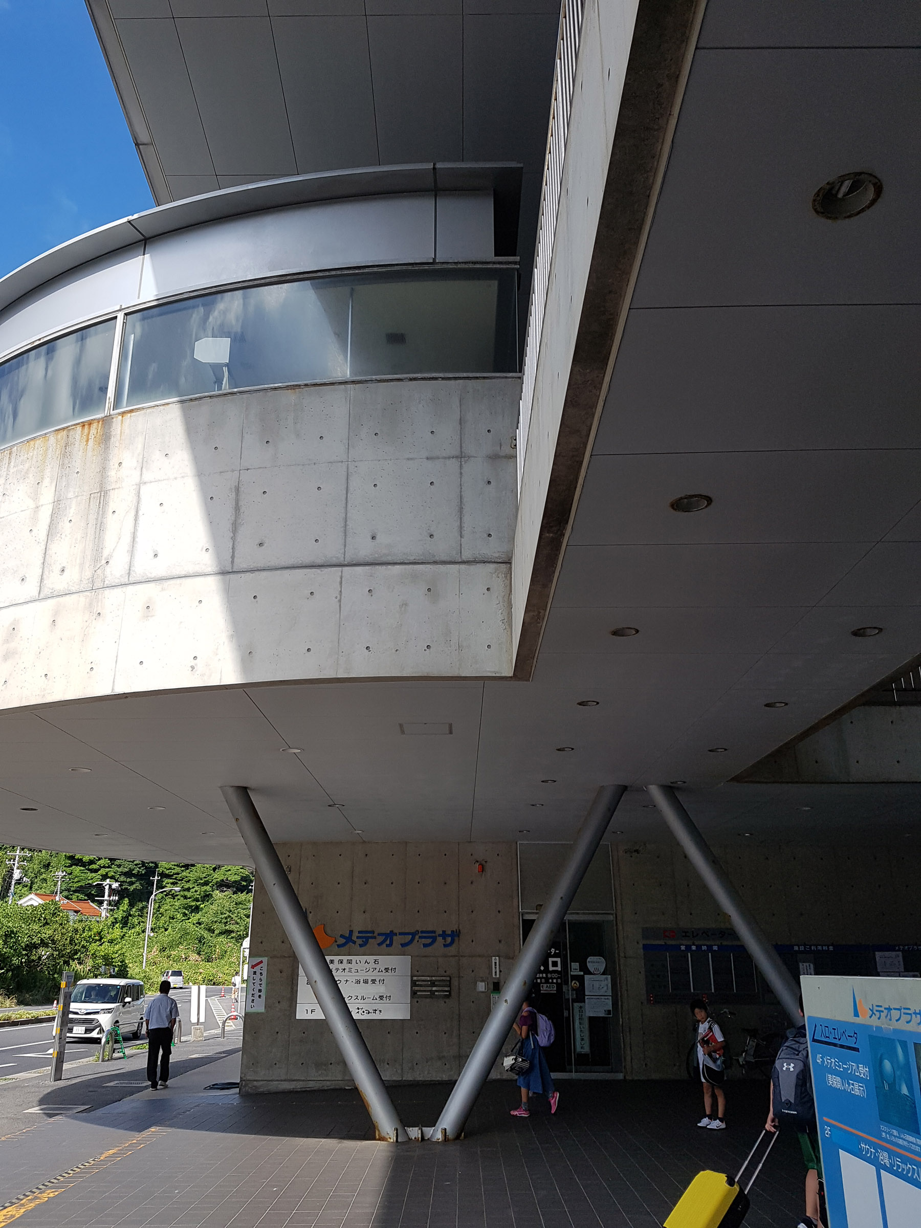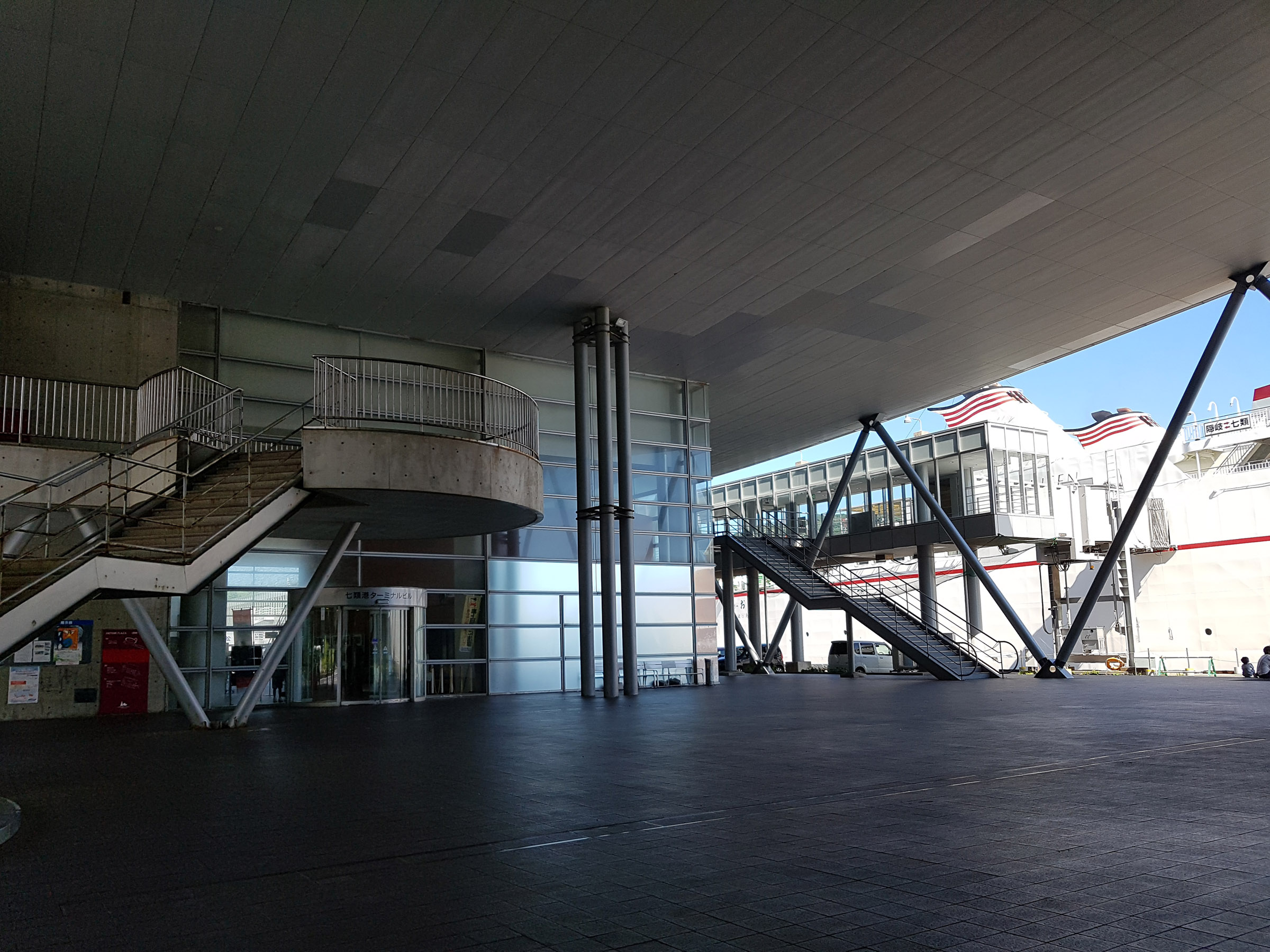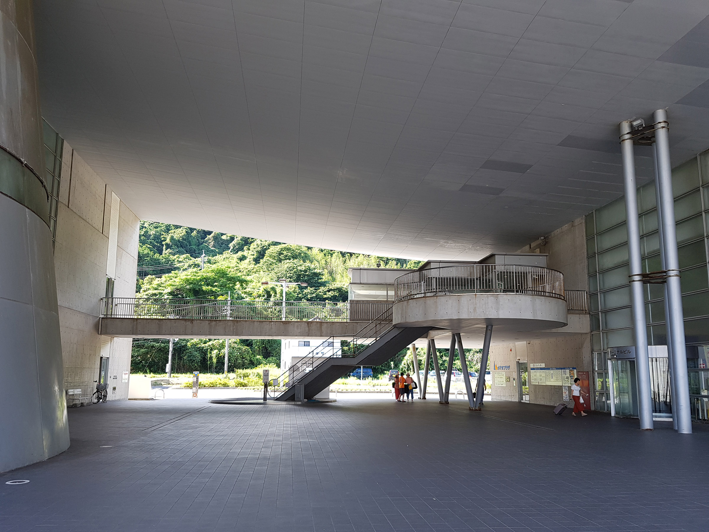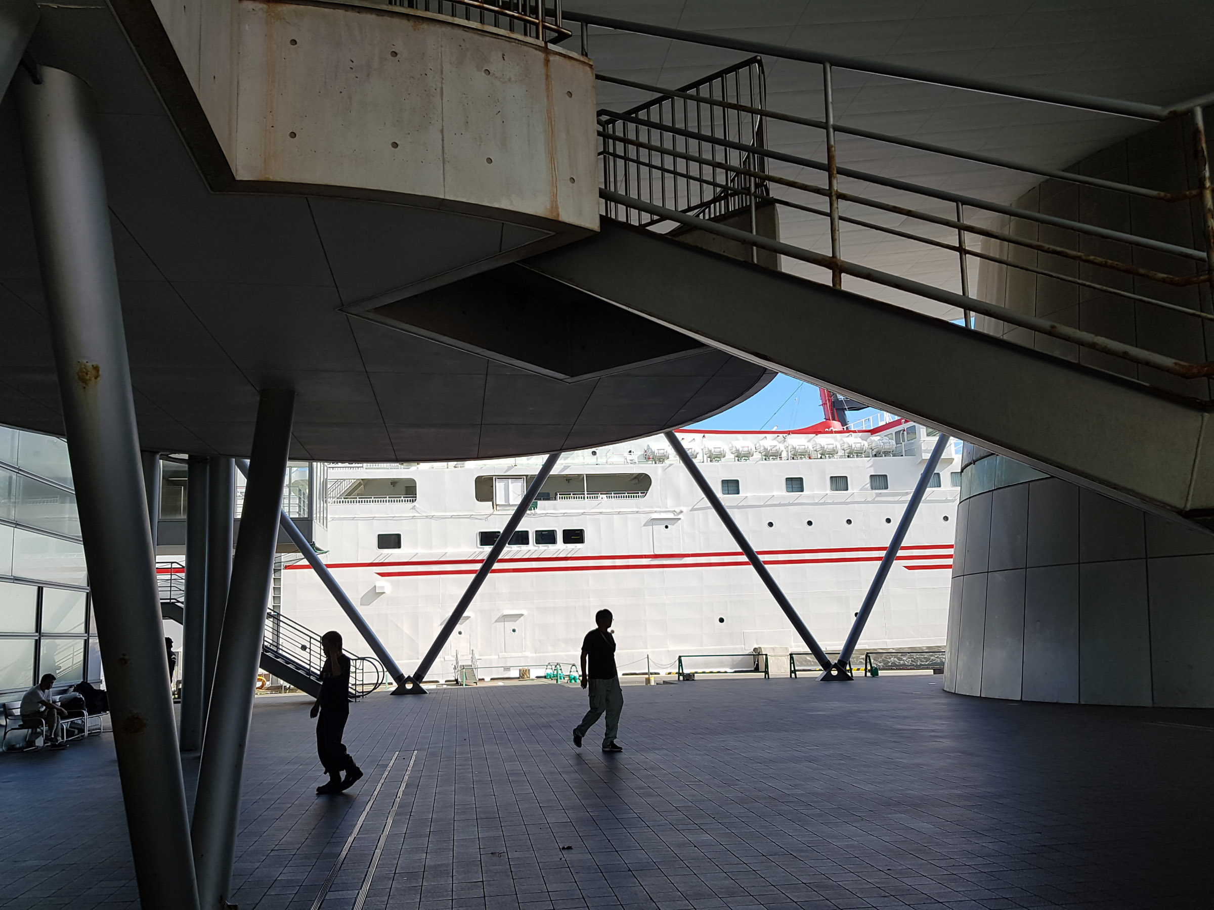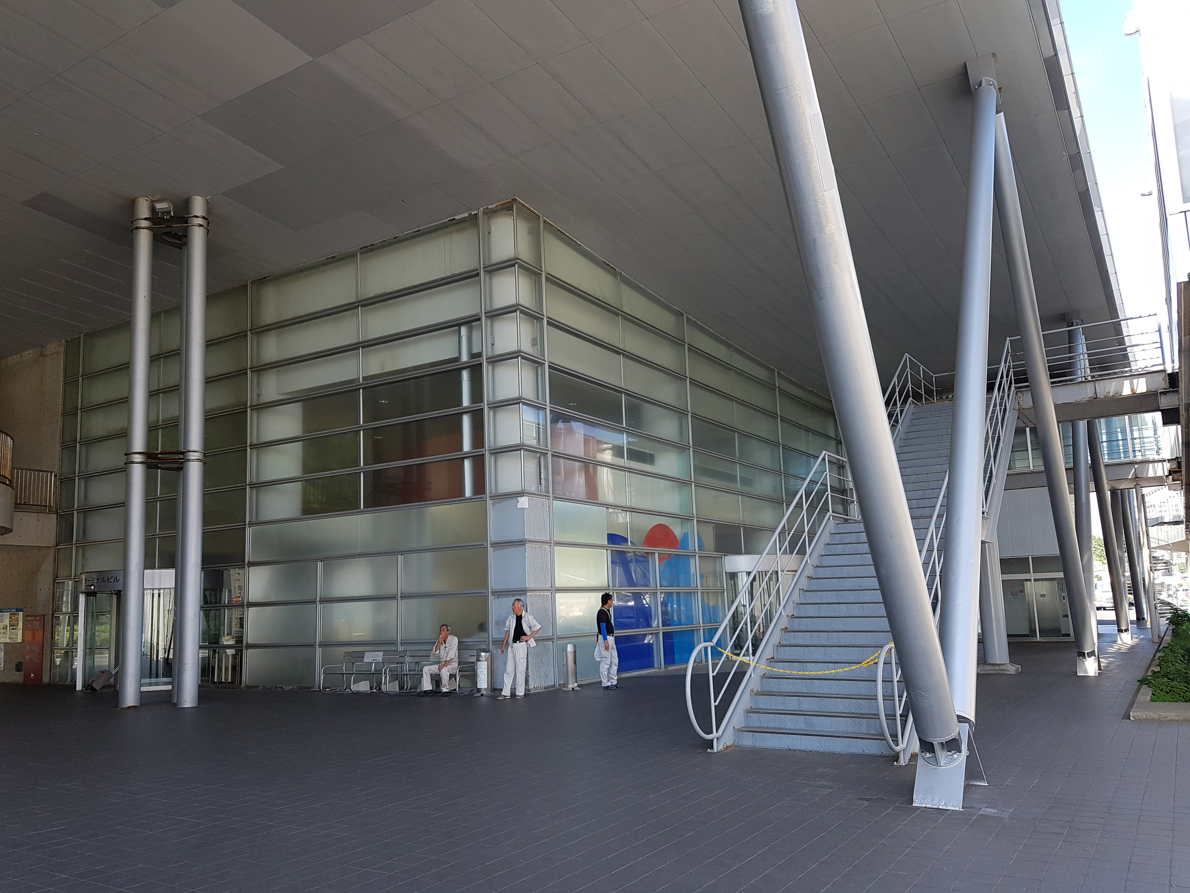 중앙 홀에서 메테오 플라자 동측 동(棟)을 바라 봄. 서측동과는 2층 브릿지로 연결되어 있다. 원추형 공간은 리셉션실. 페리를 기다리는 어머니와 남매. 사선기둥에 어린 누나가 만화의 한 장면 같이 기대어 있다. 아래의 계단 사진도 그렇지만, 해수염해에 많이 녹이 슬어있는 것을 볼 수 있다.