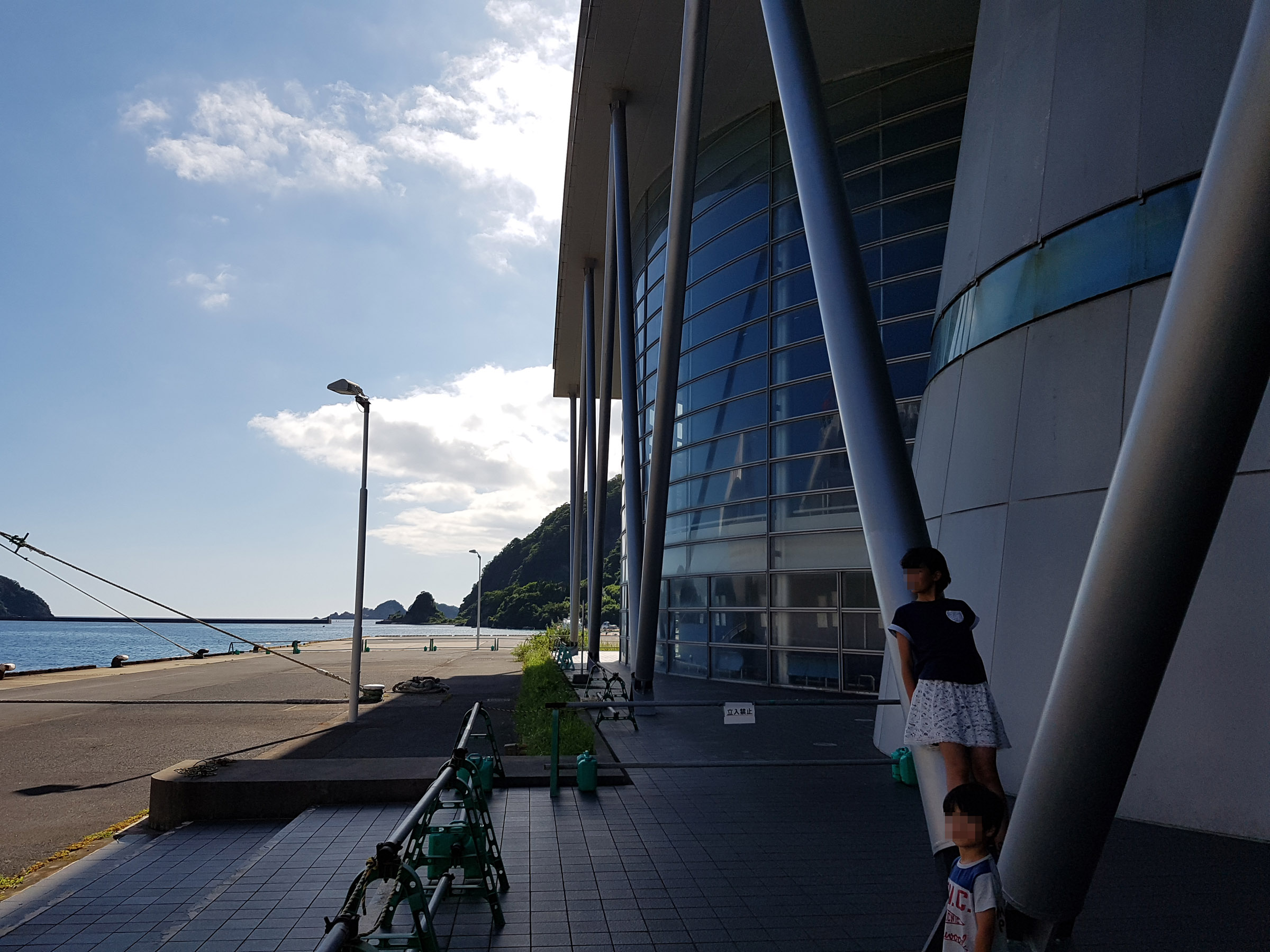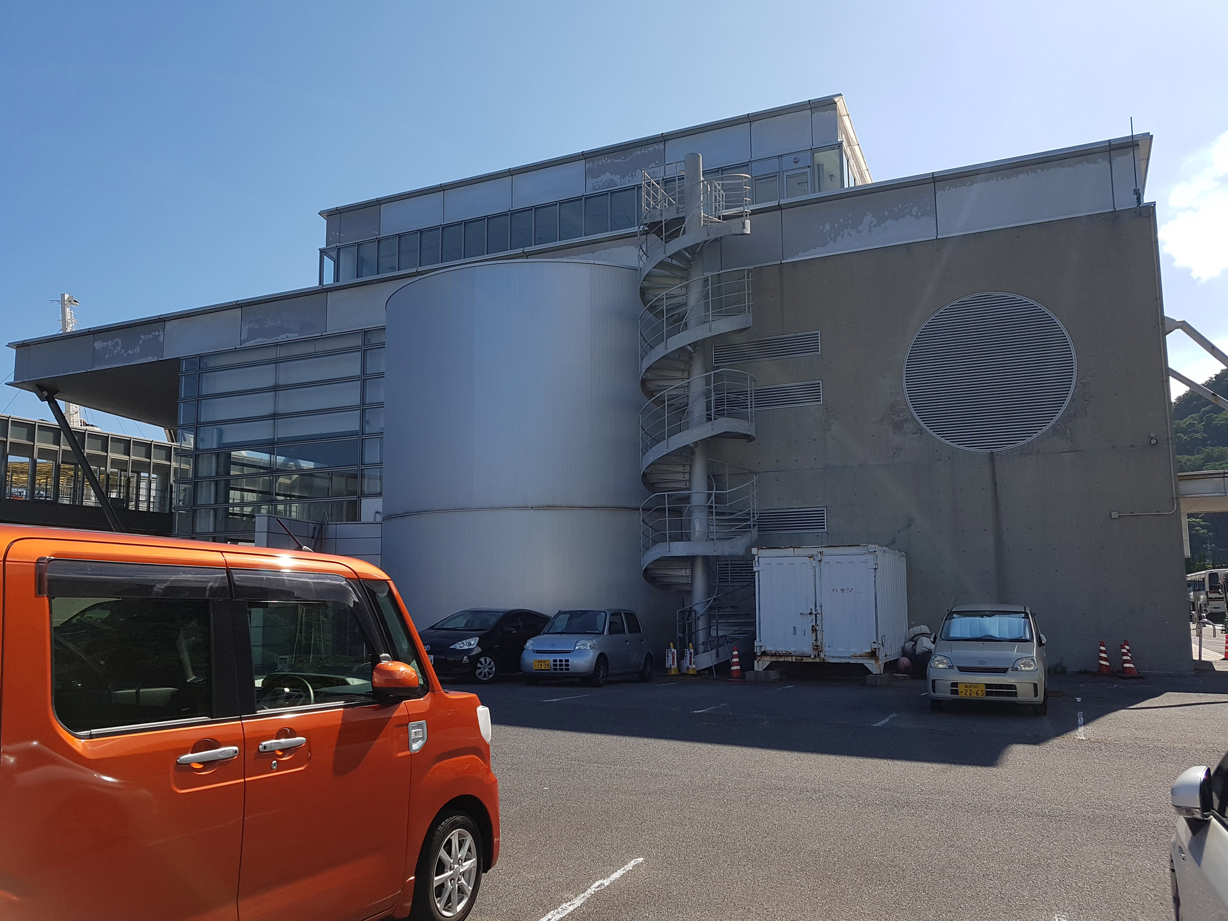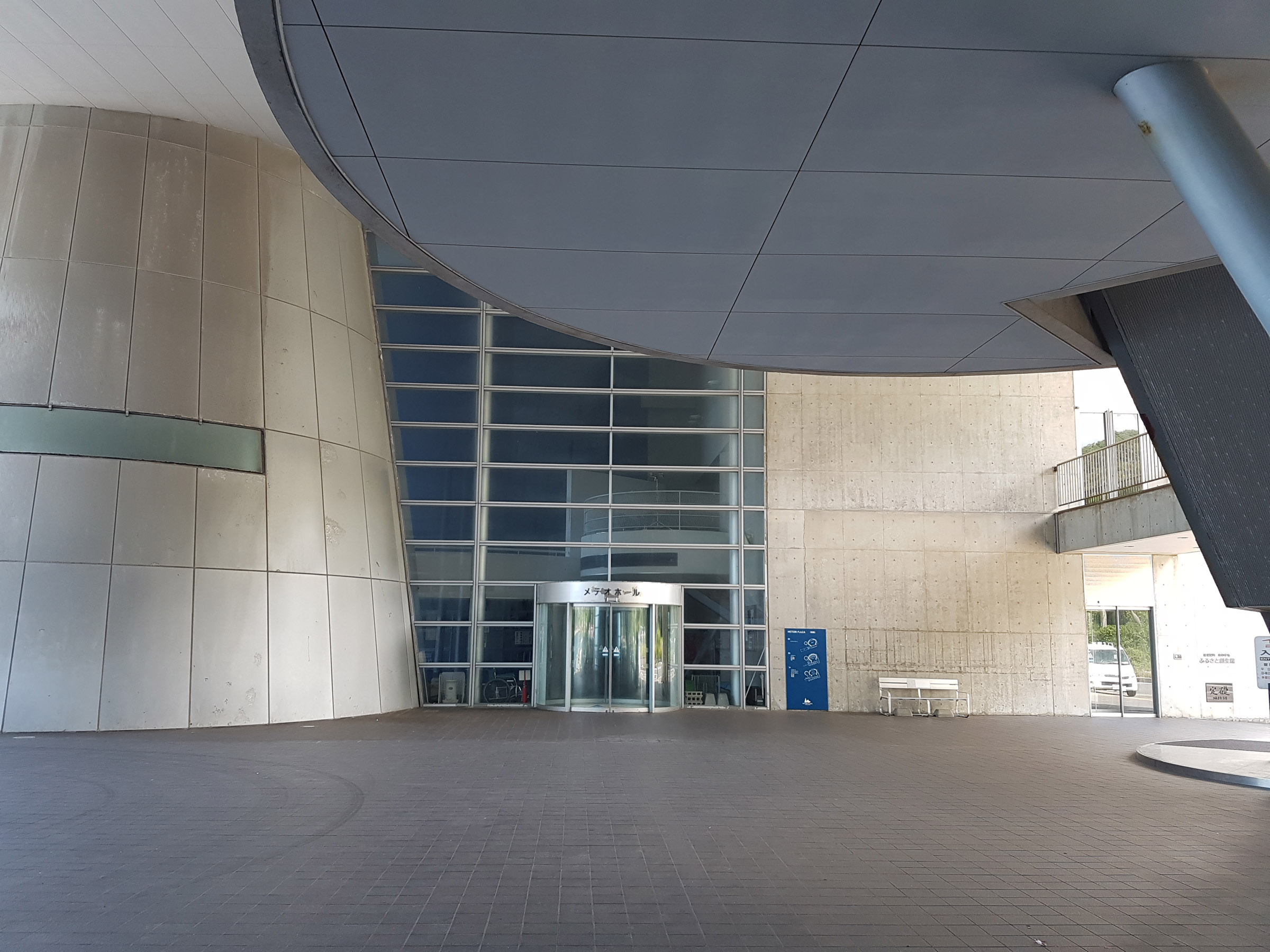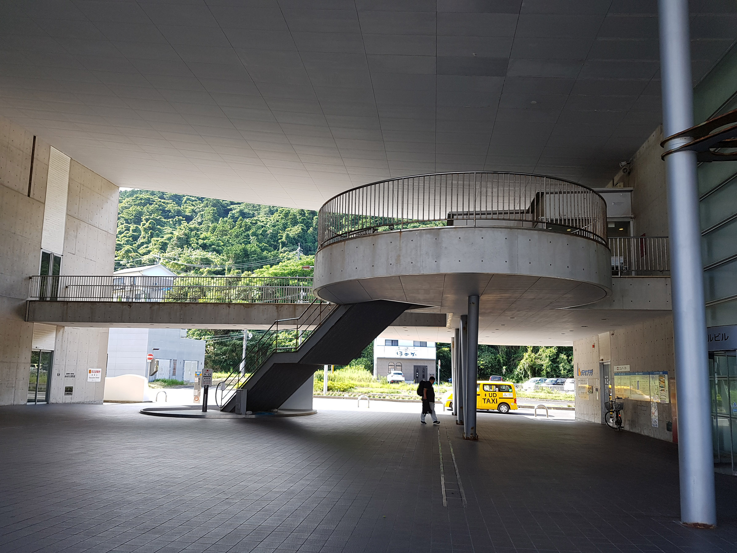 중앙 홀에서 메테오 플라자 동측 동(棟)을 바라 봄. 서측동과는 2층 브릿지로 연결되어 있다. 원추형 공간은 리셉션실. 페리를 기다리는 어머니와 남매. 사선기둥에 어린 누나가 만화의 한 장면 같이 기대어 있다. 아래의 계단 사진도 그렇지만, 해수염해에 많이 녹이 슬어있는 것을 볼 수 있다.