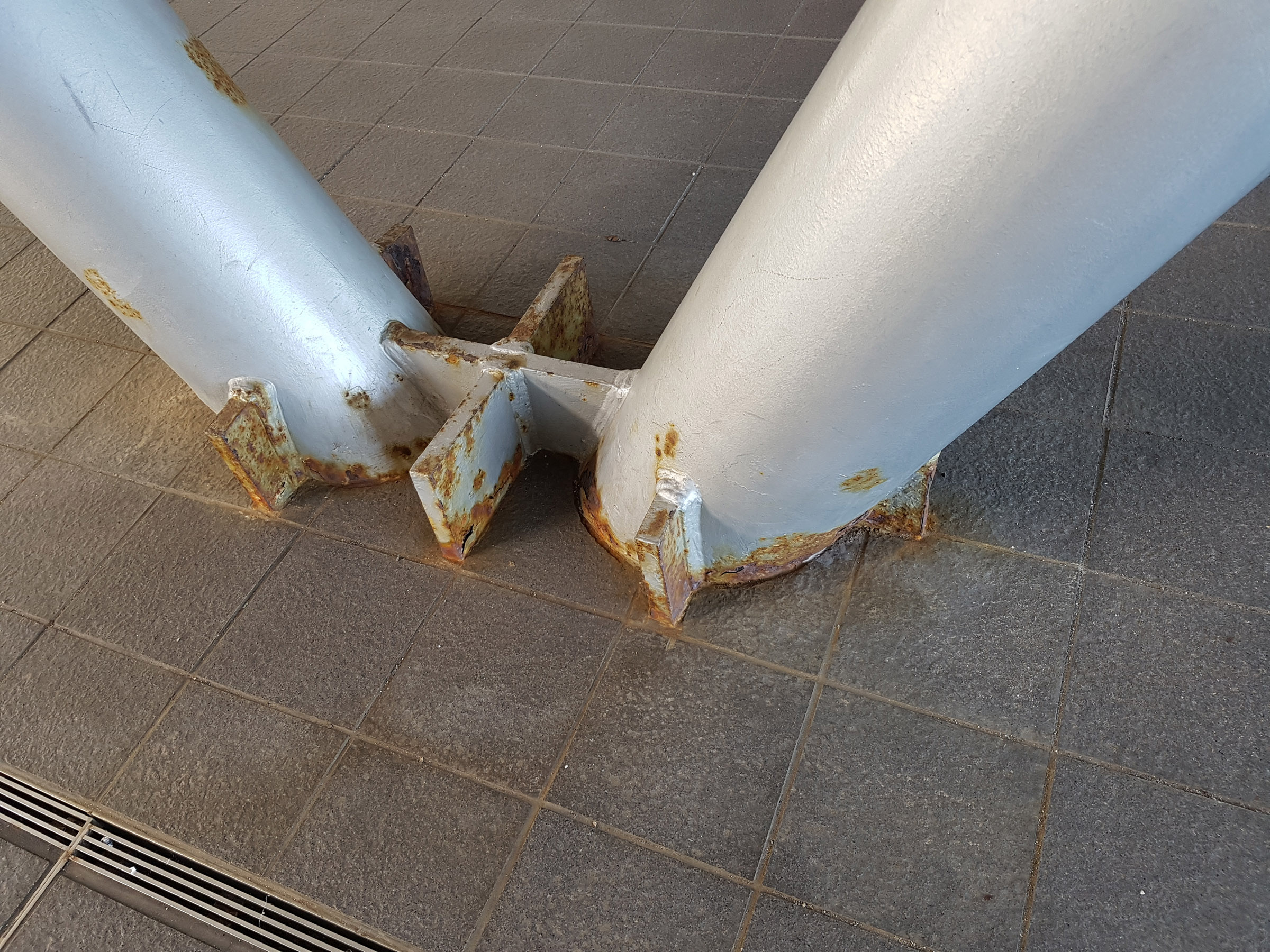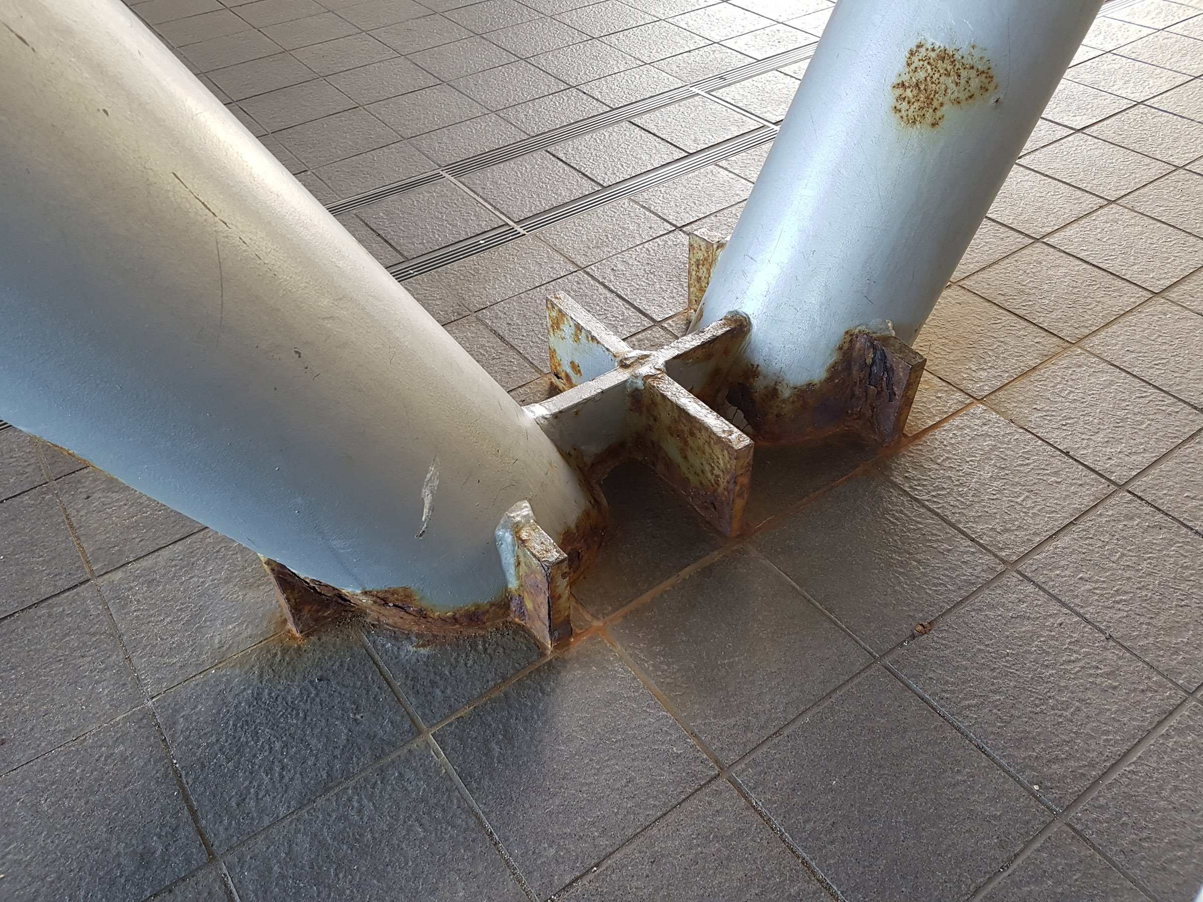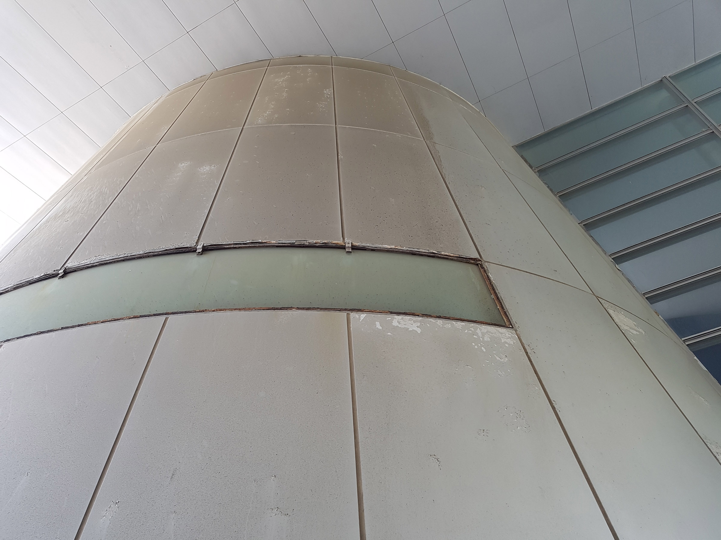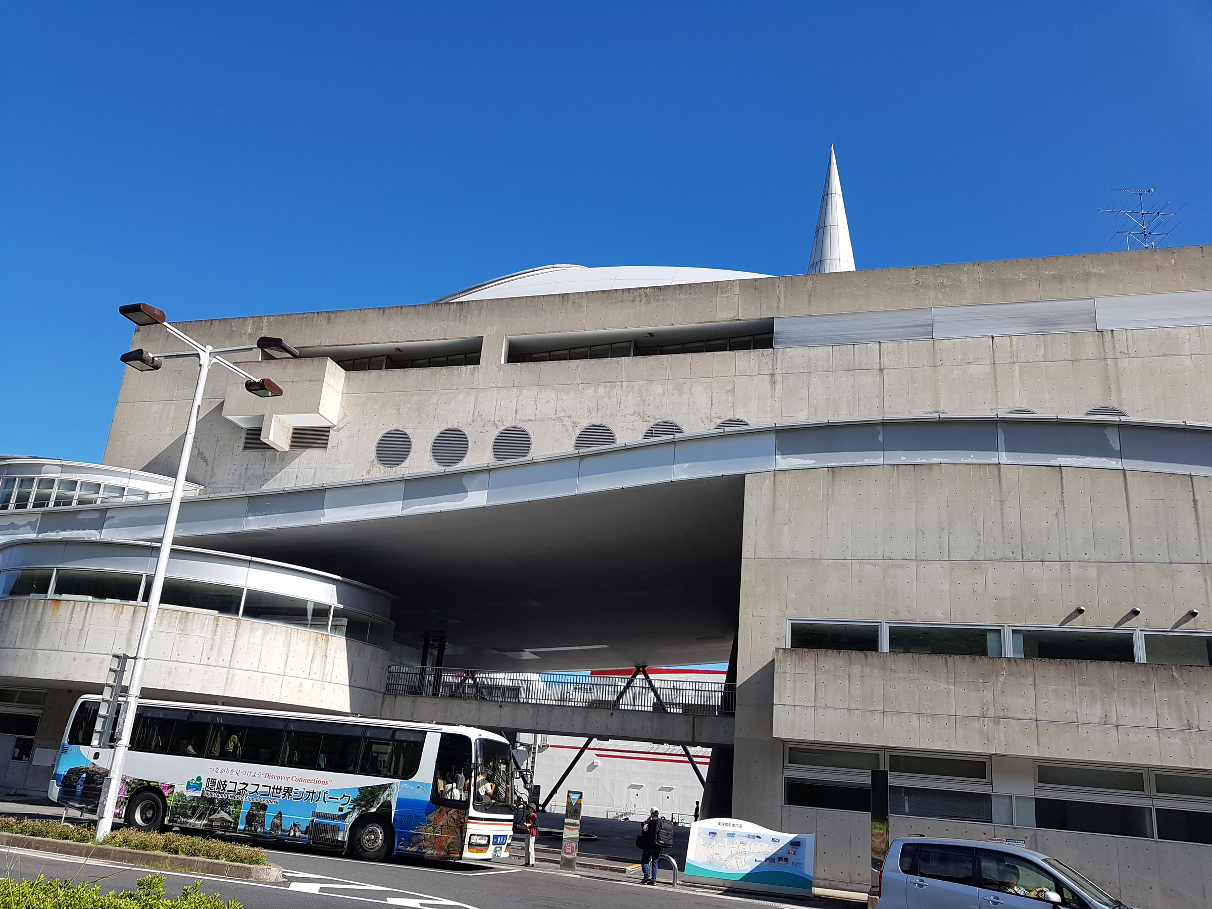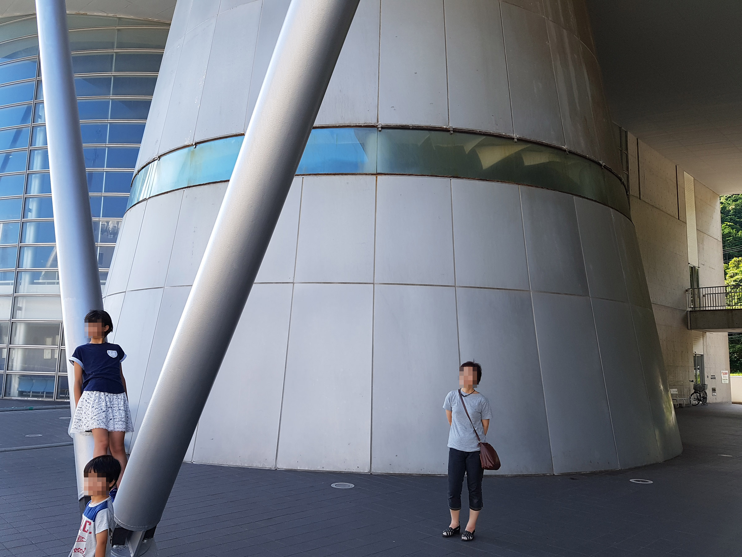 중앙 홀에서 메테오 플라자 동측 동(棟)을 바라 봄. 서측동과는 2층 브릿지로 연결되어 있다. 원추형 공간은 리셉션실. 페리를 기다리는 어머니와 남매. 사선기둥에 어린 누나가 만화의 한 장면 같이 기대어 있다. 아래의 계단 사진도 그렇지만, 해수염해에 많이 녹이 슬어있는 것을 볼 수 있다.