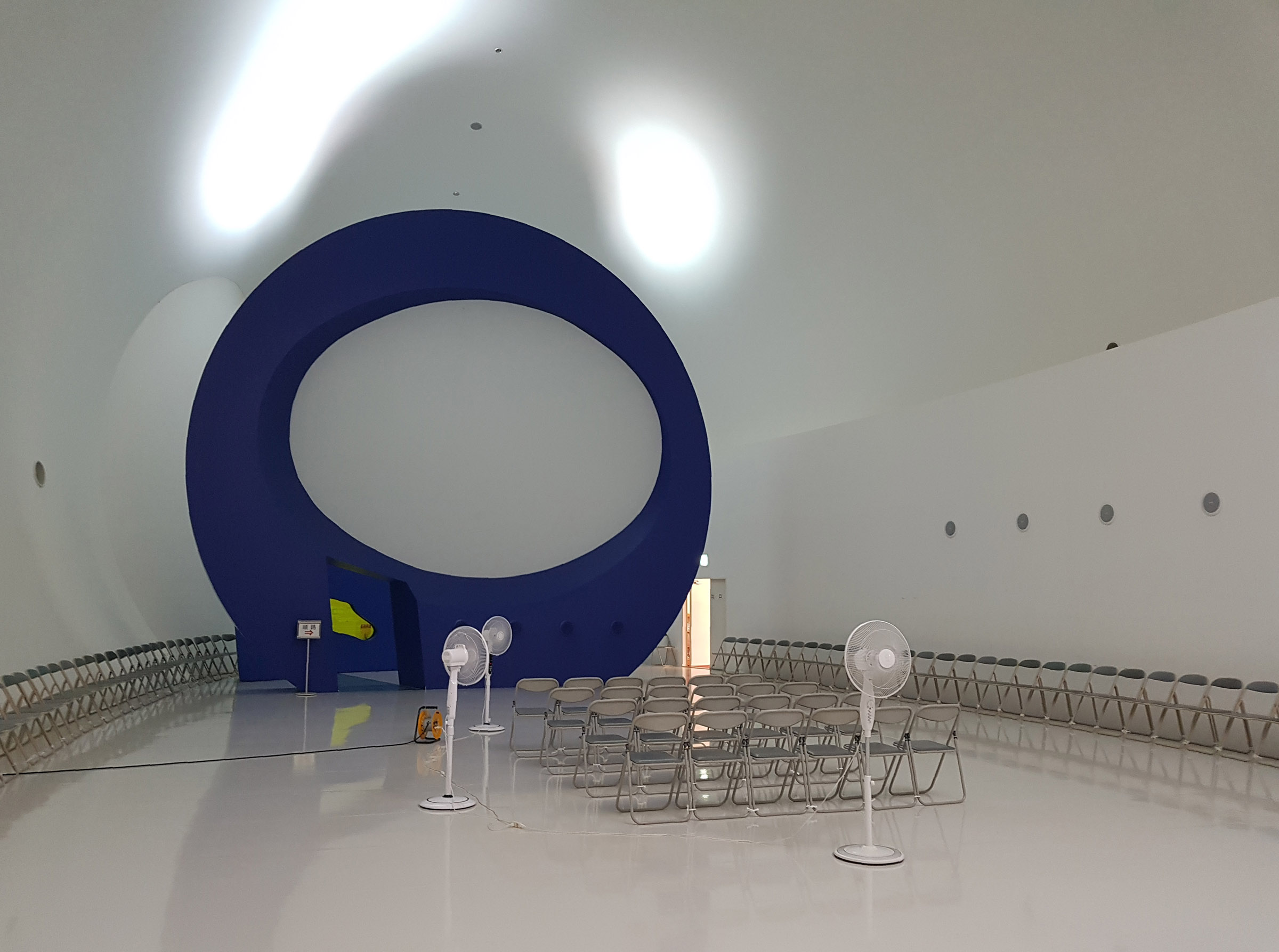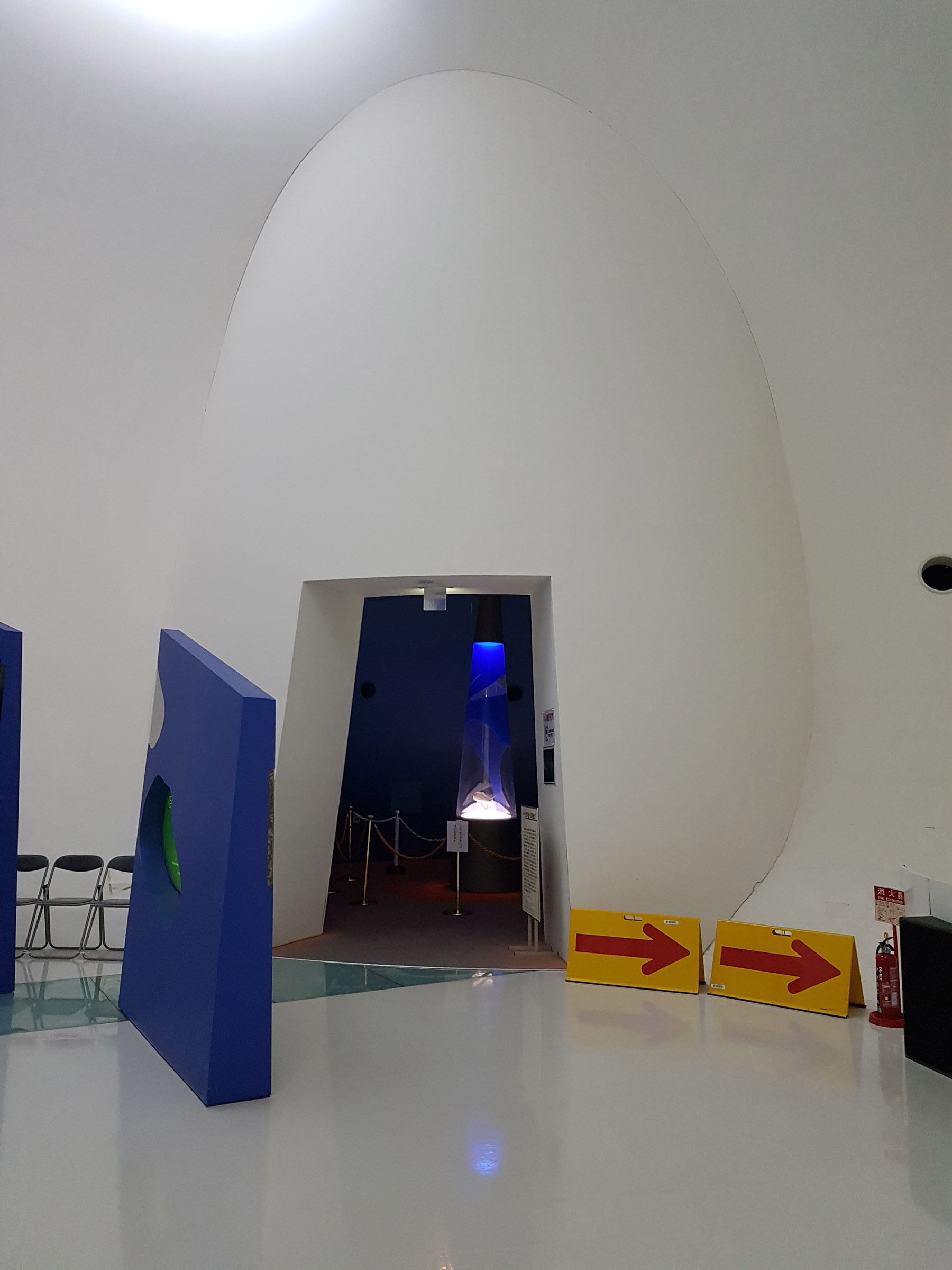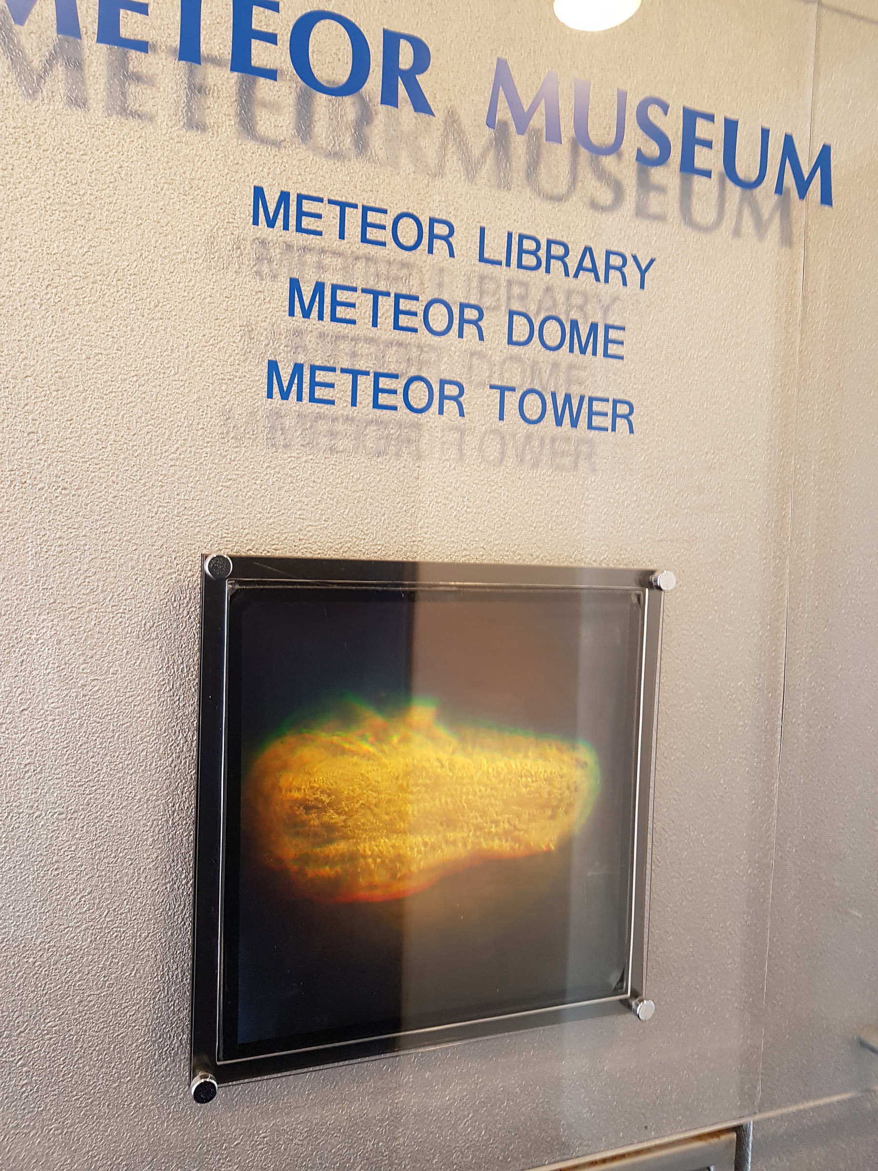 4층의 운석 박물관 메테오 뮤지엄 영상 전시실. 바깥에서 바라보던 운석 모양의 타원체 외형을 그대로 내부공간에서 감지할 수있다.