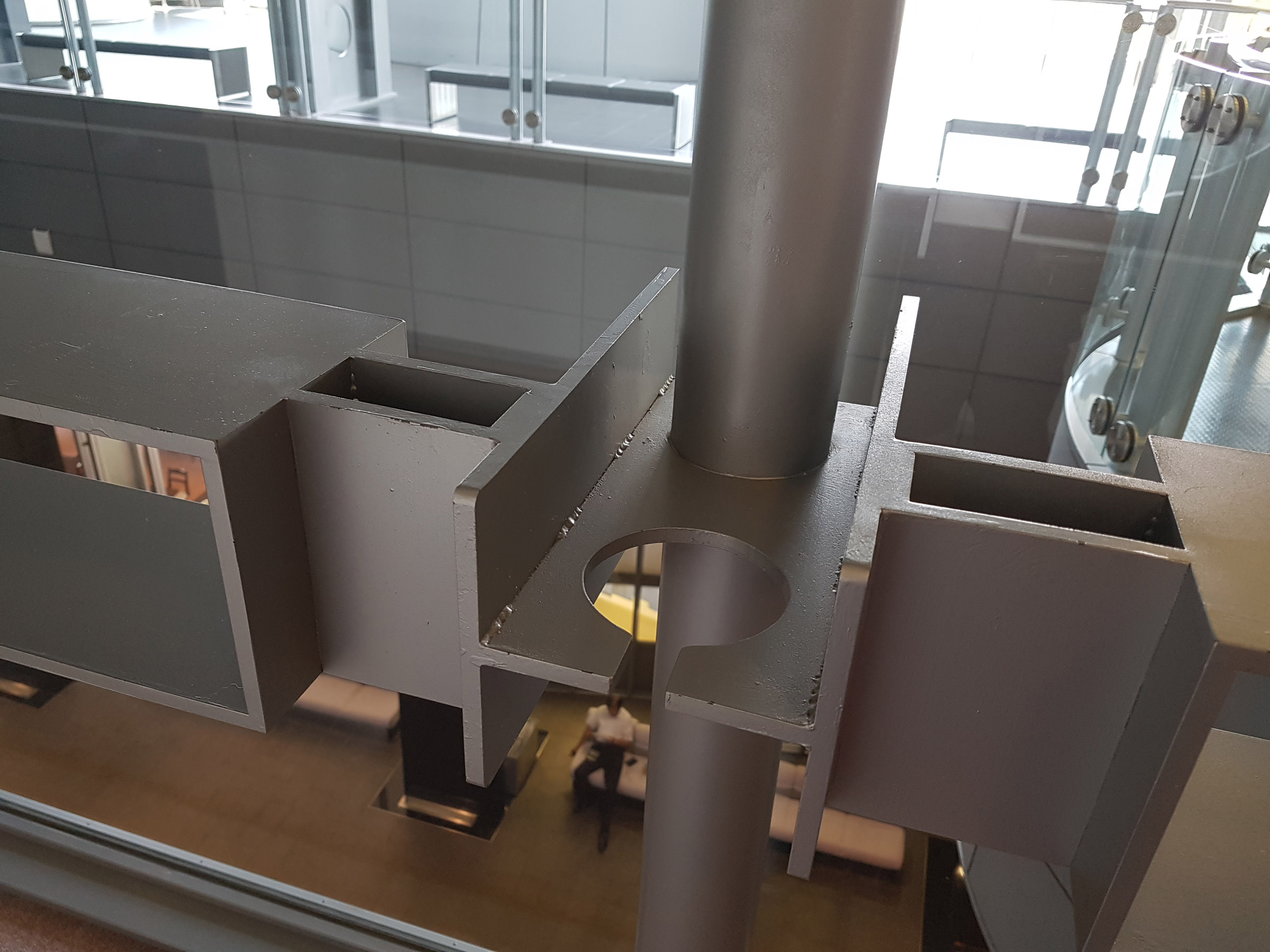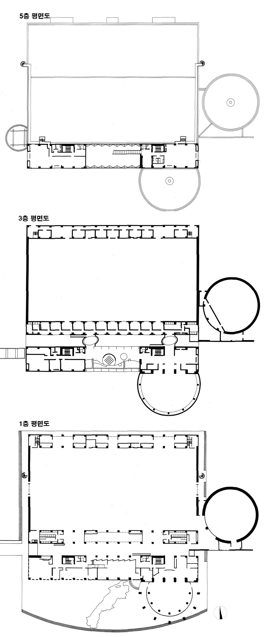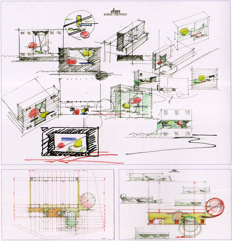 이들의 제기능을 합리적인 공간구성으로 통합하는 것을 목적으로 직방형의 대공간인 메인 전시장을 북측에 배치하고, 남측의 세장형 1스팬에 사무실, 회의실을 6개층에 적층시켜 배치했다.