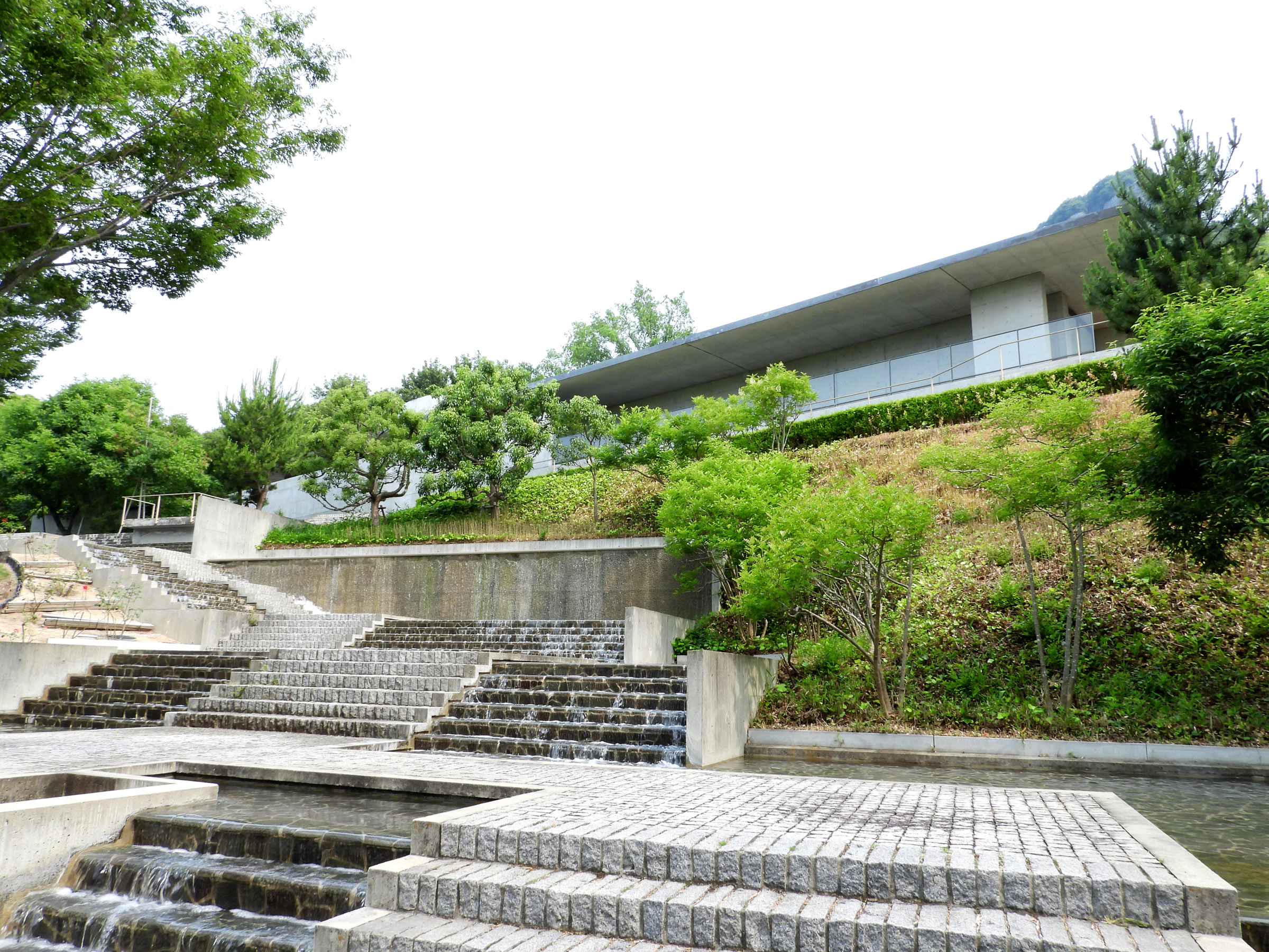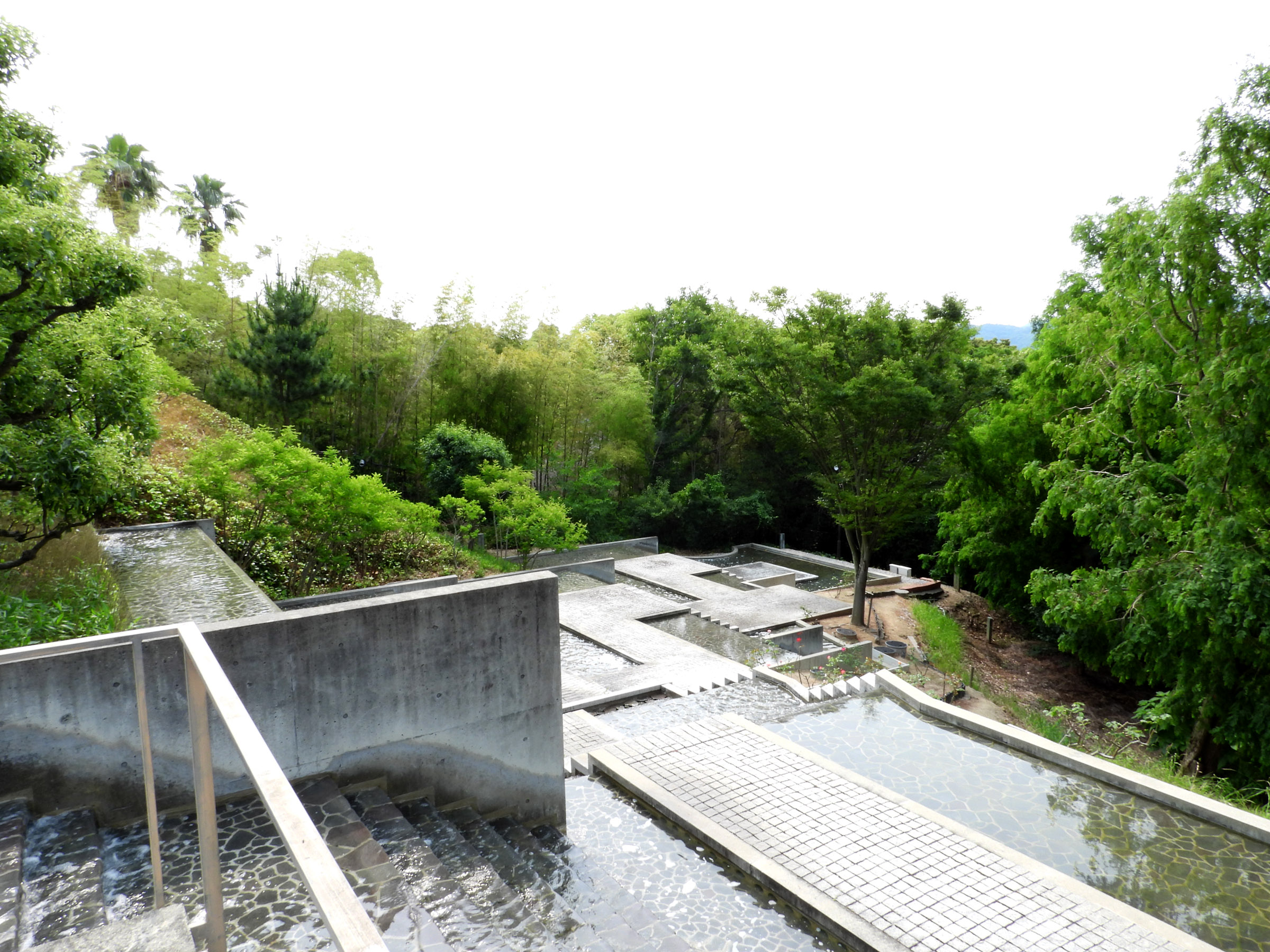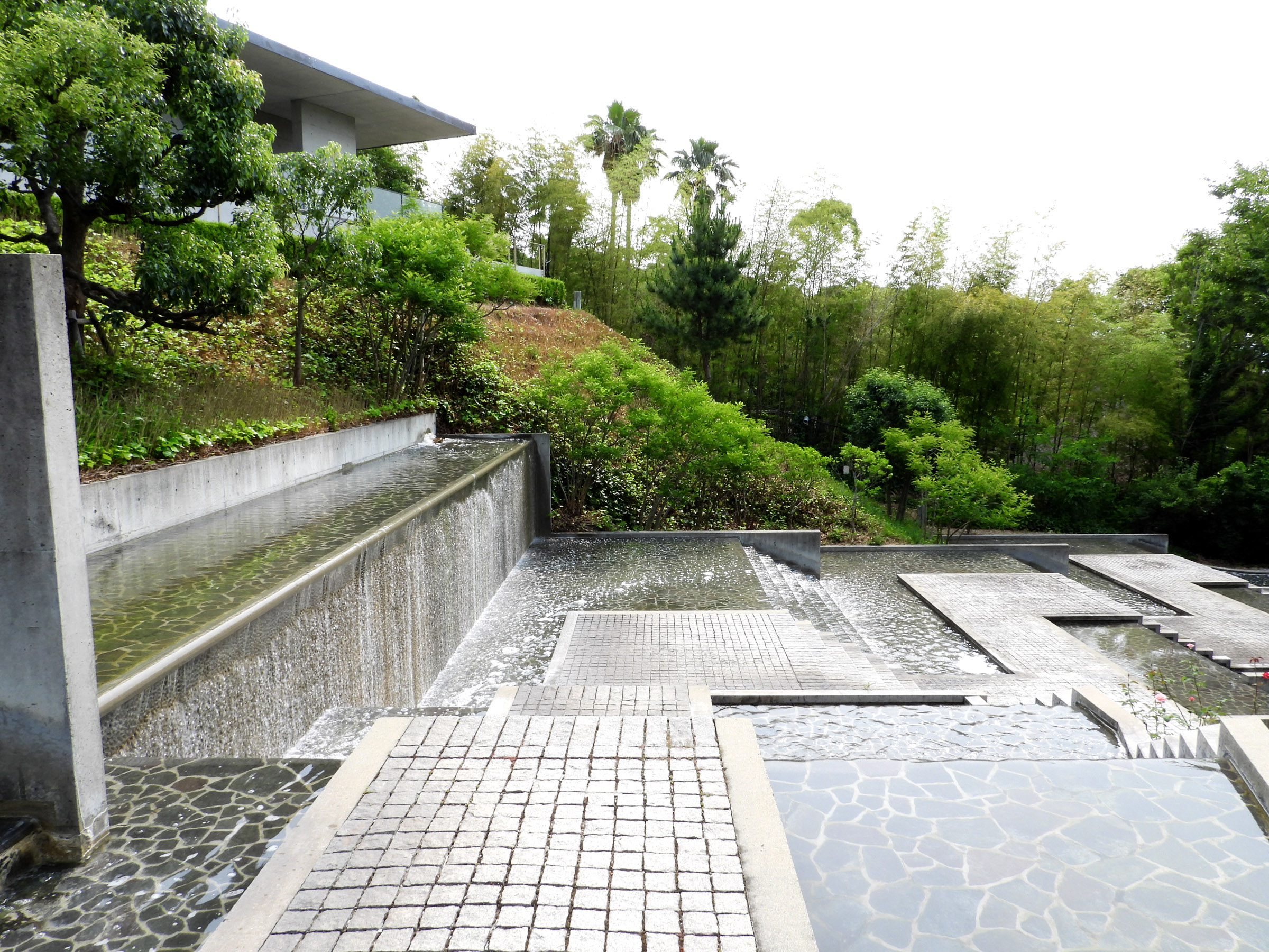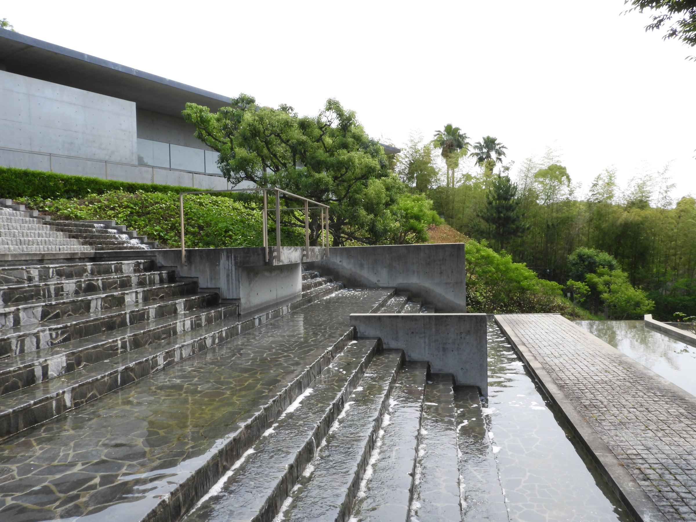 관람을 마치고 마지막에 갤러리의 문을 열고 밖으로 나오면 갑자기 조용하던 주위가 계곡을 흐르는듯한 물소리로 가득차는데, 고개를 돌리는 순간 눈 앞에 펼쳐지는 계단식 인공 폭포 정원(수경정원水景庭園)은 시코쿠 갤러리의 가장 큰 특징이라고 할 수 있다.