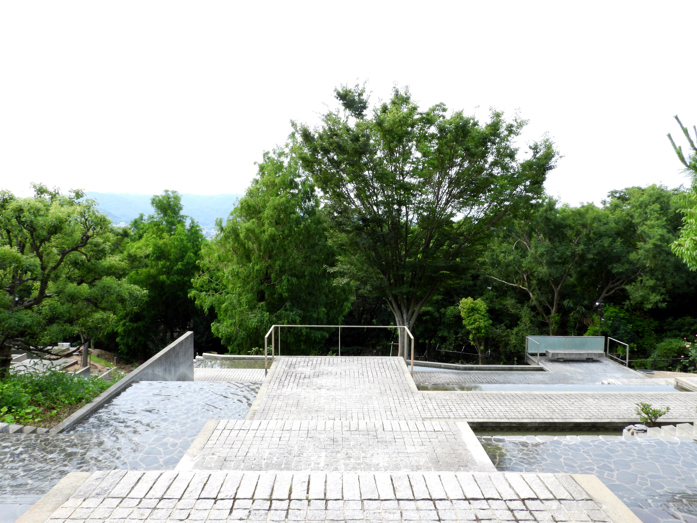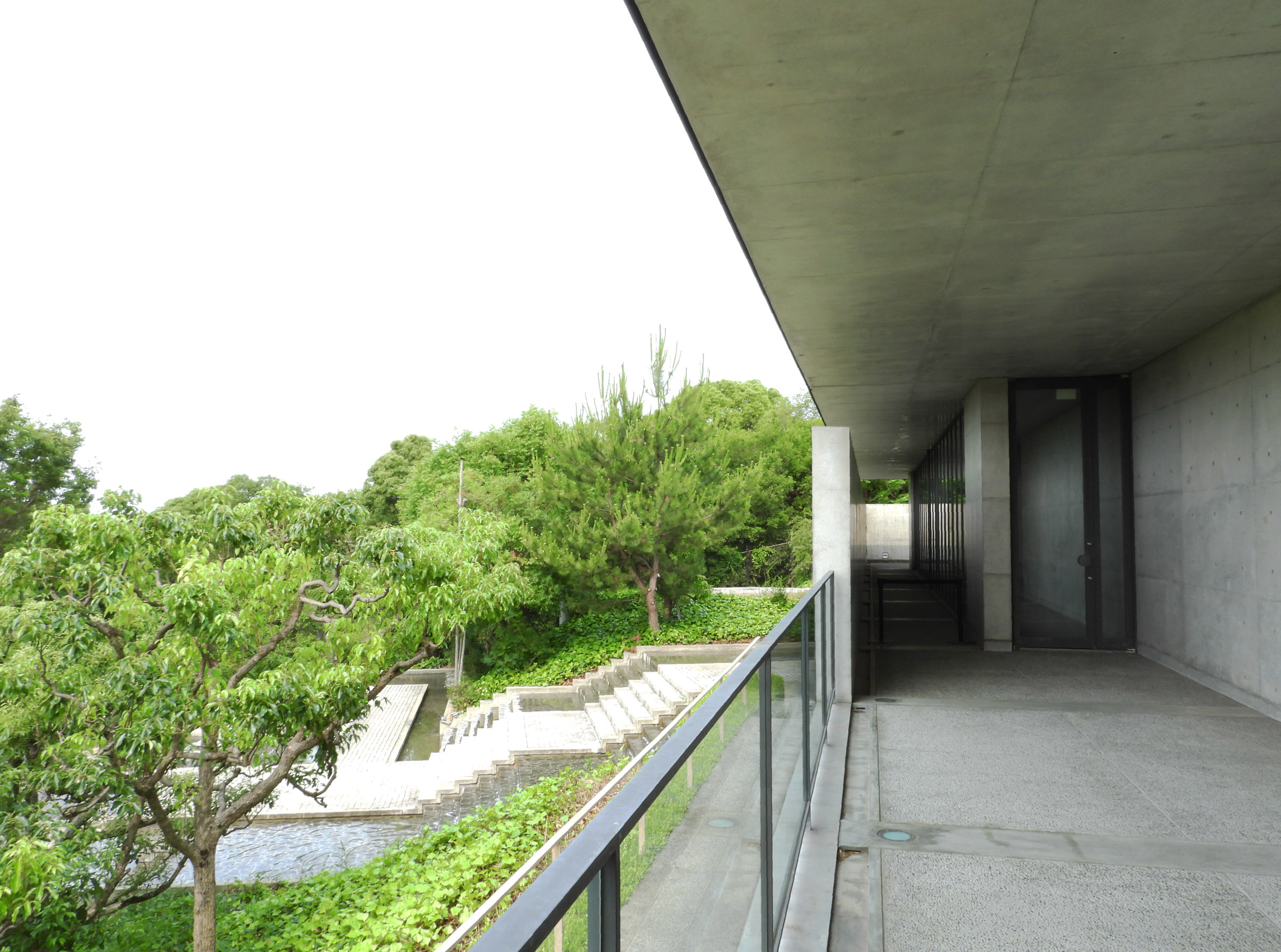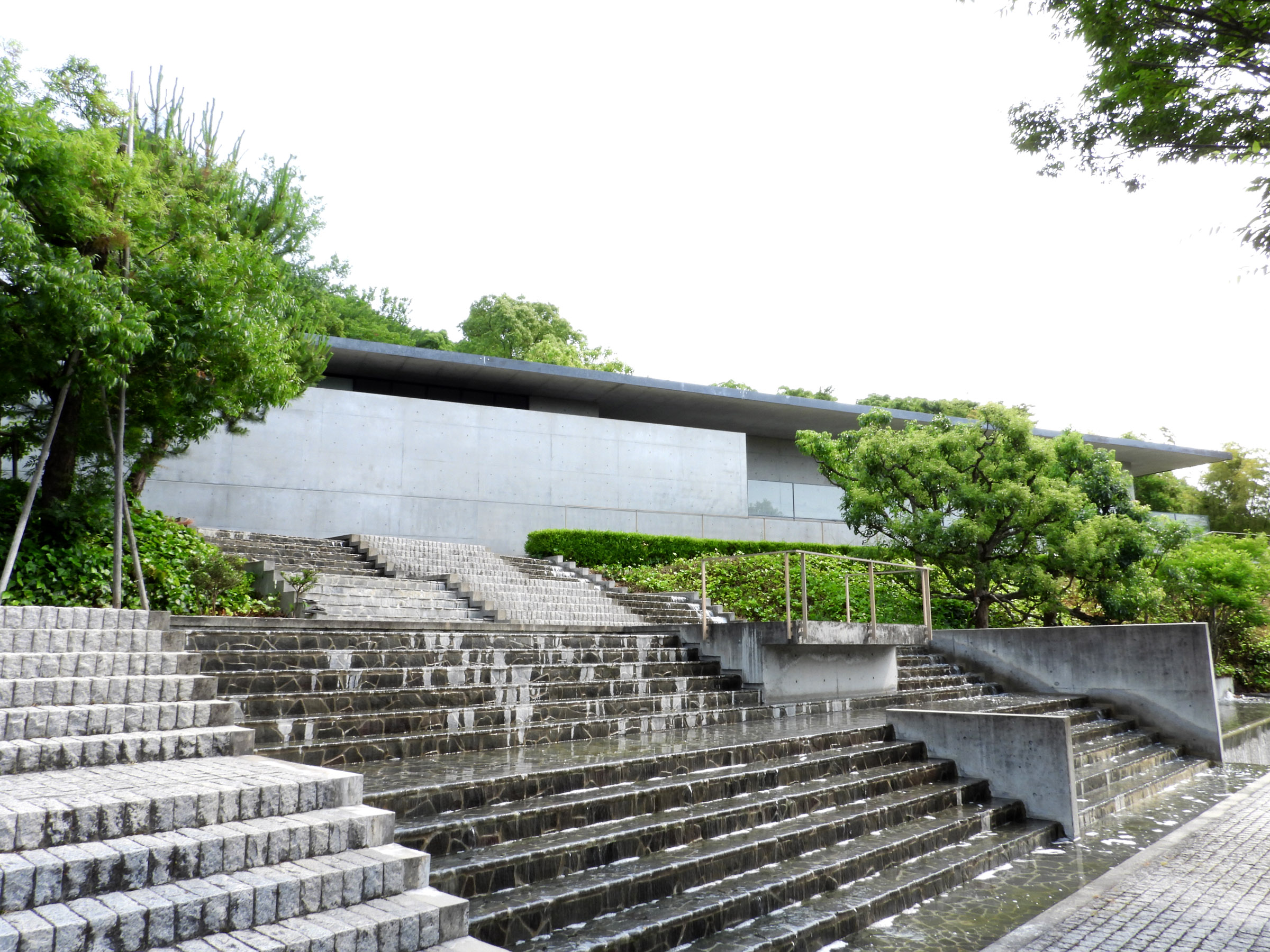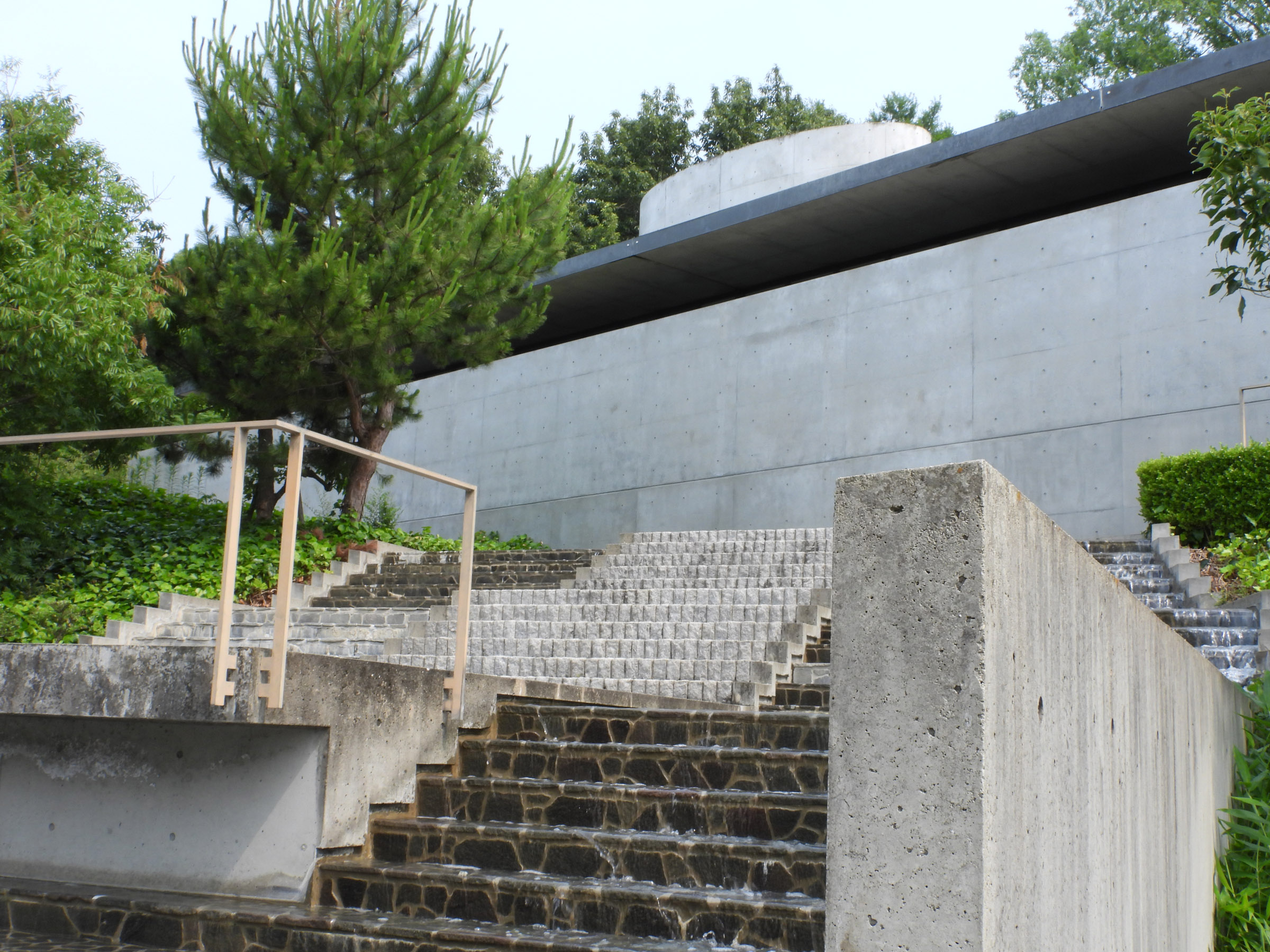 관람을 마치고 마지막에 갤러리의 문을 열고 밖으로 나오면 갑자기 조용하던 주위가 계곡을 흐르는듯한 물소리로 가득차는데, 고개를 돌리는 순간 눈 앞에 펼쳐지는 계단식 인공 폭포 정원(수경정원水景庭園)은 시코쿠 갤러리의 가장 큰 특징이라고 할 수 있다.