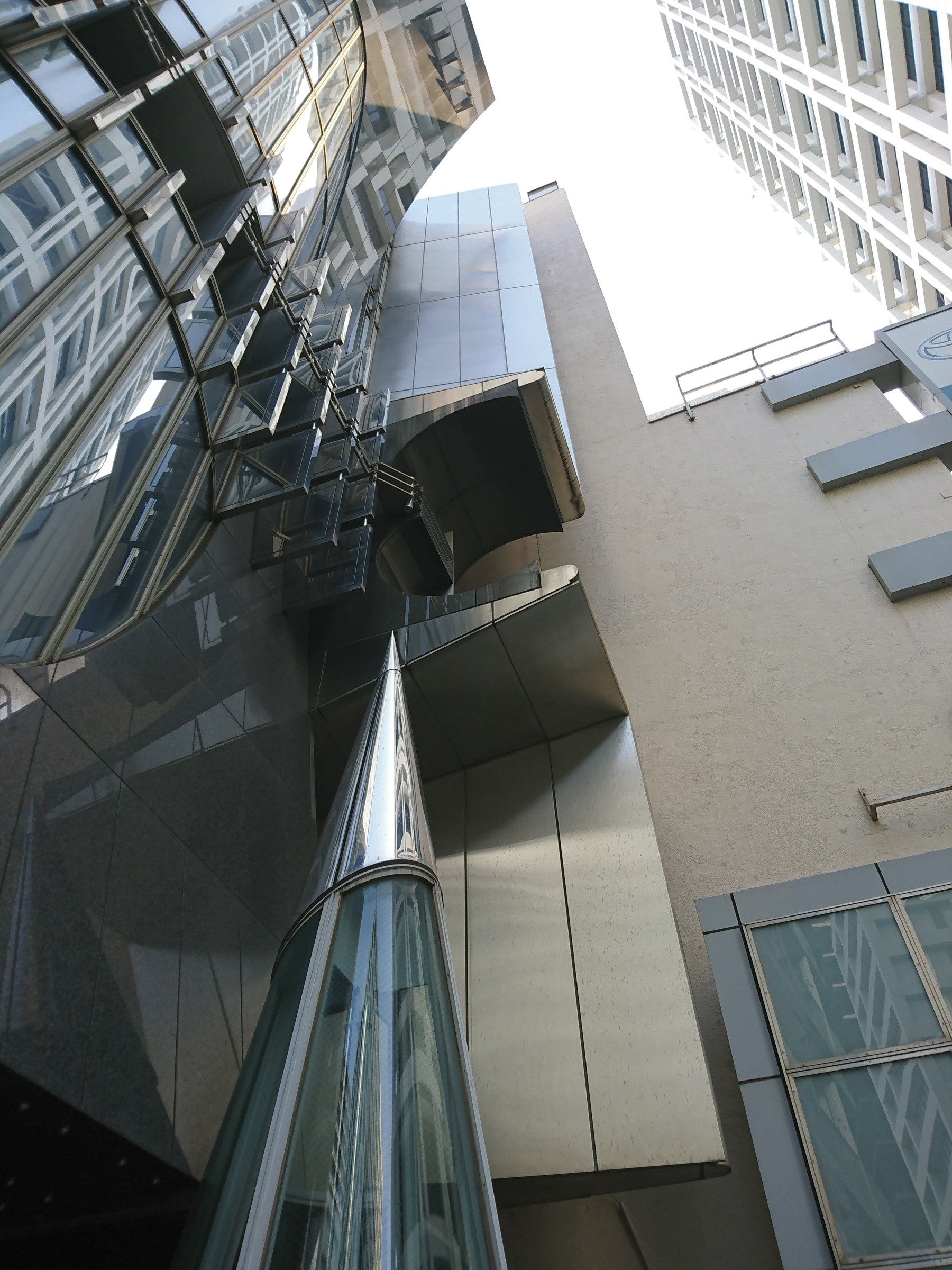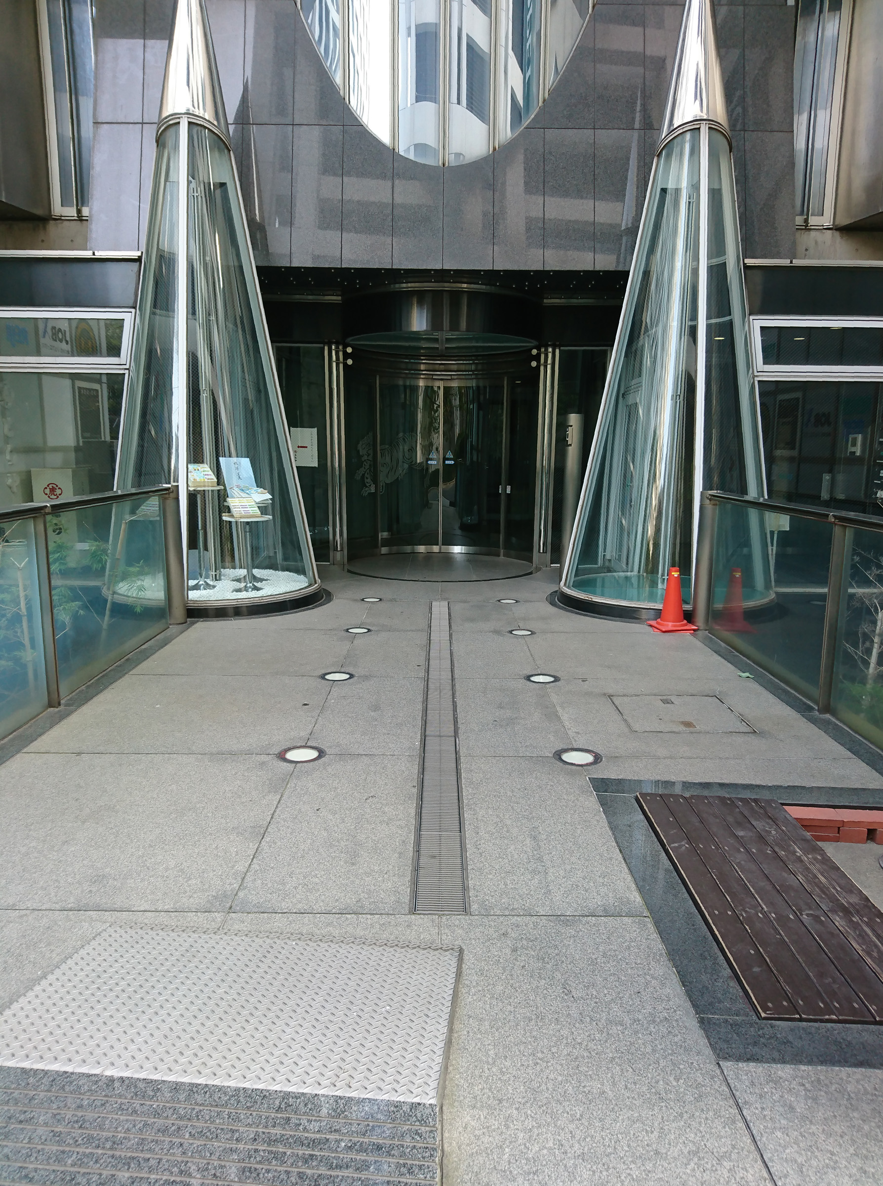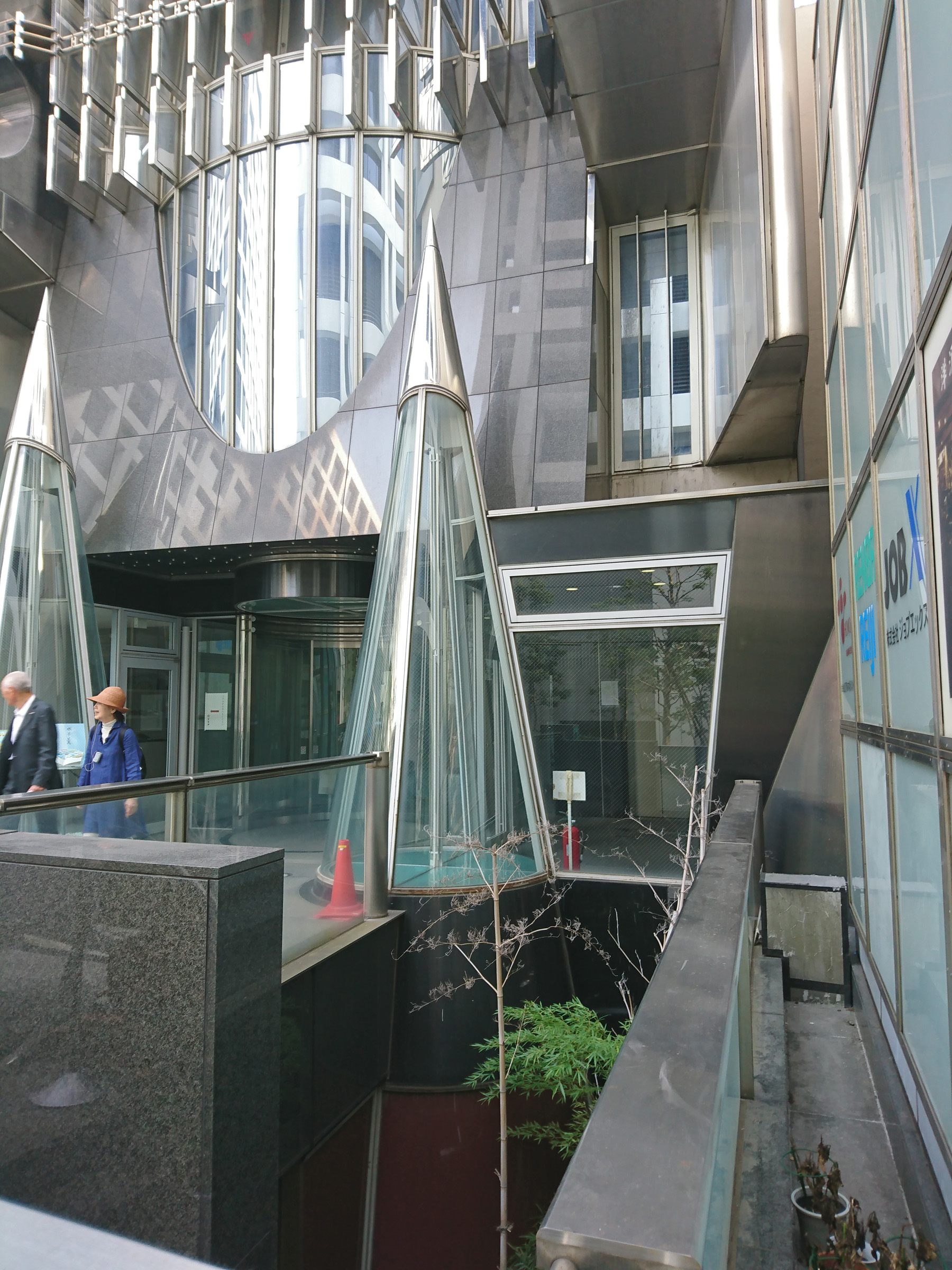지상에 설치된 2개의 원뿔에 이끌리면서 건물을 올려다 보면, 유리의 곡면, 금속 덩어리에서 잘라낸 것 같은 스테인레스 부품들, 그리고 곡선을 그리며 앞으로 밀쳐 내져지는 듯이 바싹 다가오는 검은 화강암(黒御影石) 벽면에 압도되어 버린다.