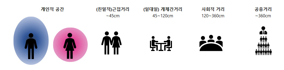 사적공간, 공용공간, 공공공간을 설계할 때 고려해야 할 환경 심리학의 기본으로, 사람과 사람 상호간의 심리적 거리에 대해서 배운 기억이 새삼스러워지는 코로나19가 초래한 사회 분위기의 요즘이다.