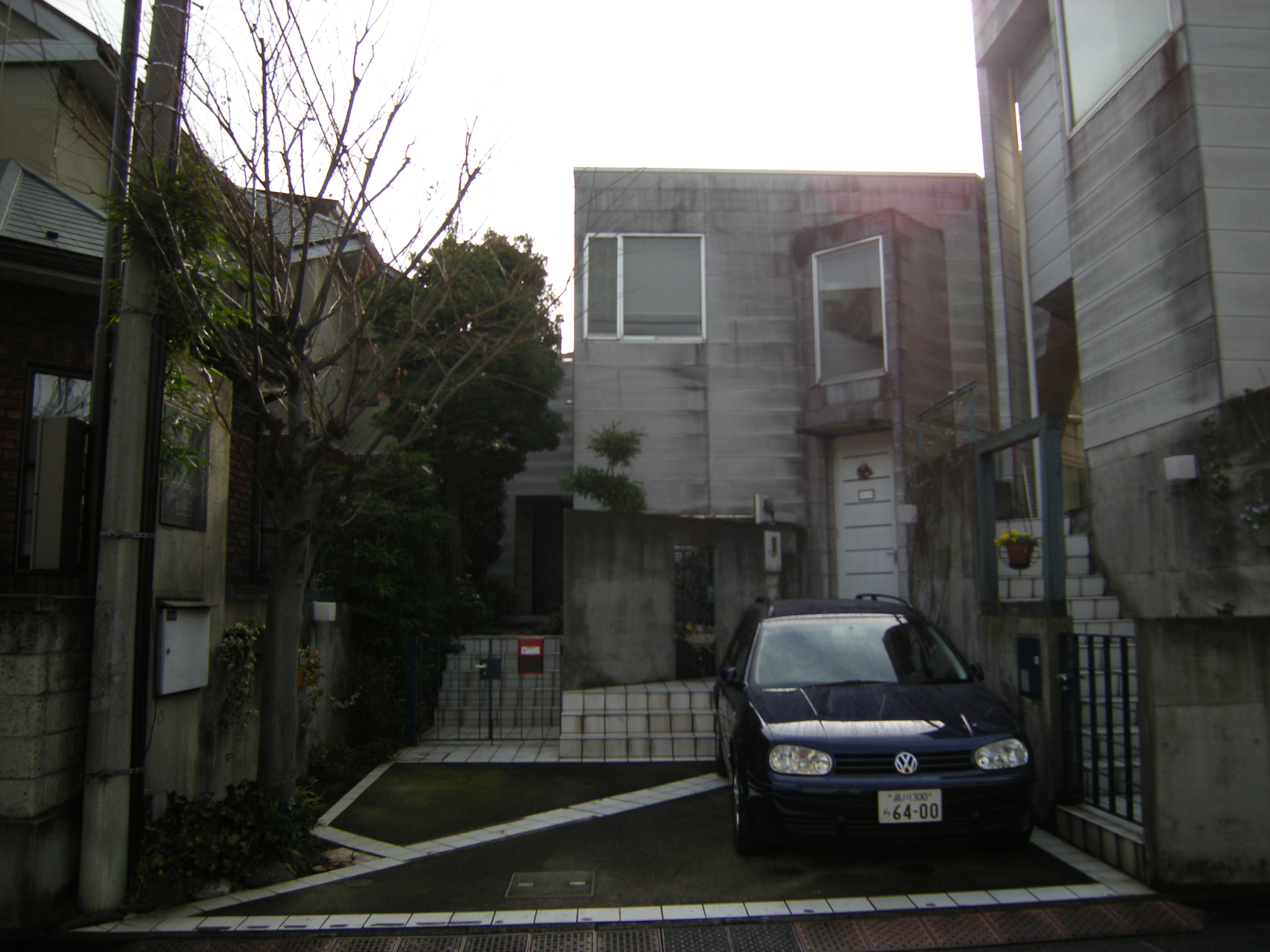 두 건물 사이의 외부통로는 현관에서 정원으로 슬쩍슬쩍 보일 수 있도록 비스듬하게 계획했는데 그것이 평면계획상의 제약이 되버려, 개실이나 물을 사용하는 실이나 설비등을 계획하는데 꽤나 힘들었다.